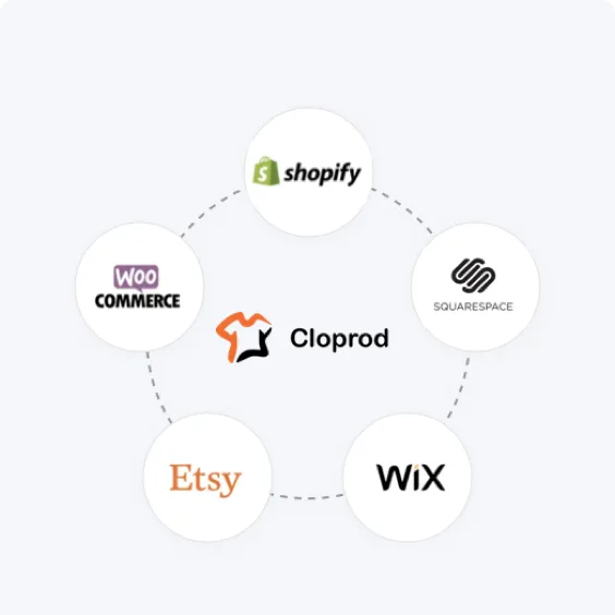 With Cloprod, you can sell your custom apparel on leading platforms and marketplaces, including Shopify, Etsy, Squarespace, Wix, and more.