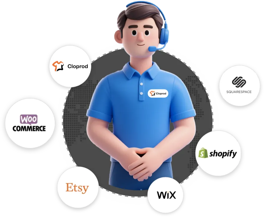 Cloprod integrates with leading eCommerce platforms, letting you sell custom apparel easily.