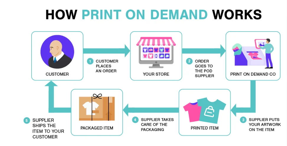 In the print-on-demand model, the merchant receives the order and passes it on to the supplier. The supplier takes care of the printing, packaging, and shipping, and the merchant doesn't have to deal with inventory and shipping.