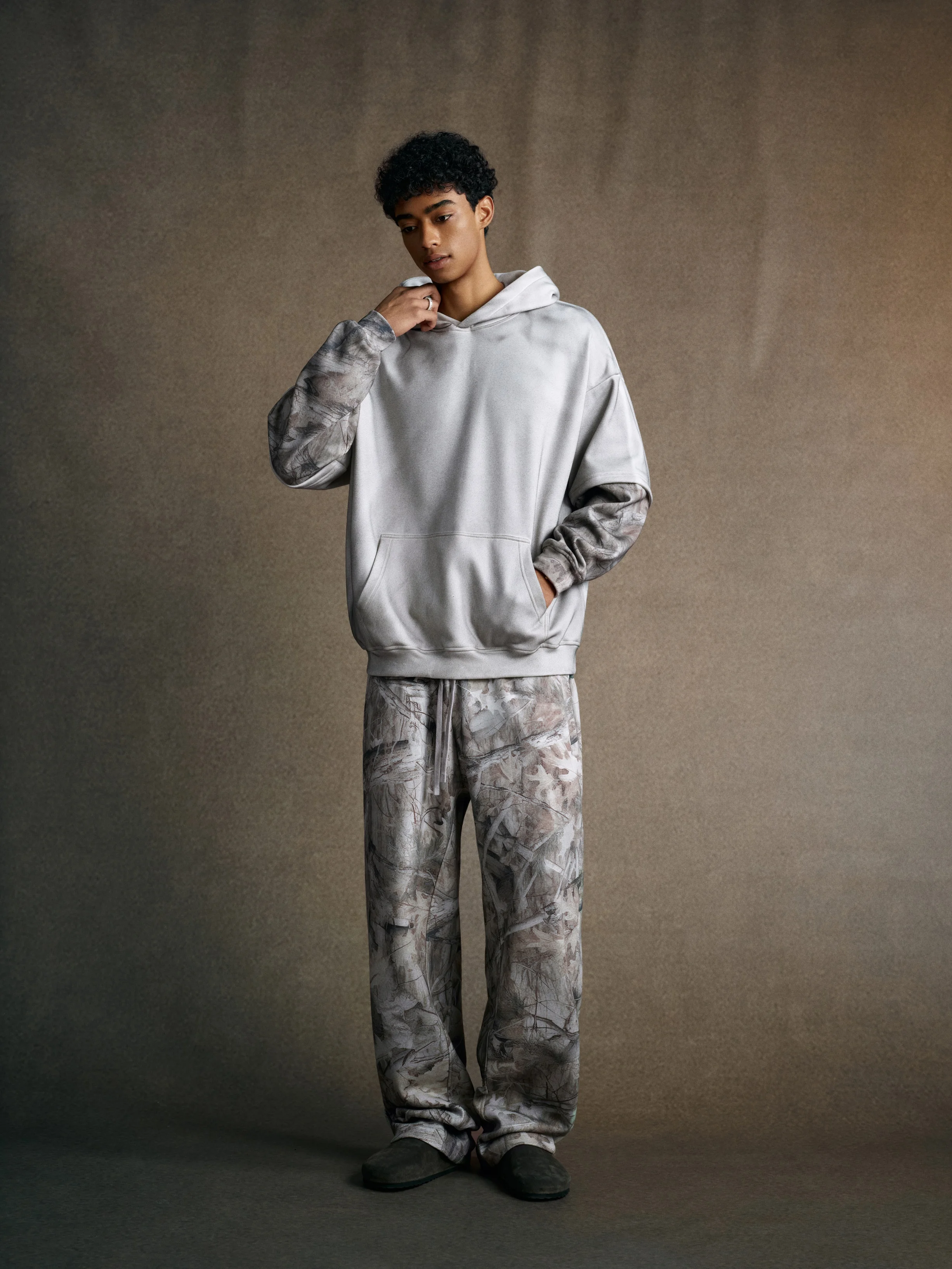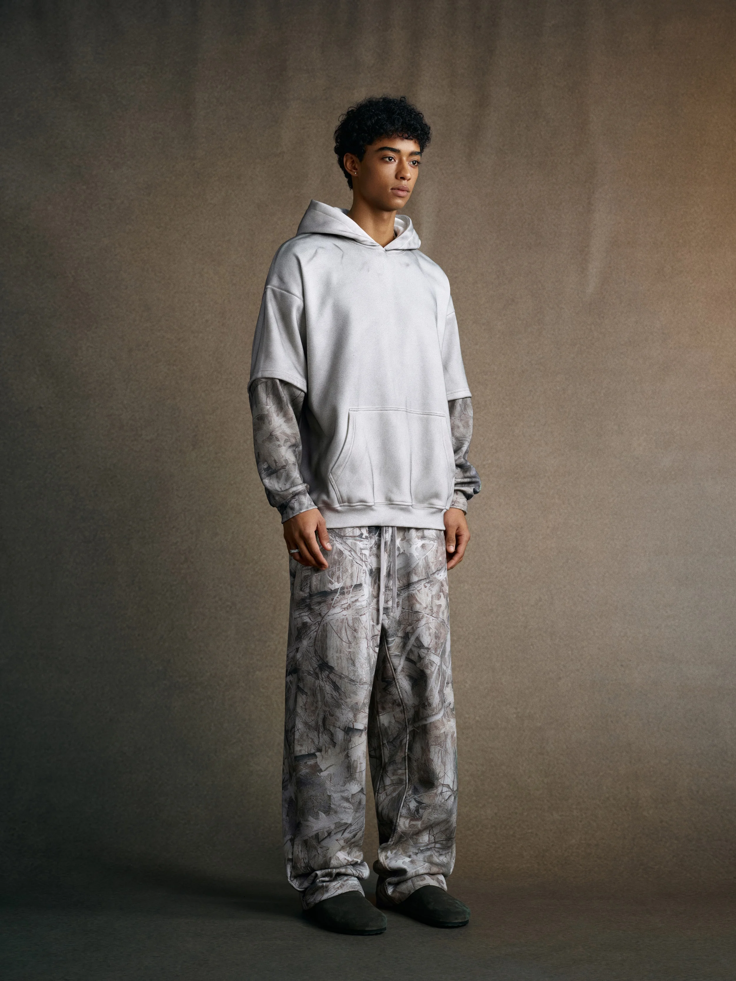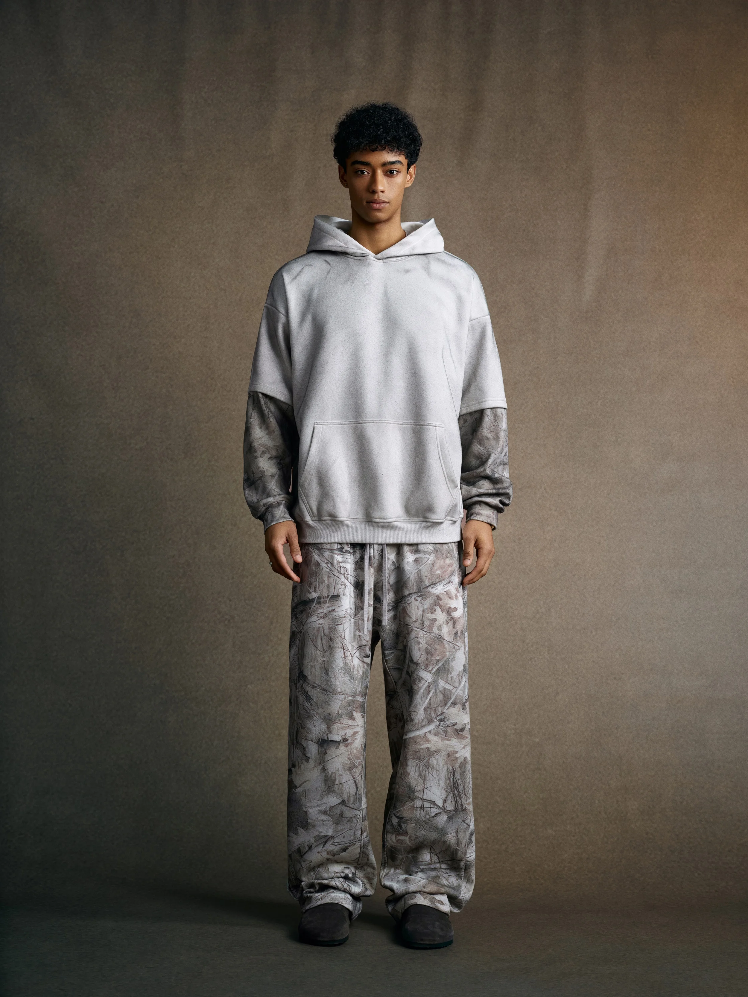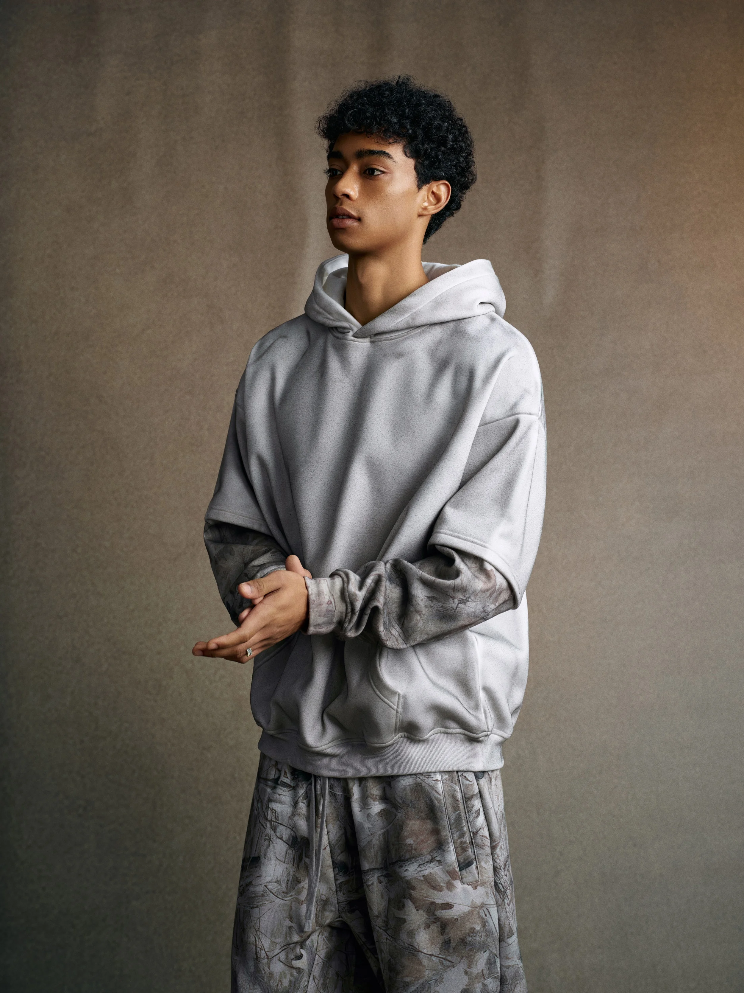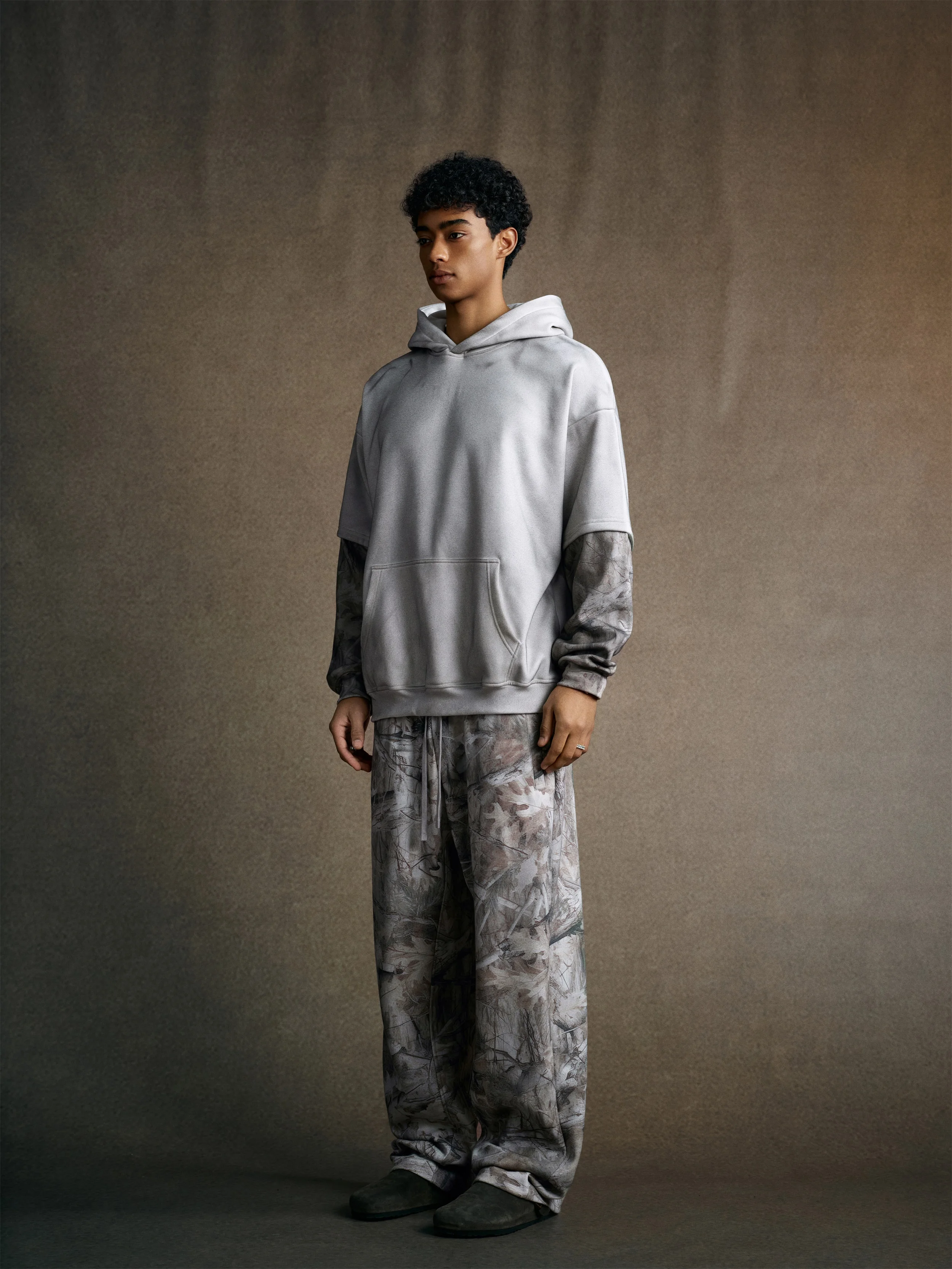 340GSM Men’s Hooded Sweatshirt with Faux-Two-Piece Heat-Transfer Desert Camo Panel