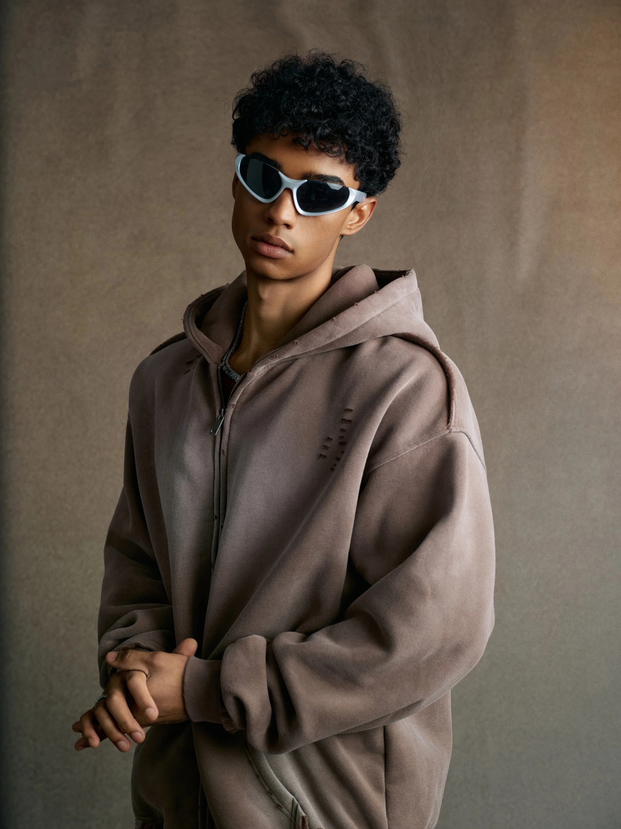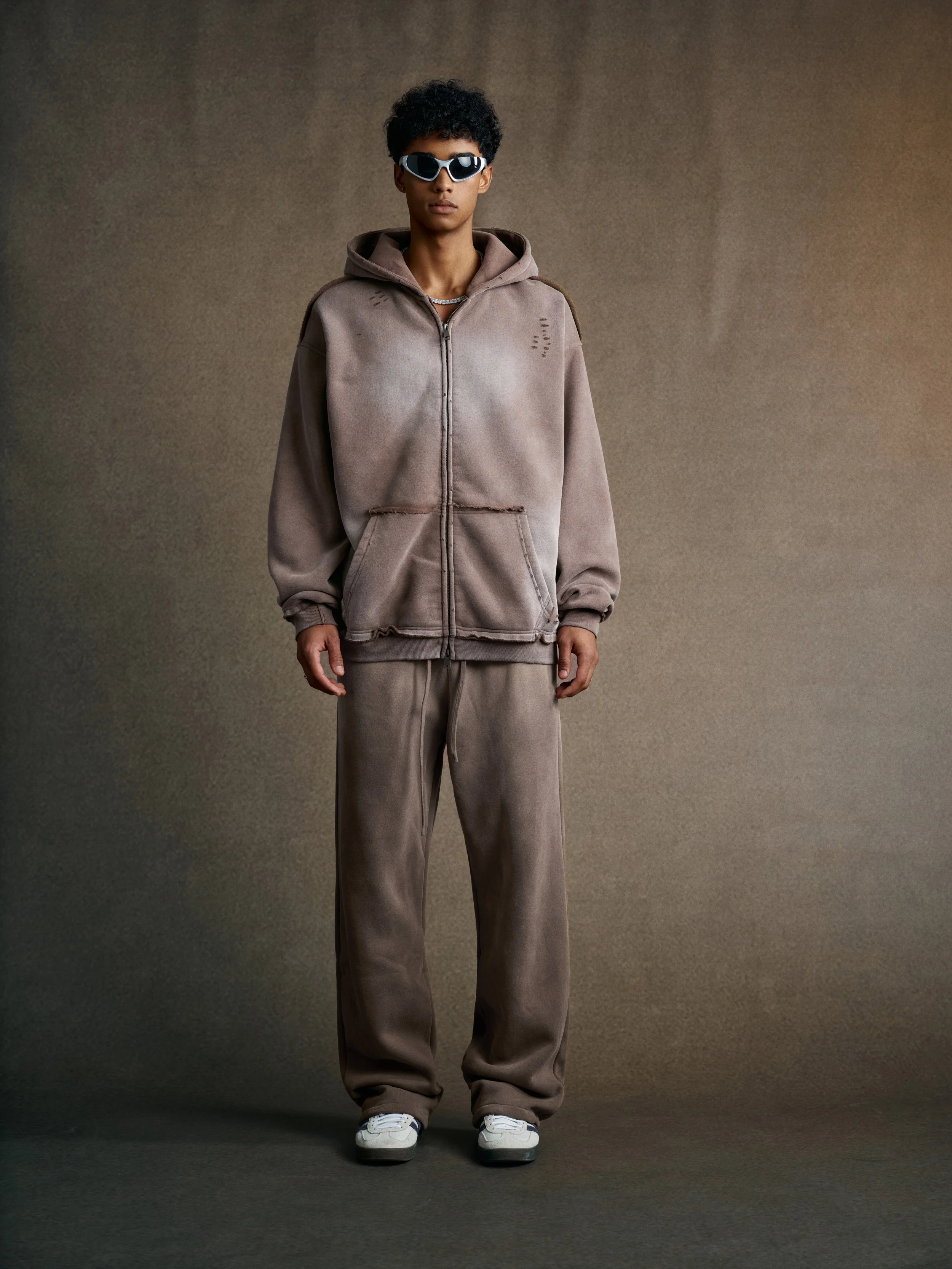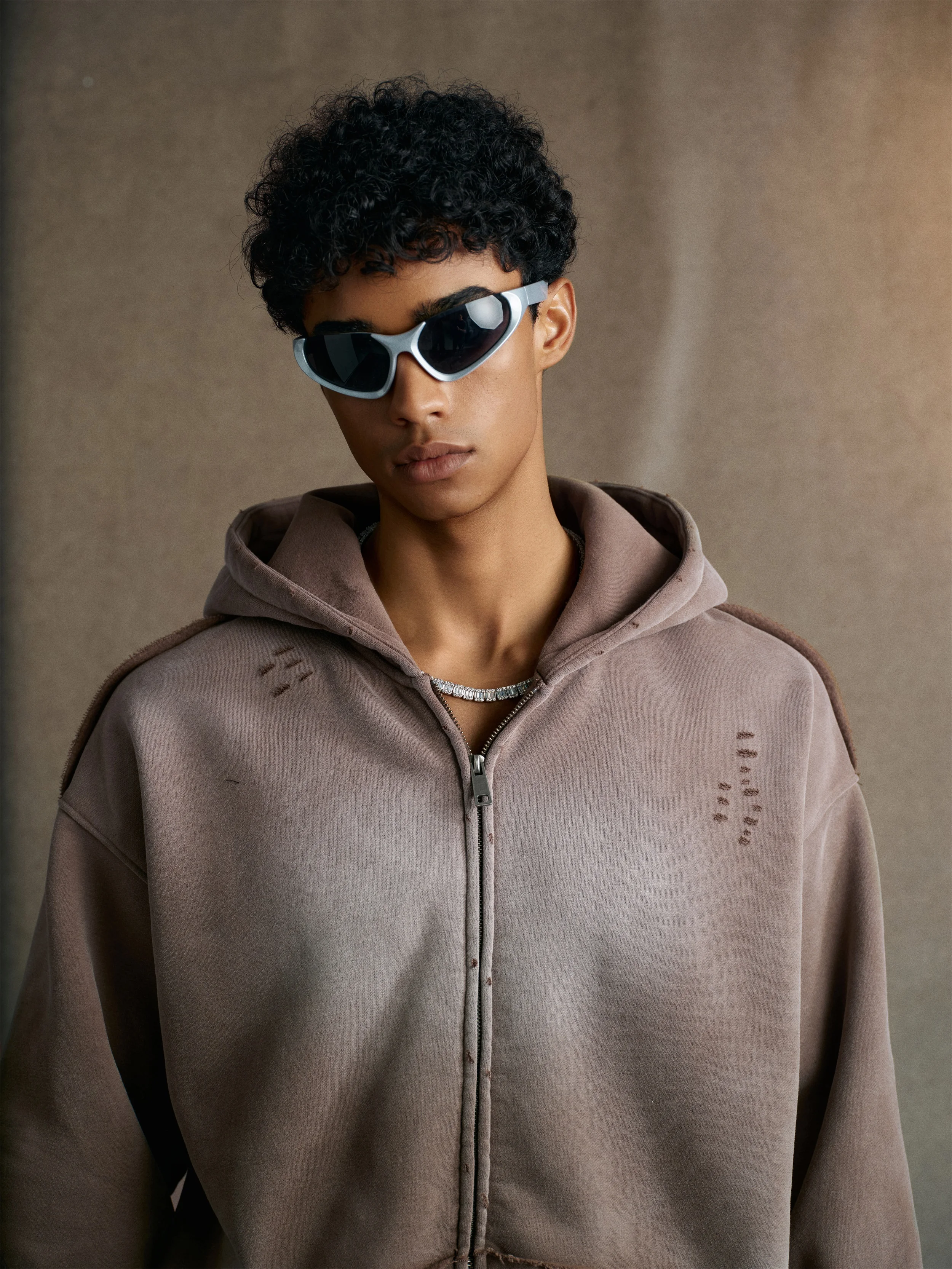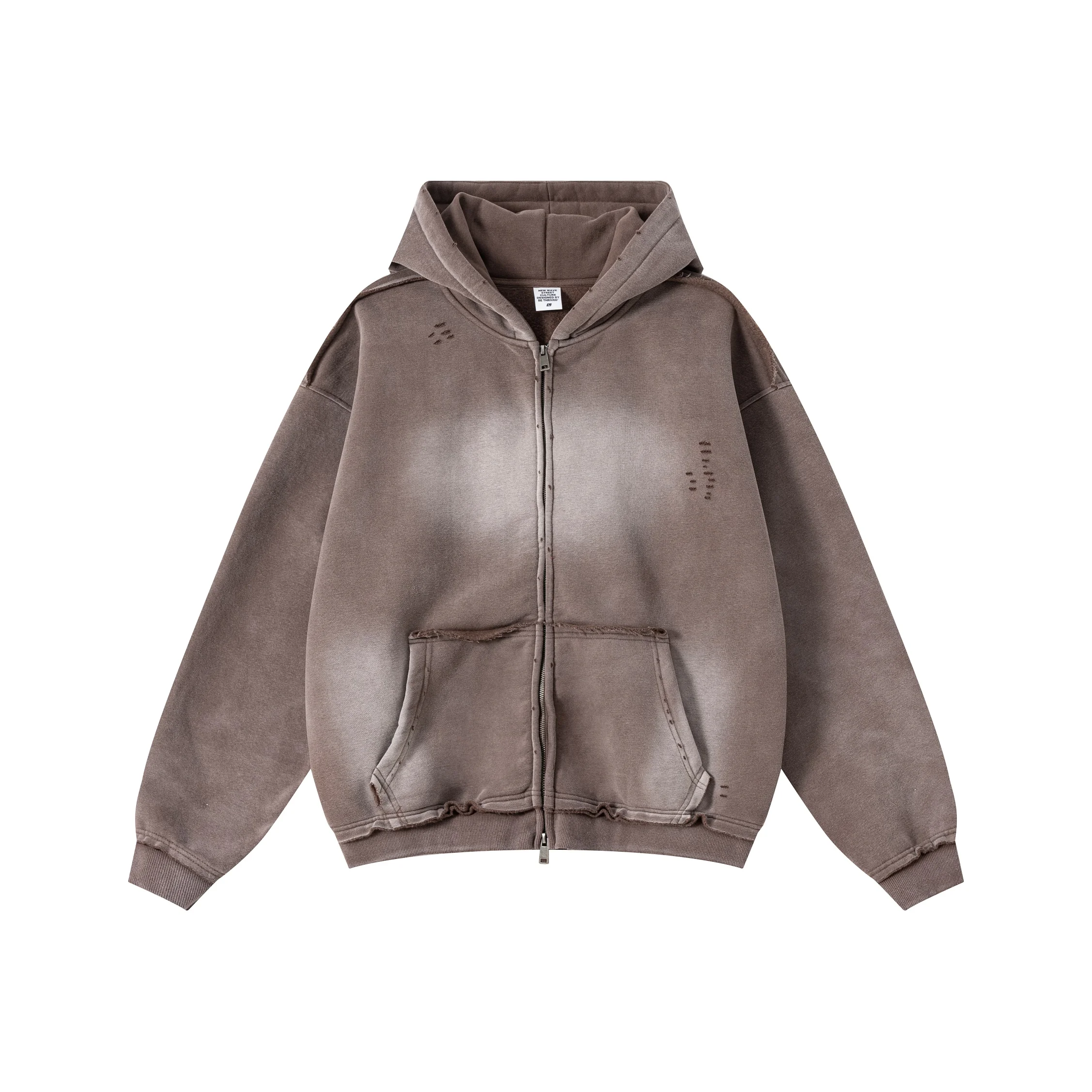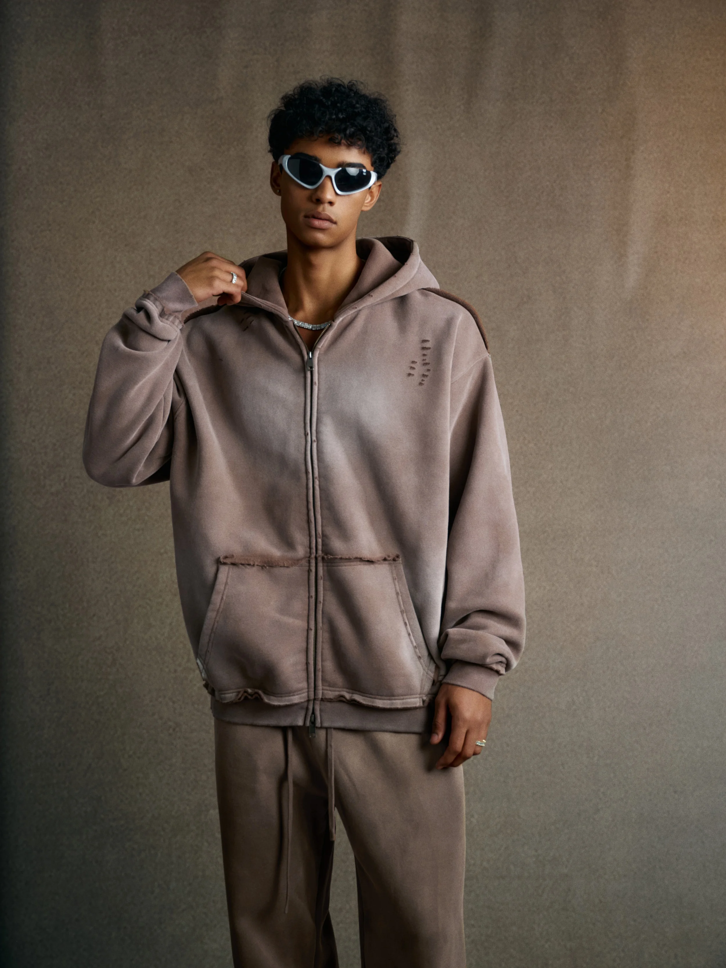 400GSM Men’s Distressed Snow-Wash Raw-Edge Zip-Up Hoodie