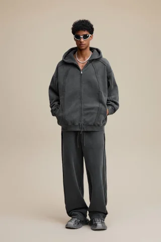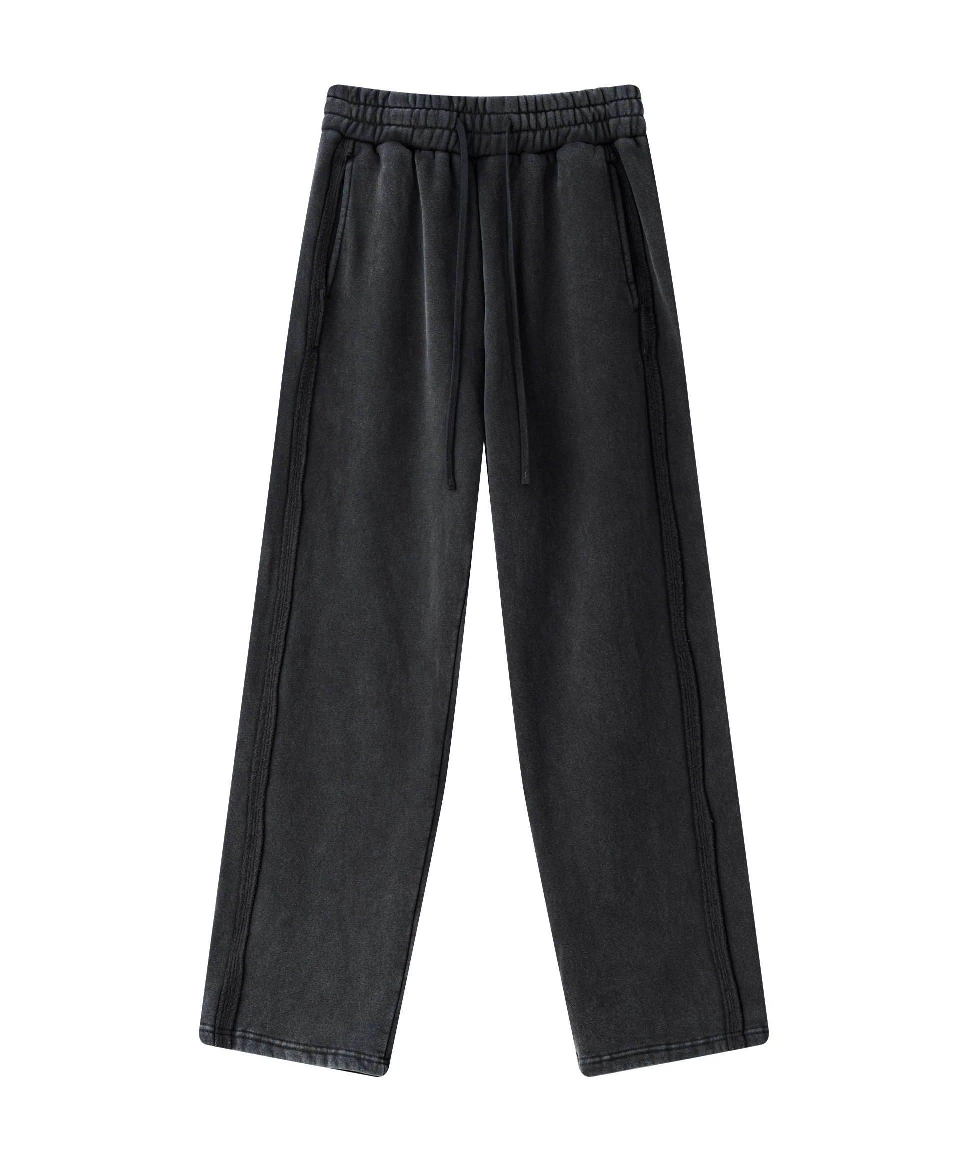 Made with 360GSM brushed fleece fabric featuring warm skin thermoregulation technology for fast heat retention and long lasting warmth. The inner fleece lining delivers soft hand feel while maintaining a structured, durable surface that resists fading after repeated washing. Snow wash finish creates a naturally mottled vintage effect with soft frosted tones, enhancing the retro aesthetic. Designed in an American relaxed straight fit for comfort and ease of movement, suitable for casual wear, outdoor activities, and sport inspired styling. Raw edge construction adds a deconstructed workwear feel, reinforcing the West Coast vintage streetwear identity. Ideal for customers seeking functional warmth combined with American retro and outdoor casual appeal.