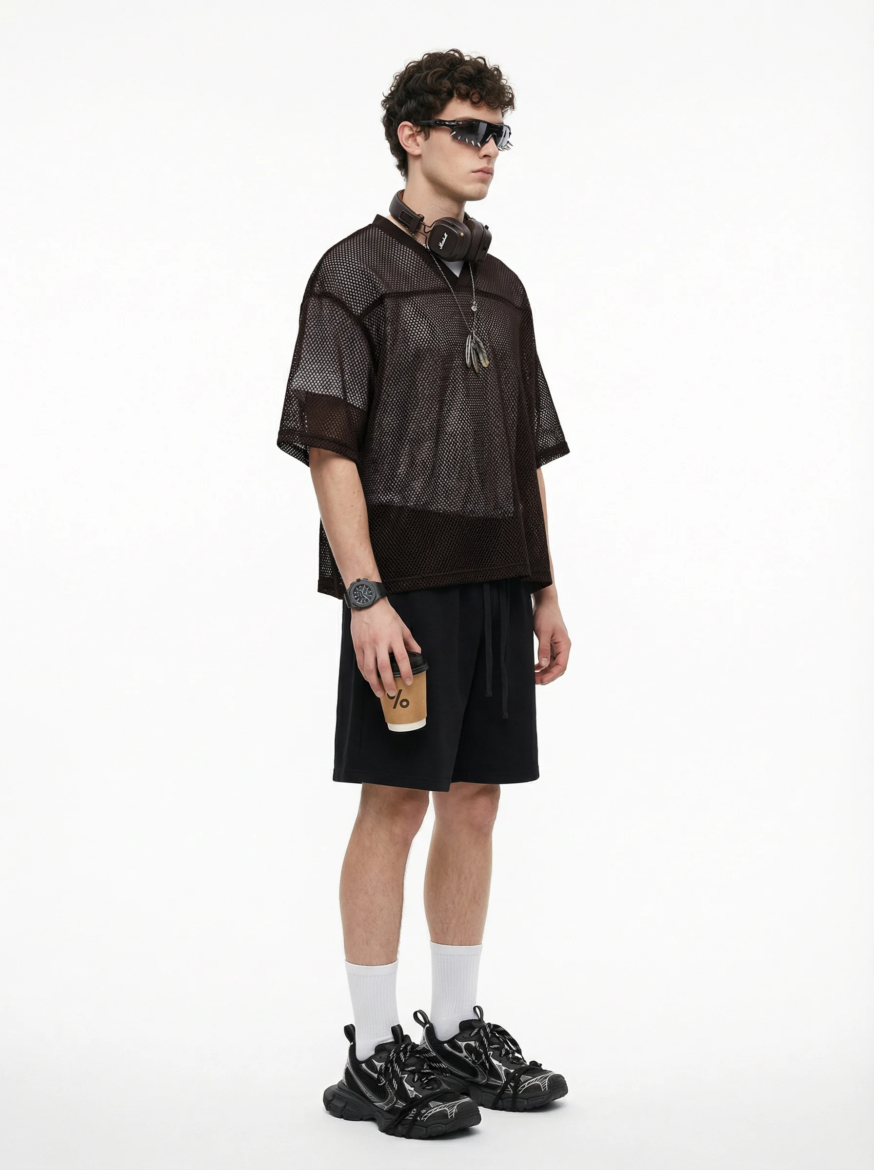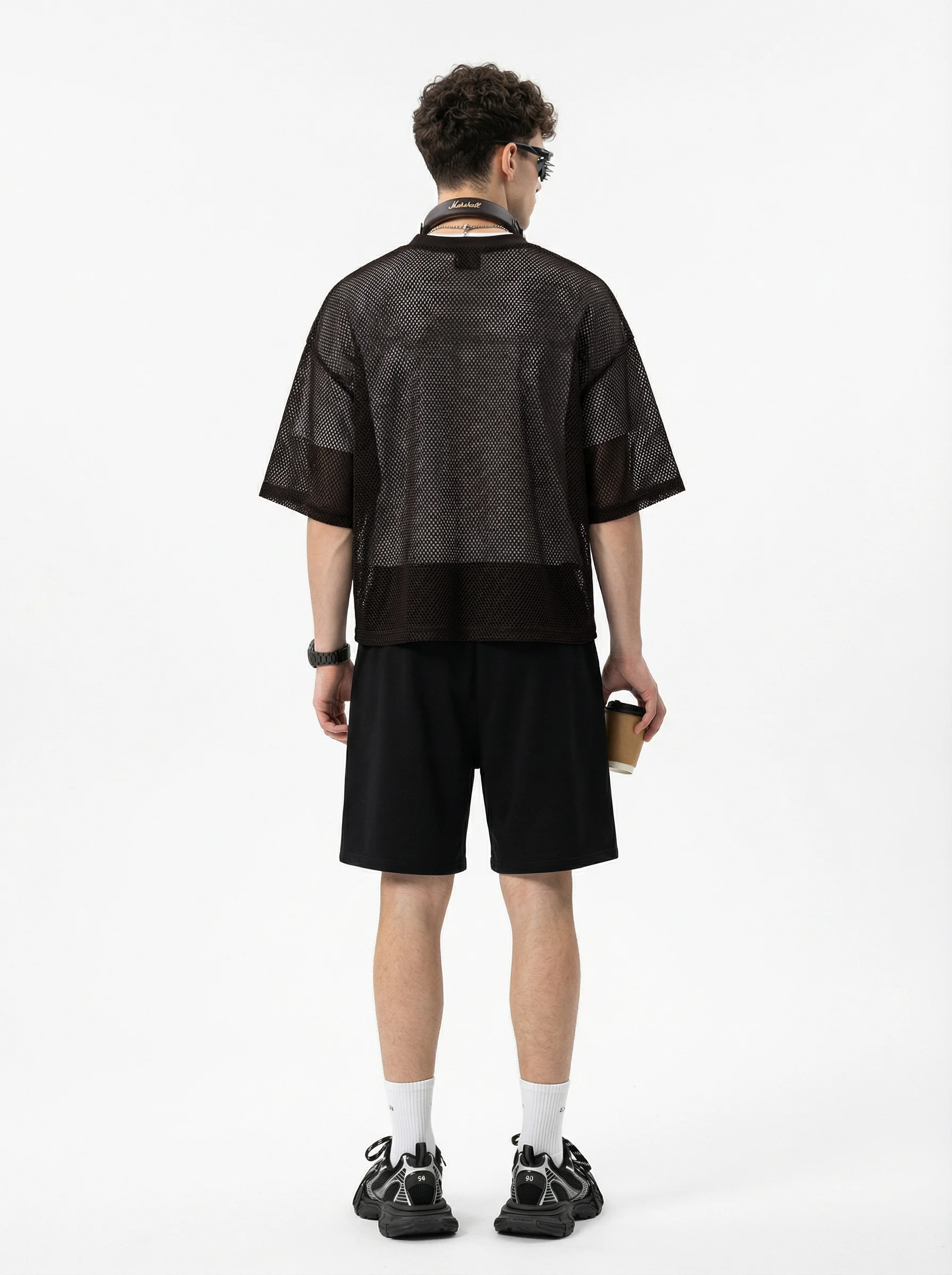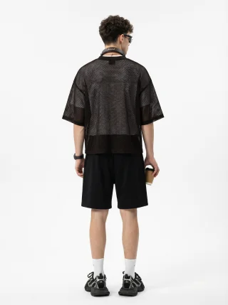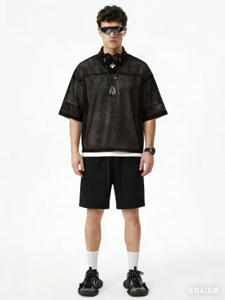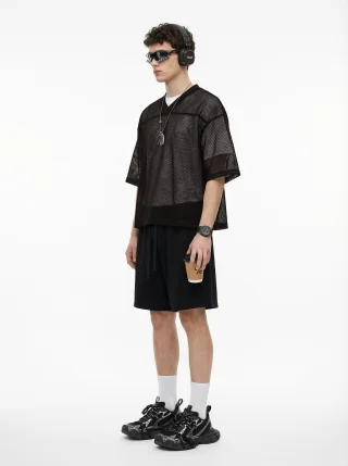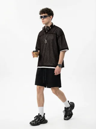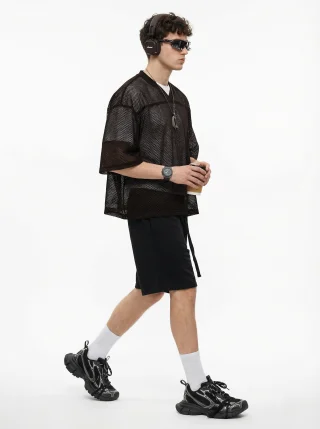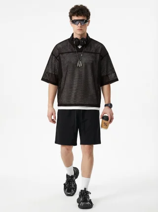 Crafted from high-density mesh fabric, this 240GSM men’s T-shirt offers superior breathability and quick moisture-wicking, perfect for layering in summer. The boxy, slightly loose fit flatters various body types, while the textured mesh adds dimension to your look. With a clean shoulder seam, neat cuffs, and an optimized ribbed collar that doesn’t lose shape, this T-shirt provides both comfort and style. The front-short-back-long design adds versatility, making it ideal for streetwear or casual layering. Perfect for 18-35-year-old men who appreciate effortless, functional style with a sporty urban edge.