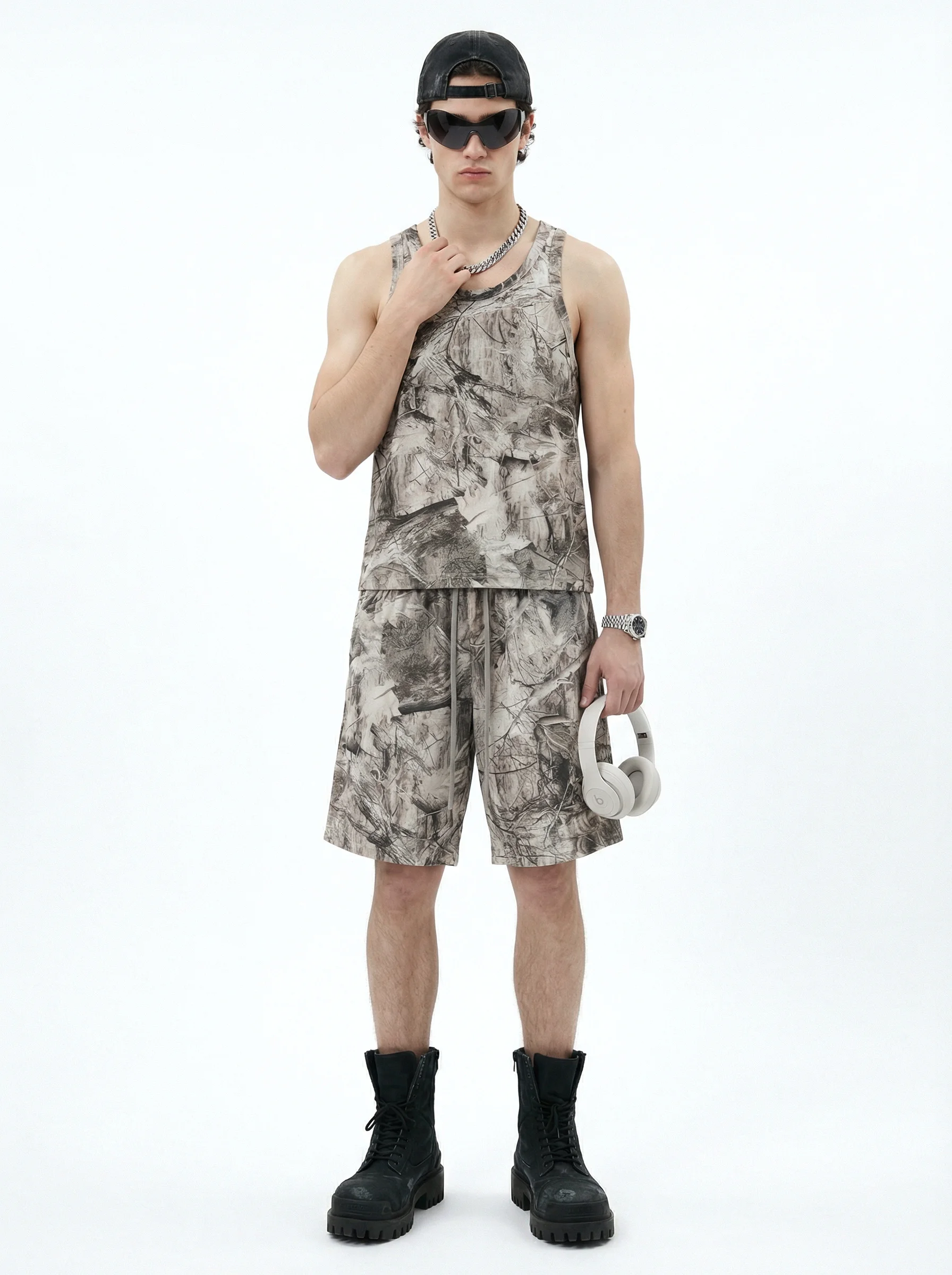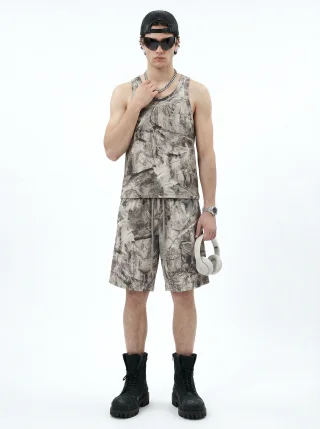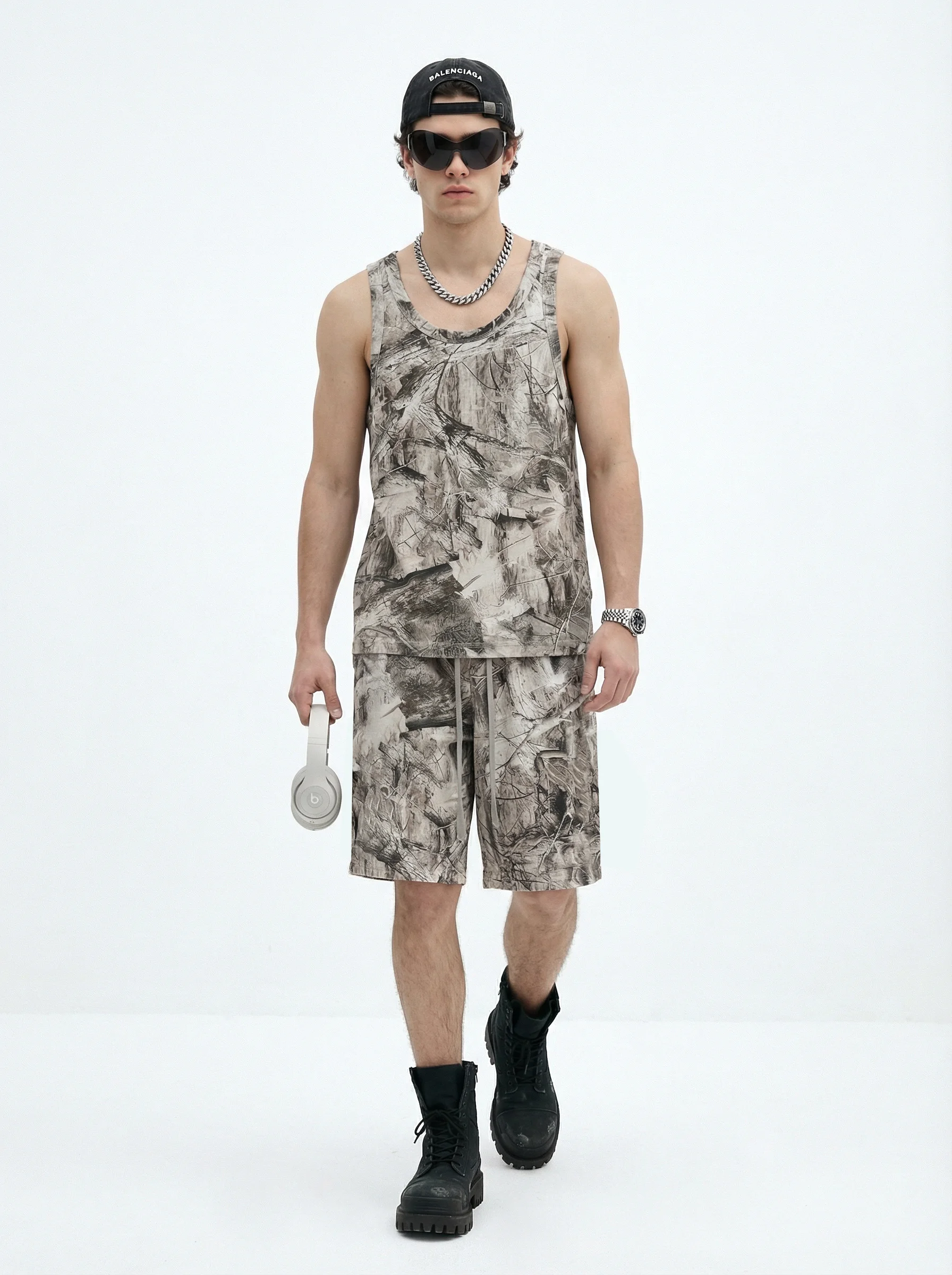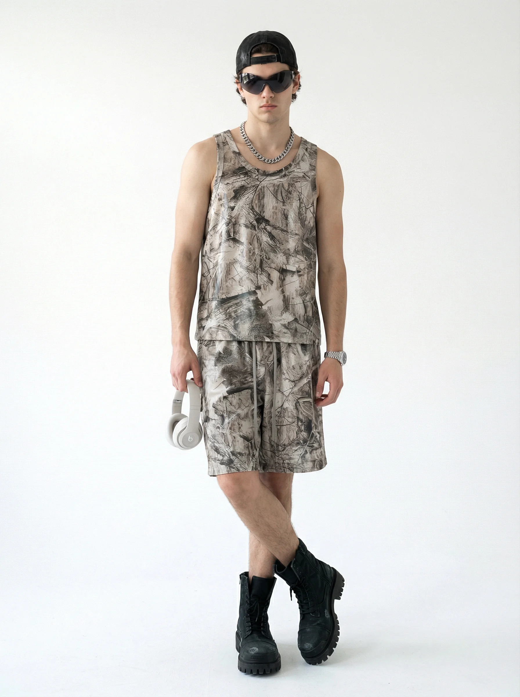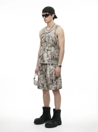 Made with 315GSM stretch rib fabric for strong elasticity, shape retention, and long-lasting color clarity. The fitted racerback cut highlights shoulder and arm lines, delivering a clean and athletic silhouette. Branch camo print enhances a military-inspired street look with sharp, durable heat-transfer detailing. Bound neckline with self-fabric edging ensures durability and comfort without deformation. Designed for active movement and daily styling — sporty, rugged, and easy to layer.