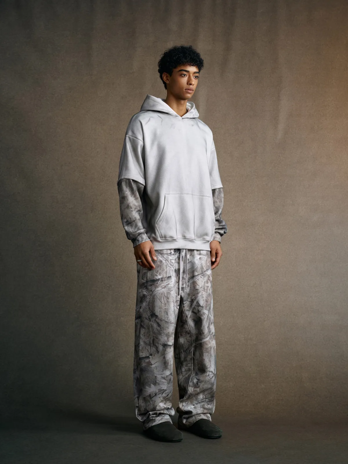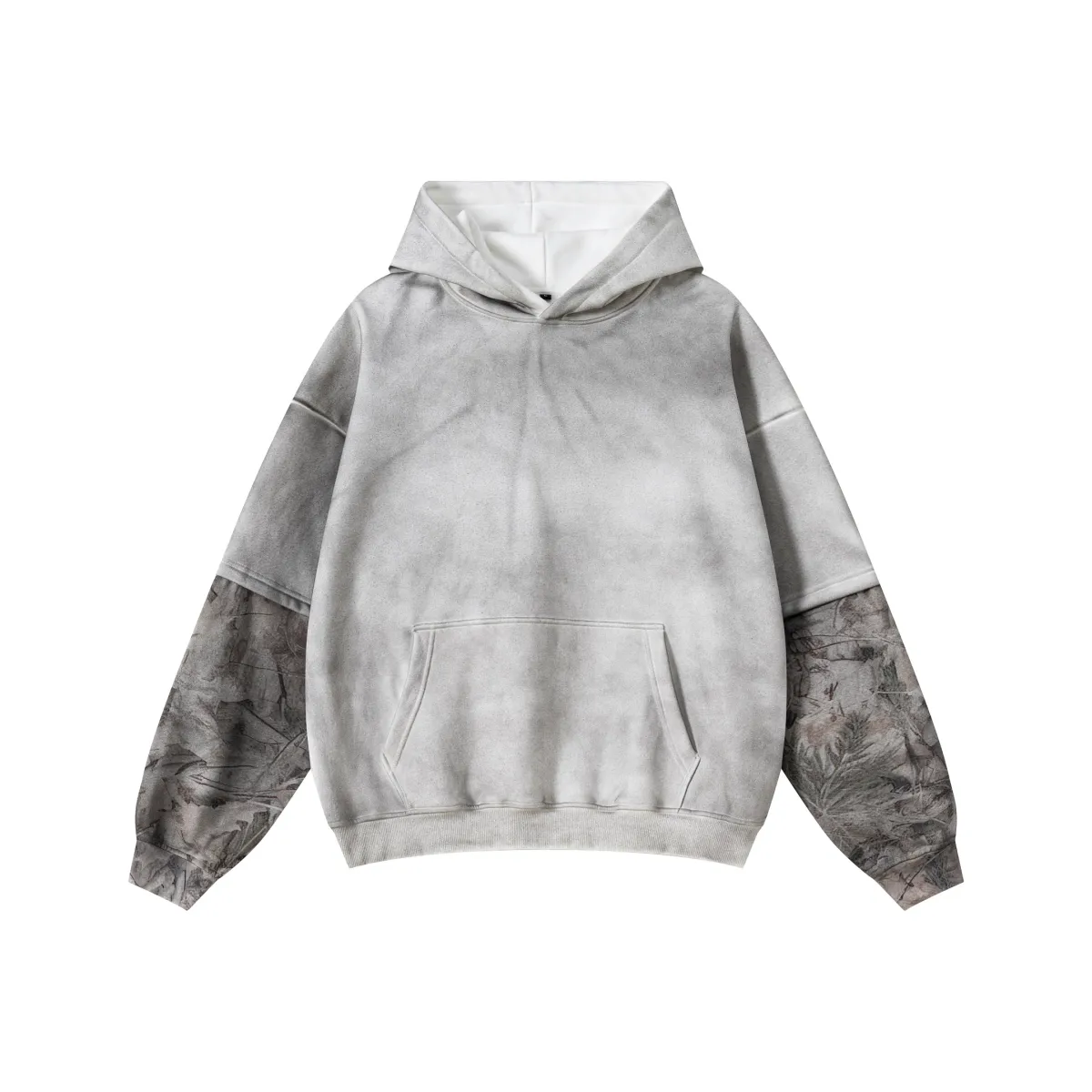 Featuring a layered spliced construction, it mimics a two-piece outfit while maintaining the comfort of a single hoodie — practical, trendy, and eye-catching.