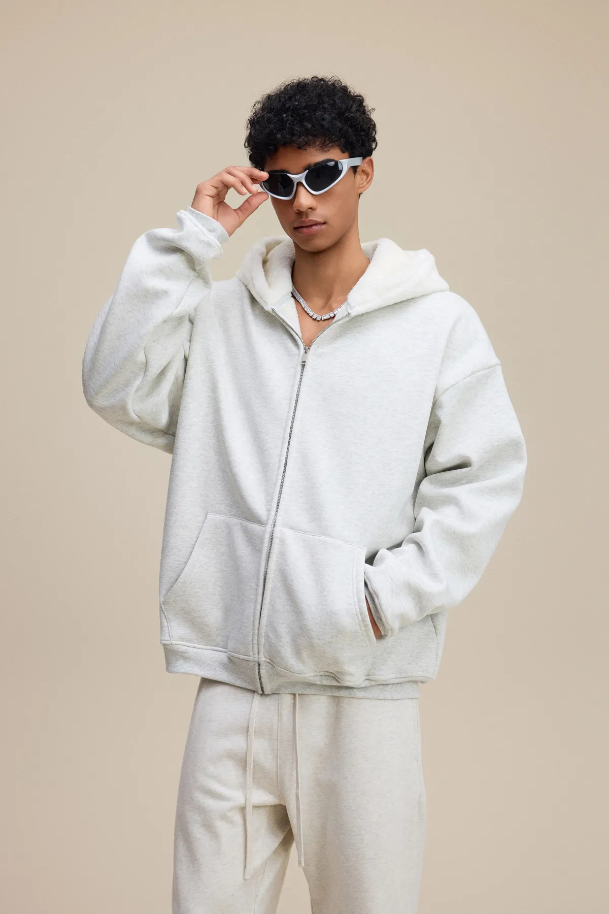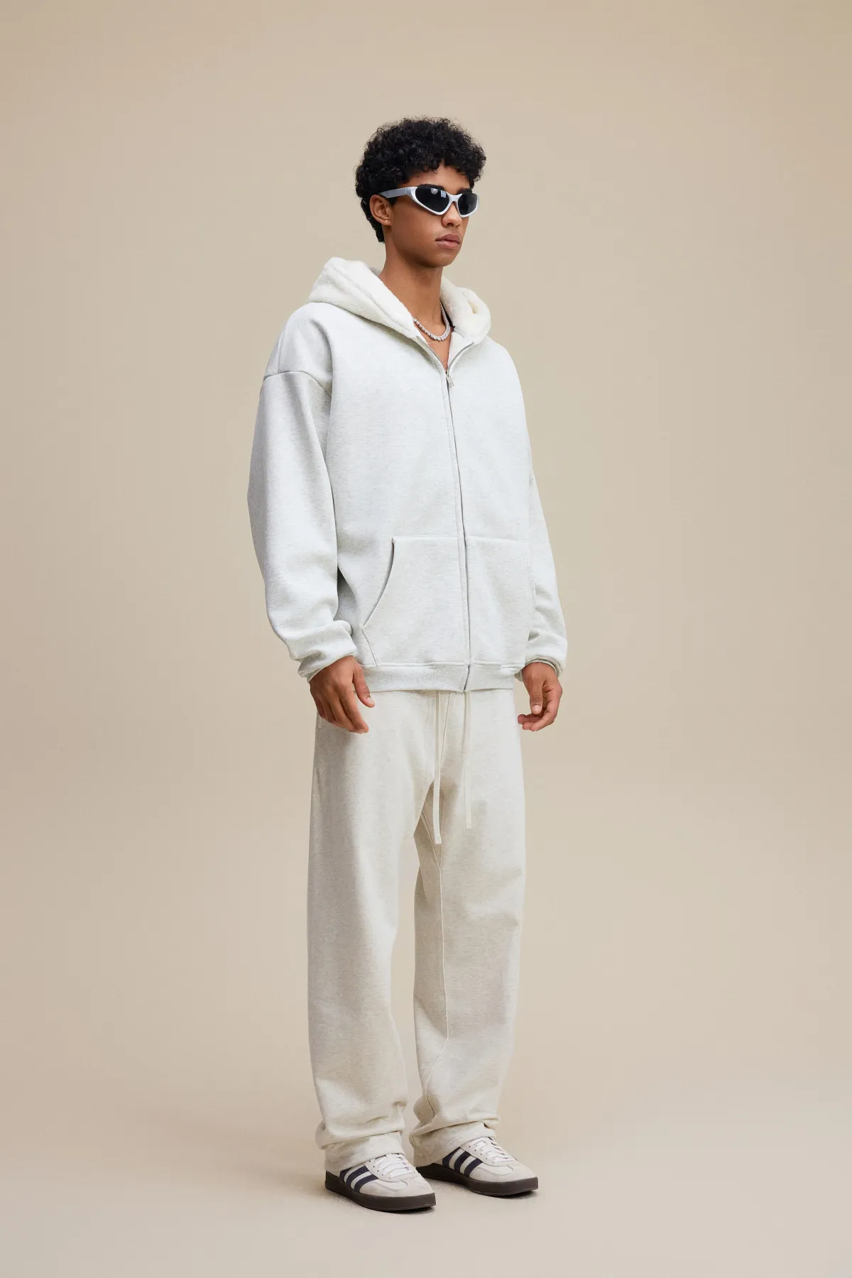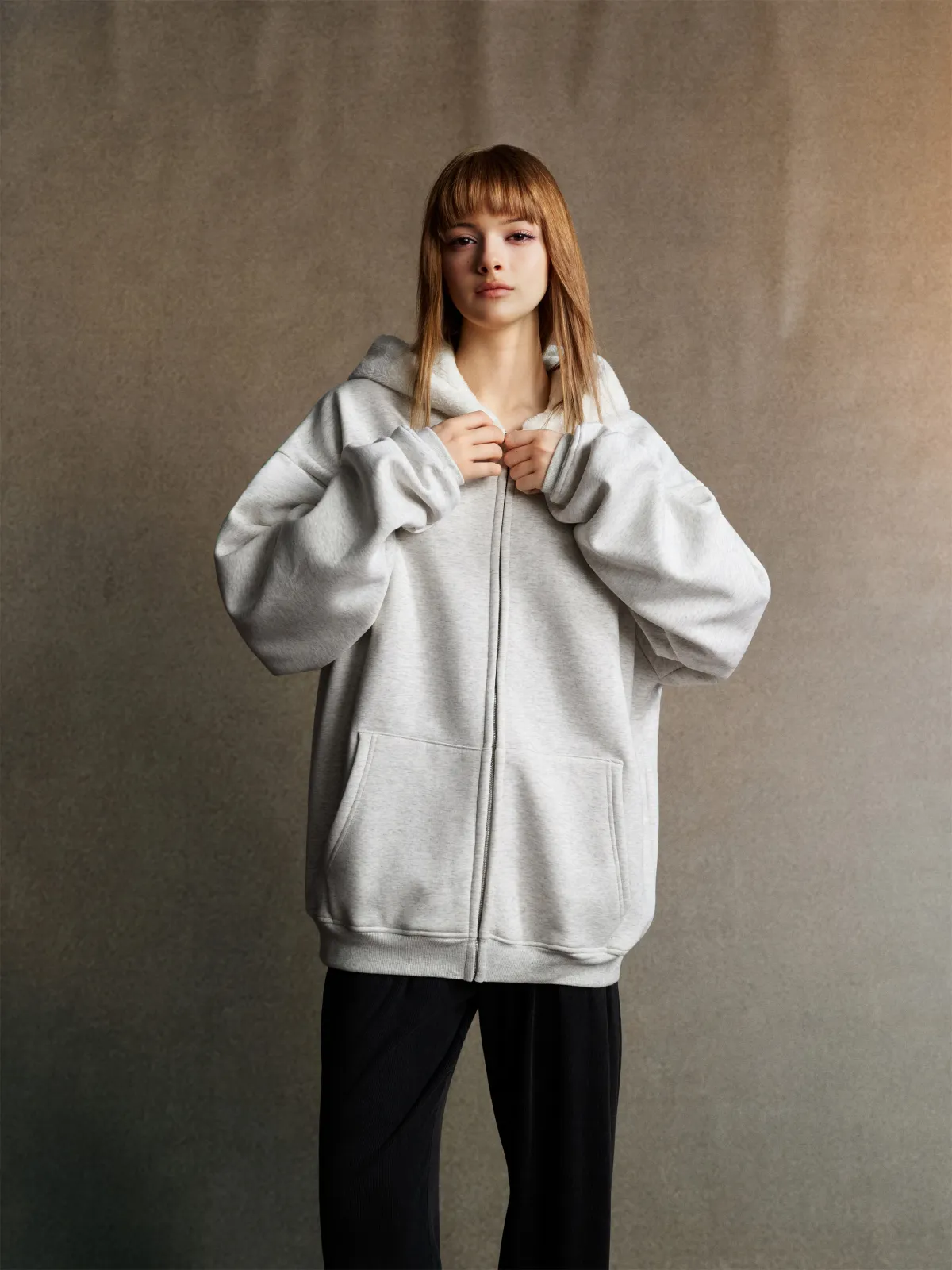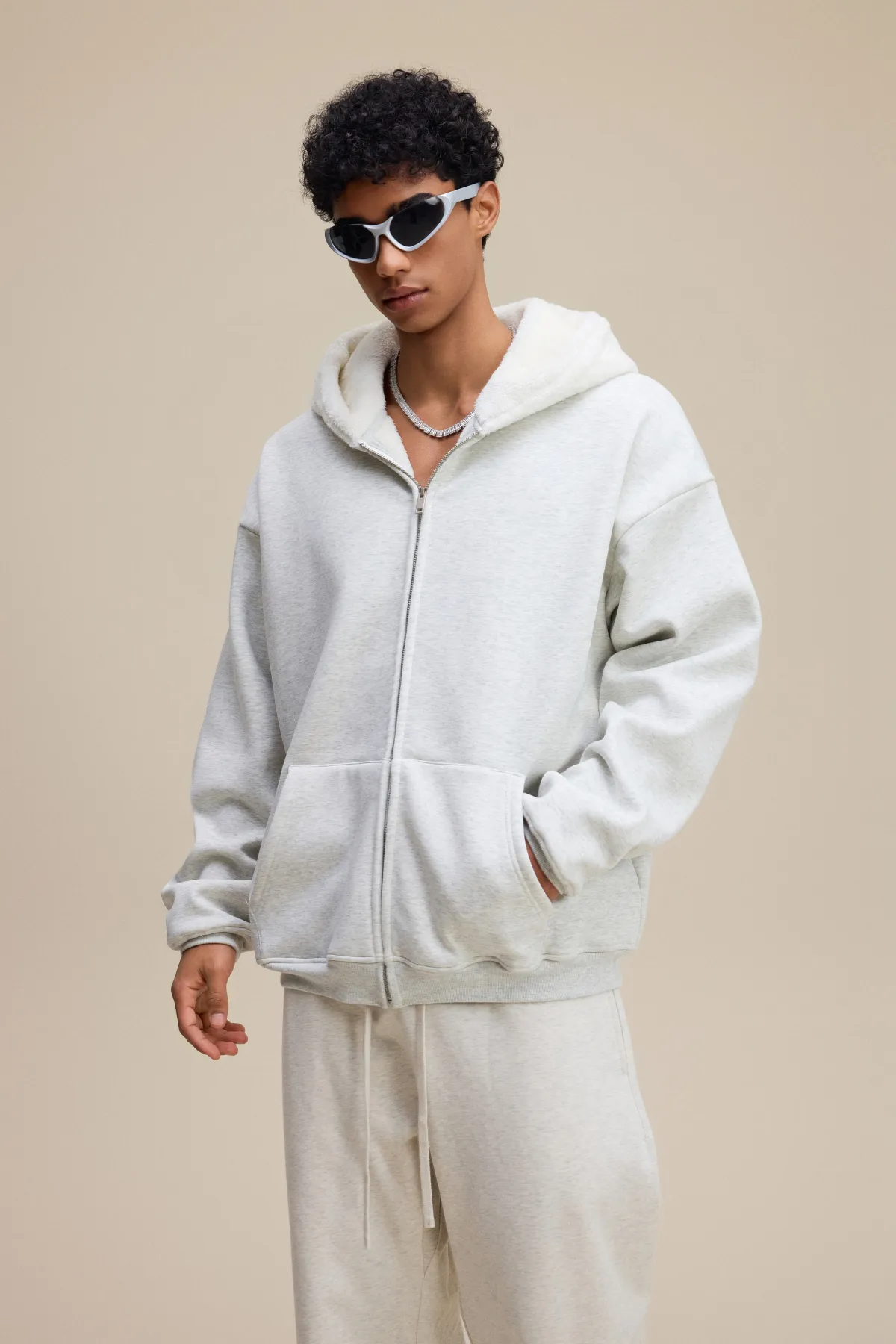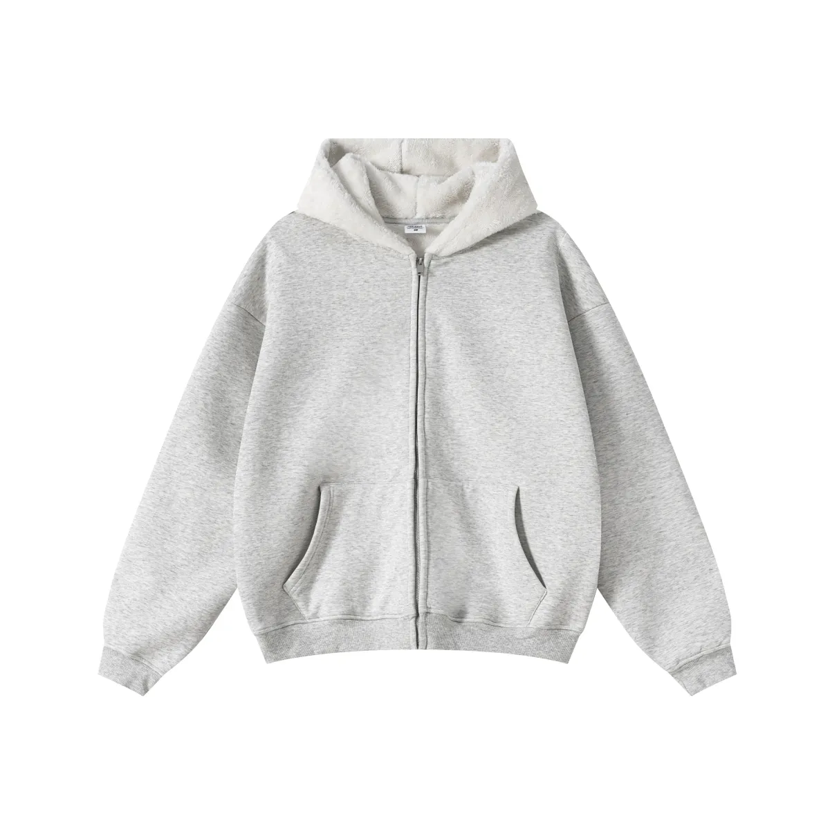 This 570GSM heavyweight zip hoodie delivers premium warmth and structure through its dense cotton shell and fleece-lined interior.