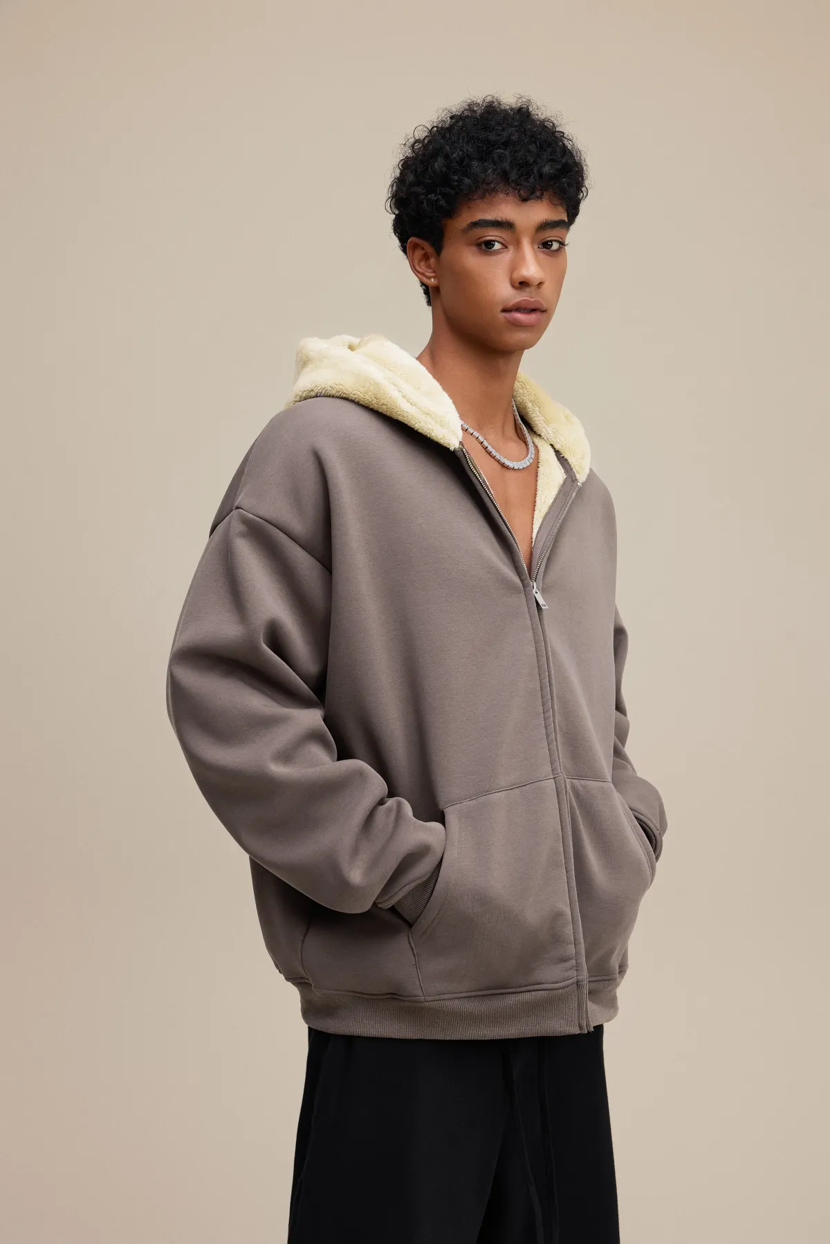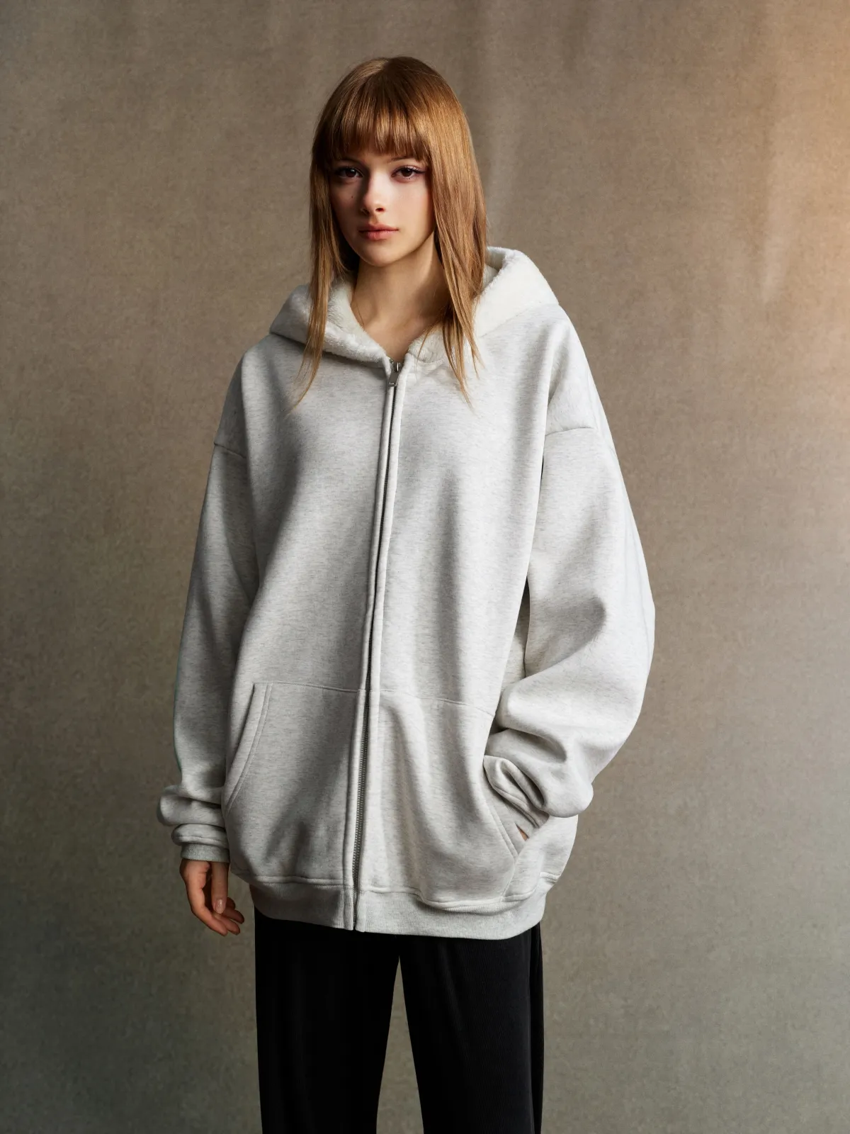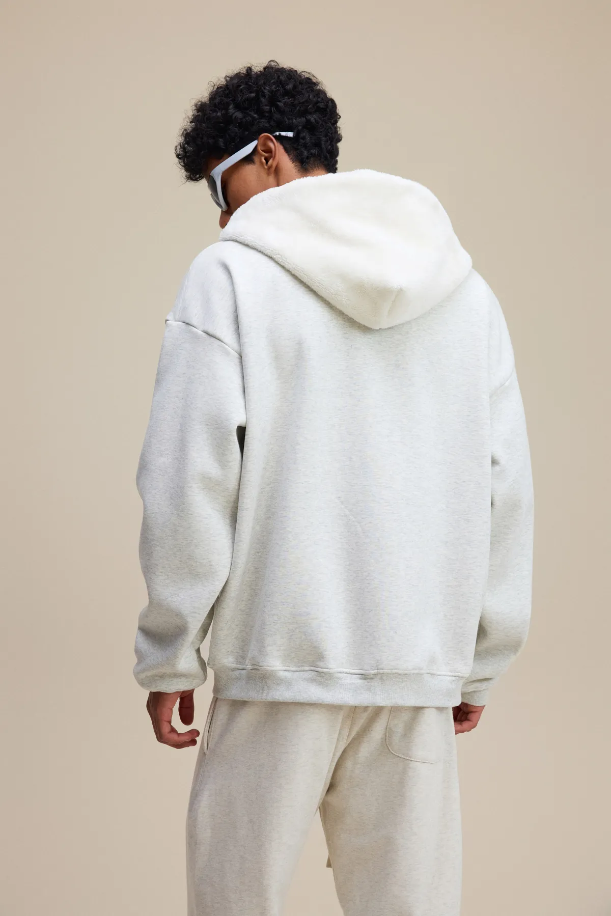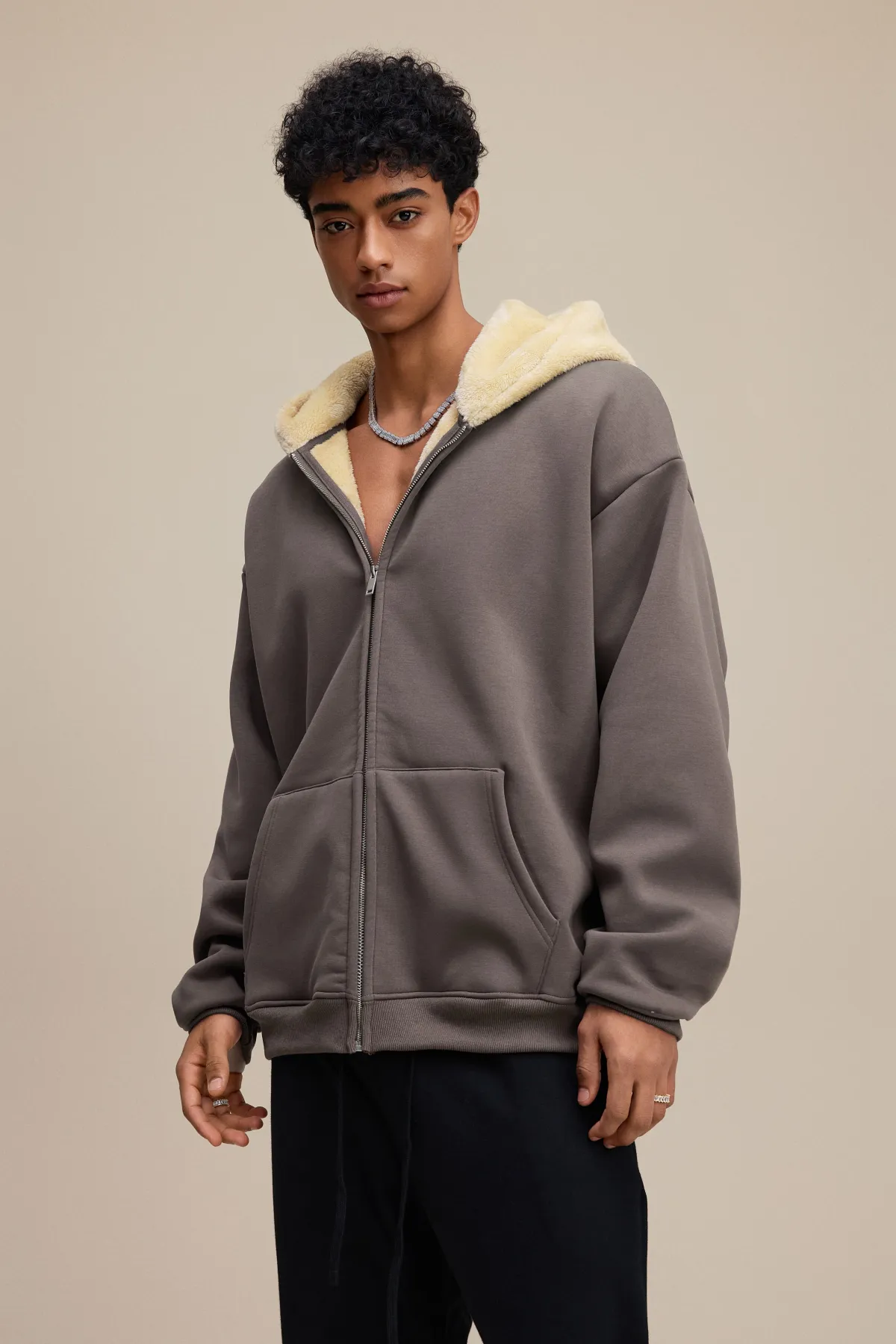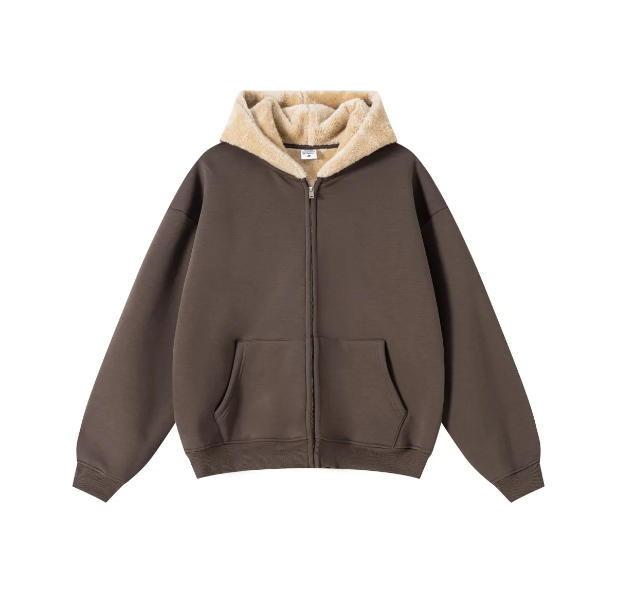 This 570GSM heavyweight zip hoodie delivers premium warmth and structure through its dense cotton shell and fleece-lined interior.