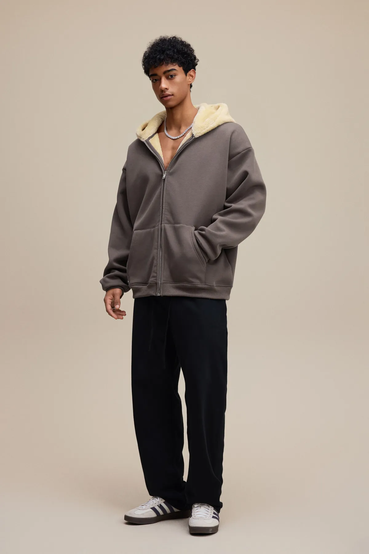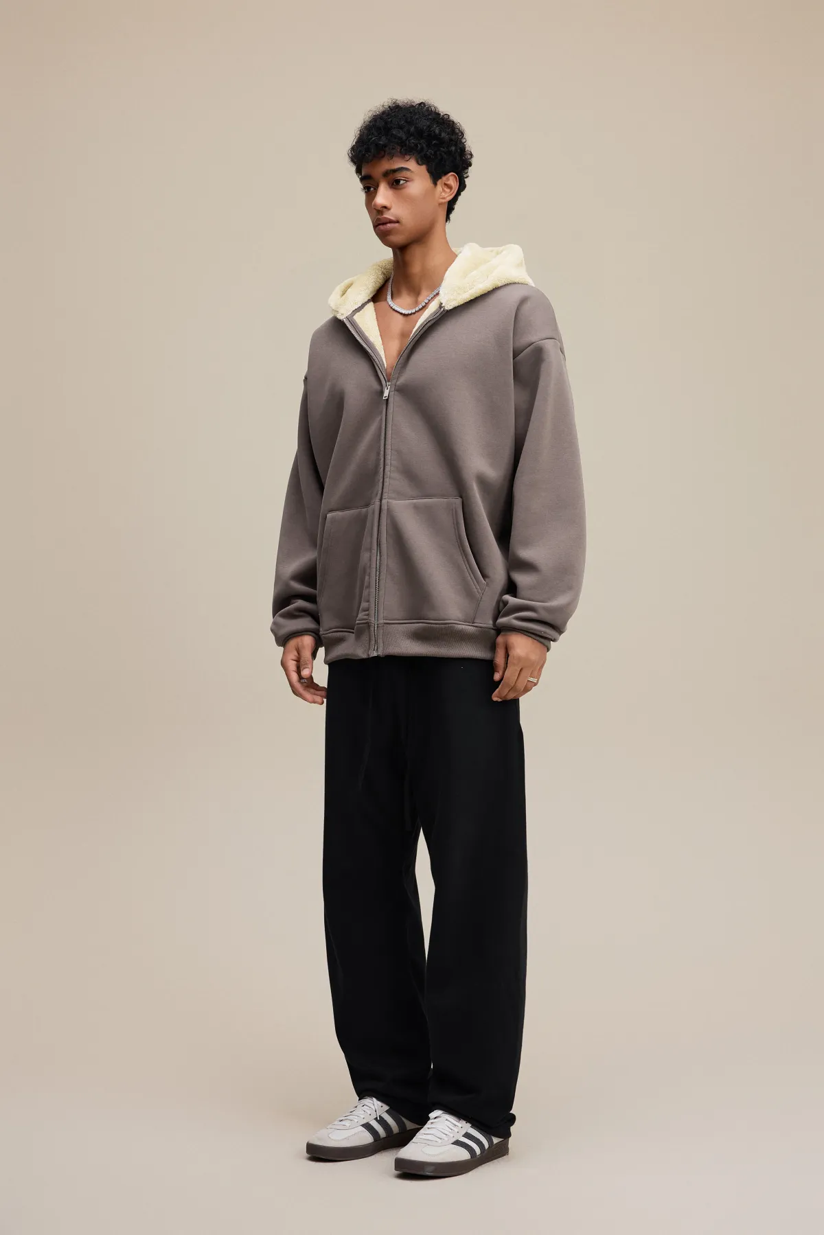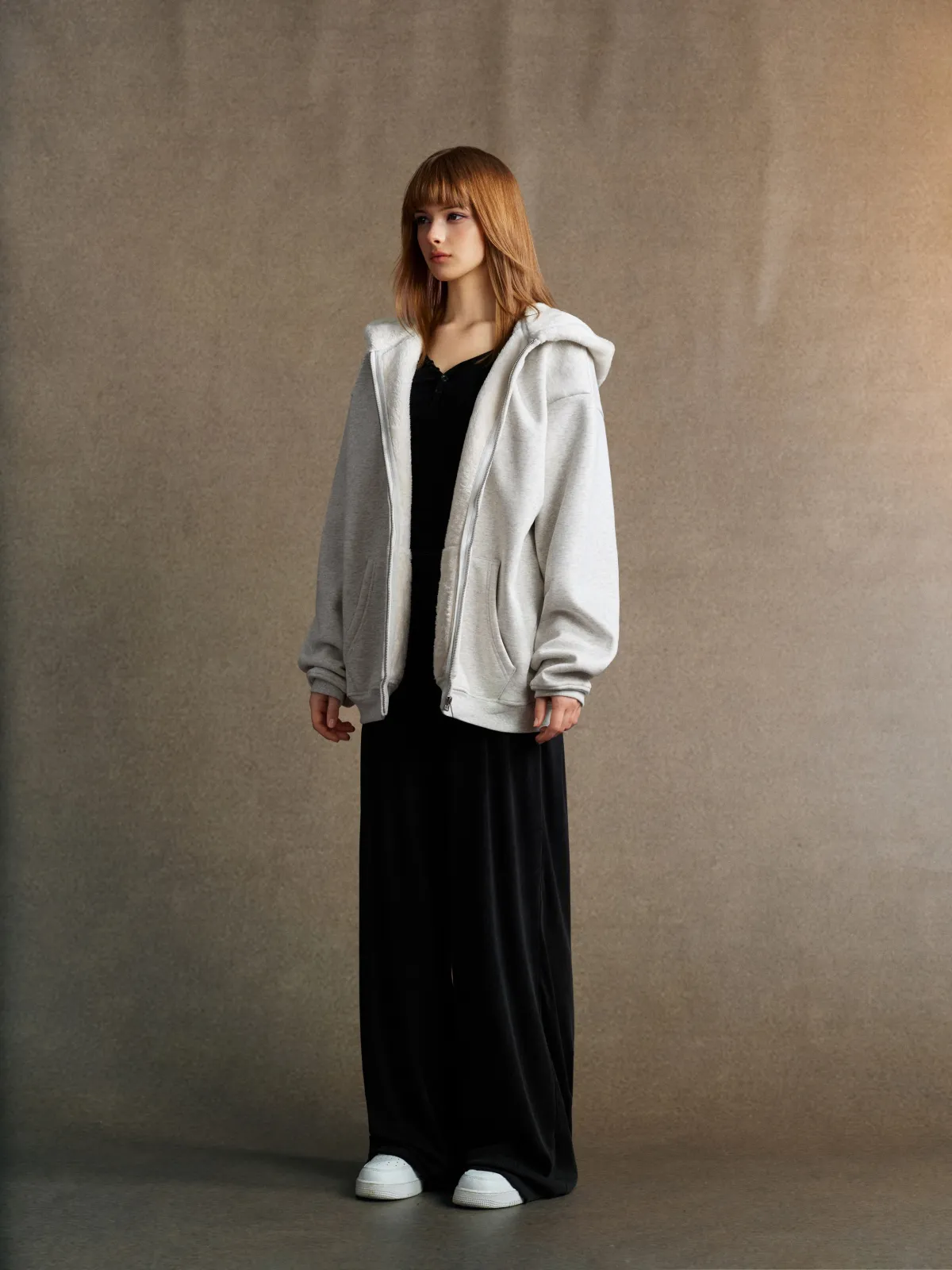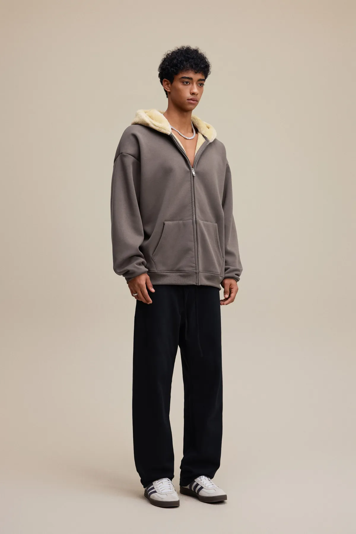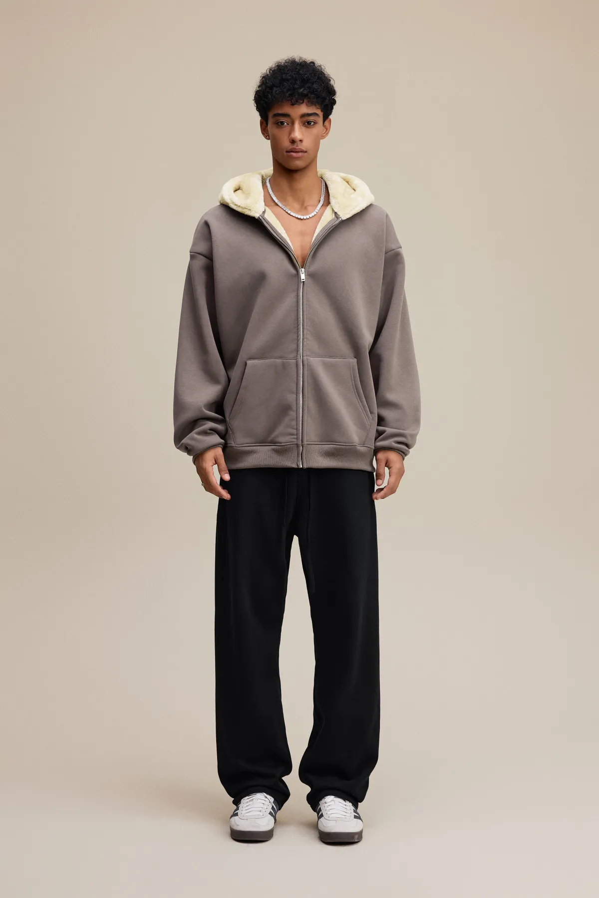This 570GSM heavyweight zip hoodie delivers premium warmth and structure through its dense cotton shell and fleece-lined interior.