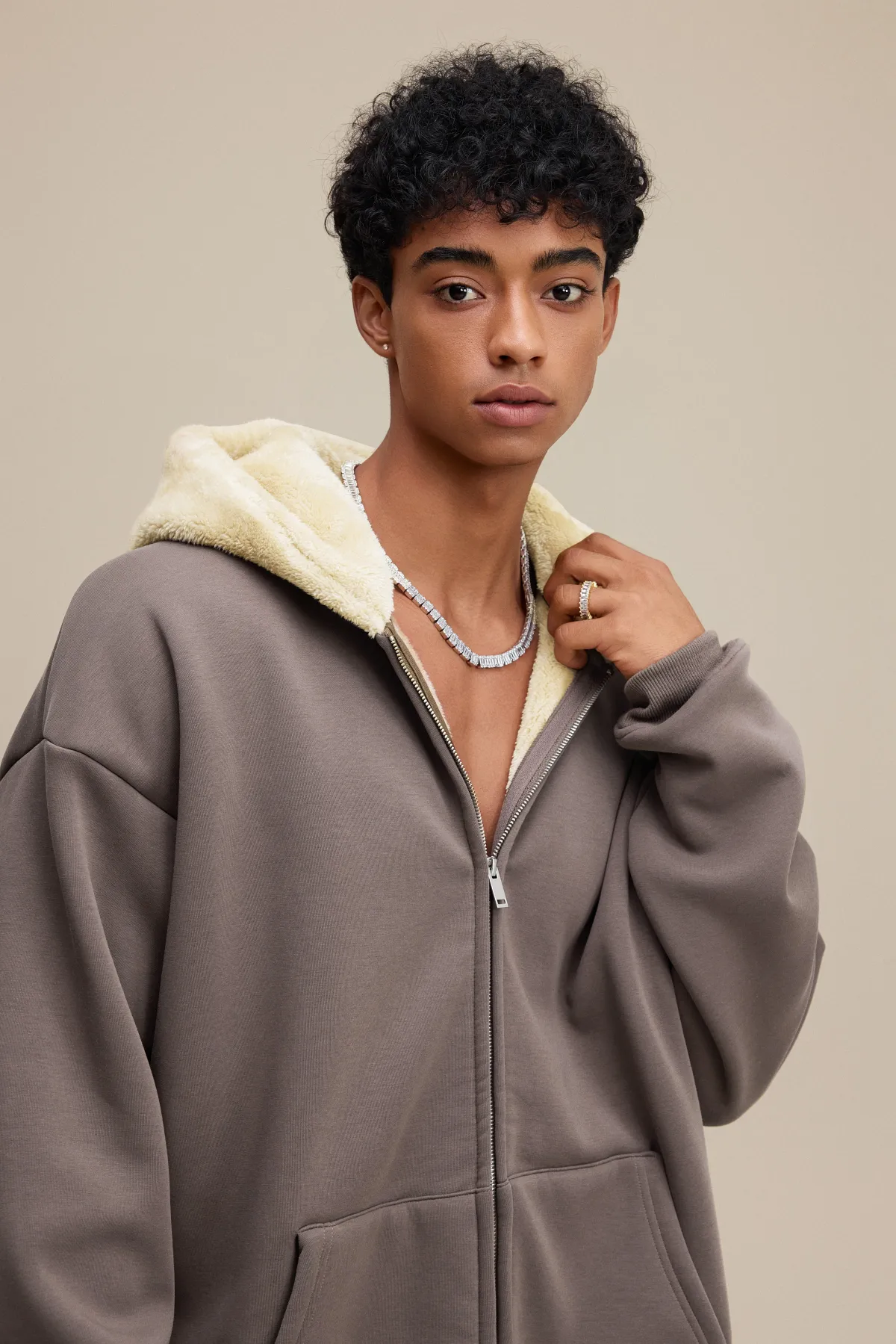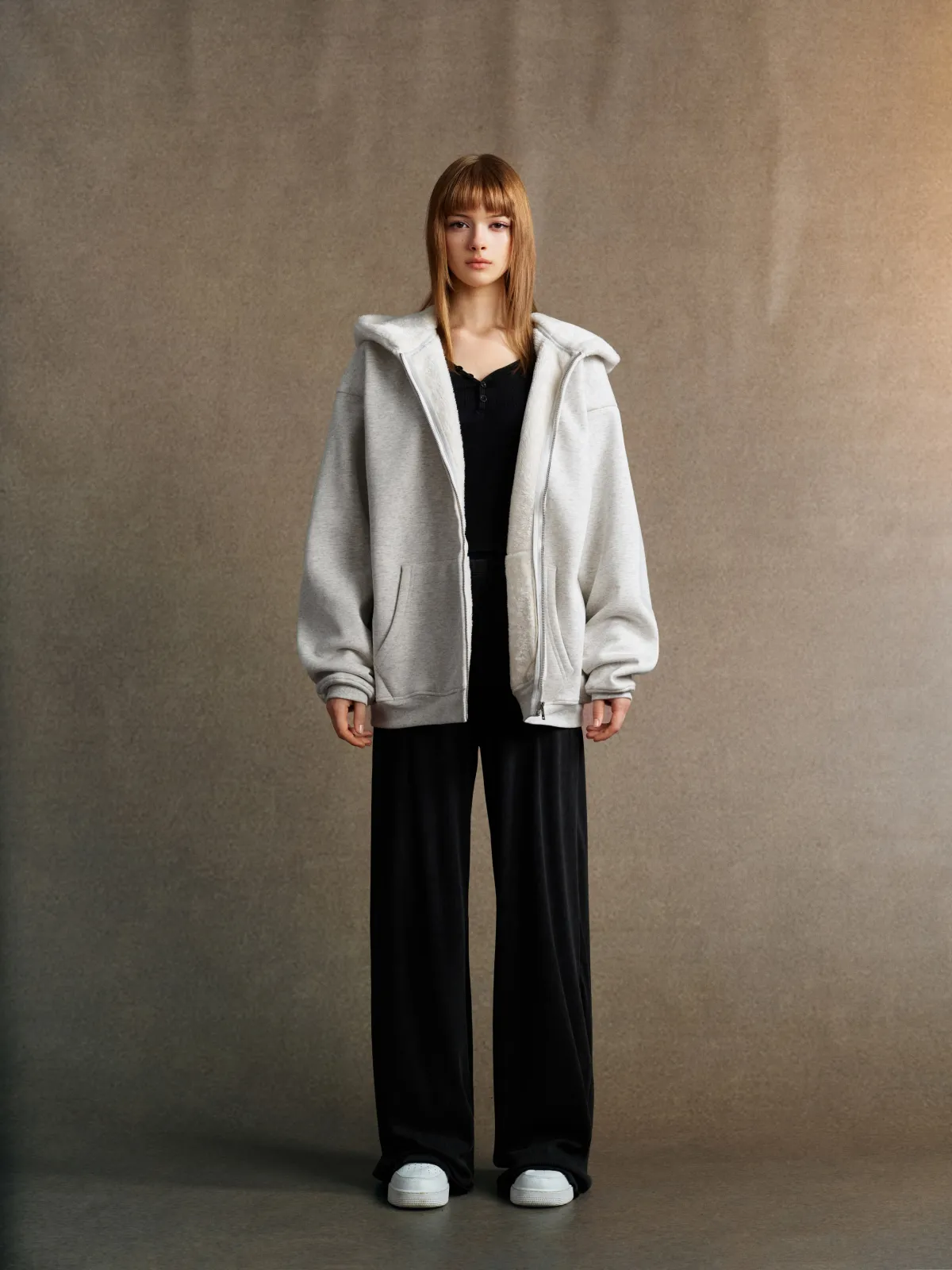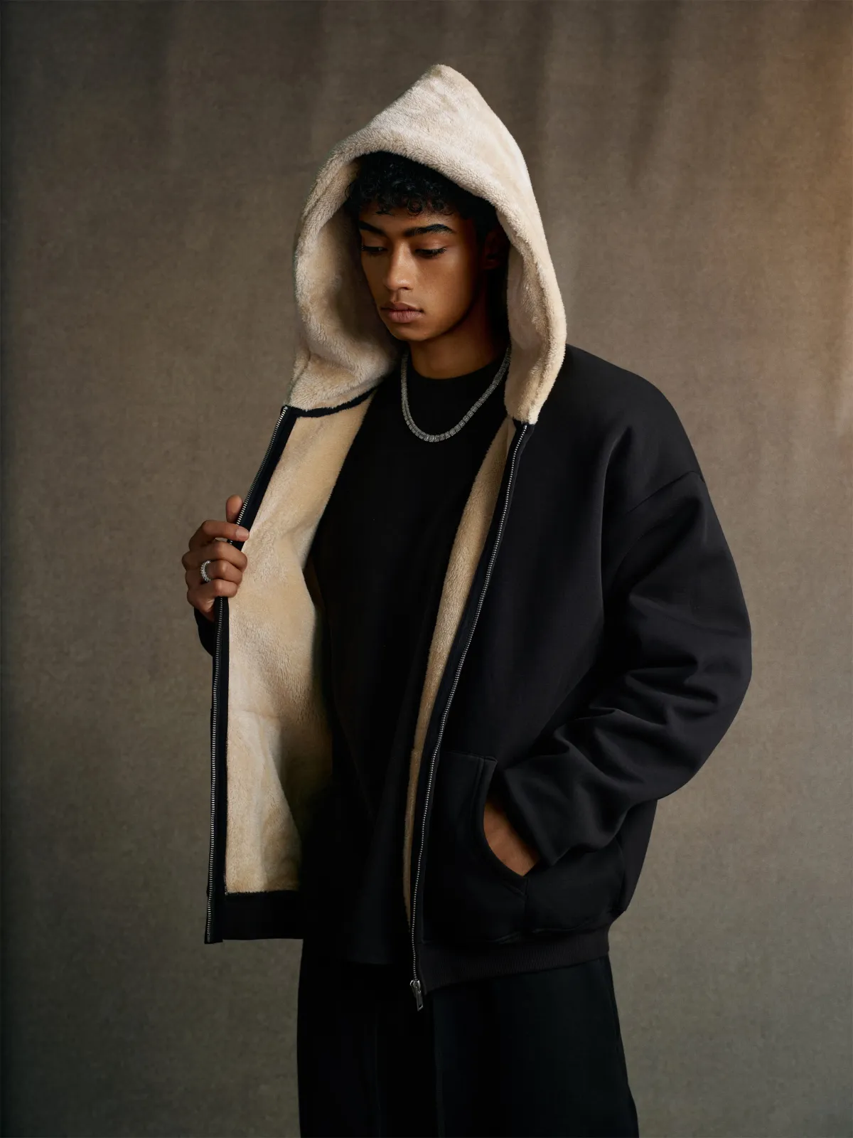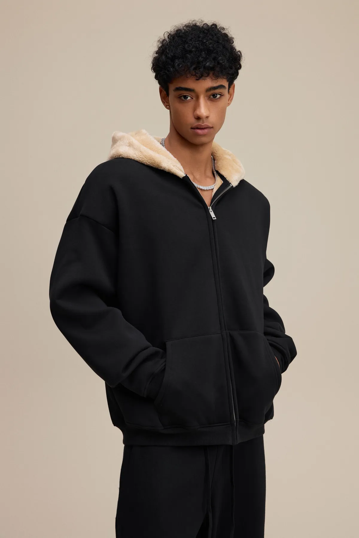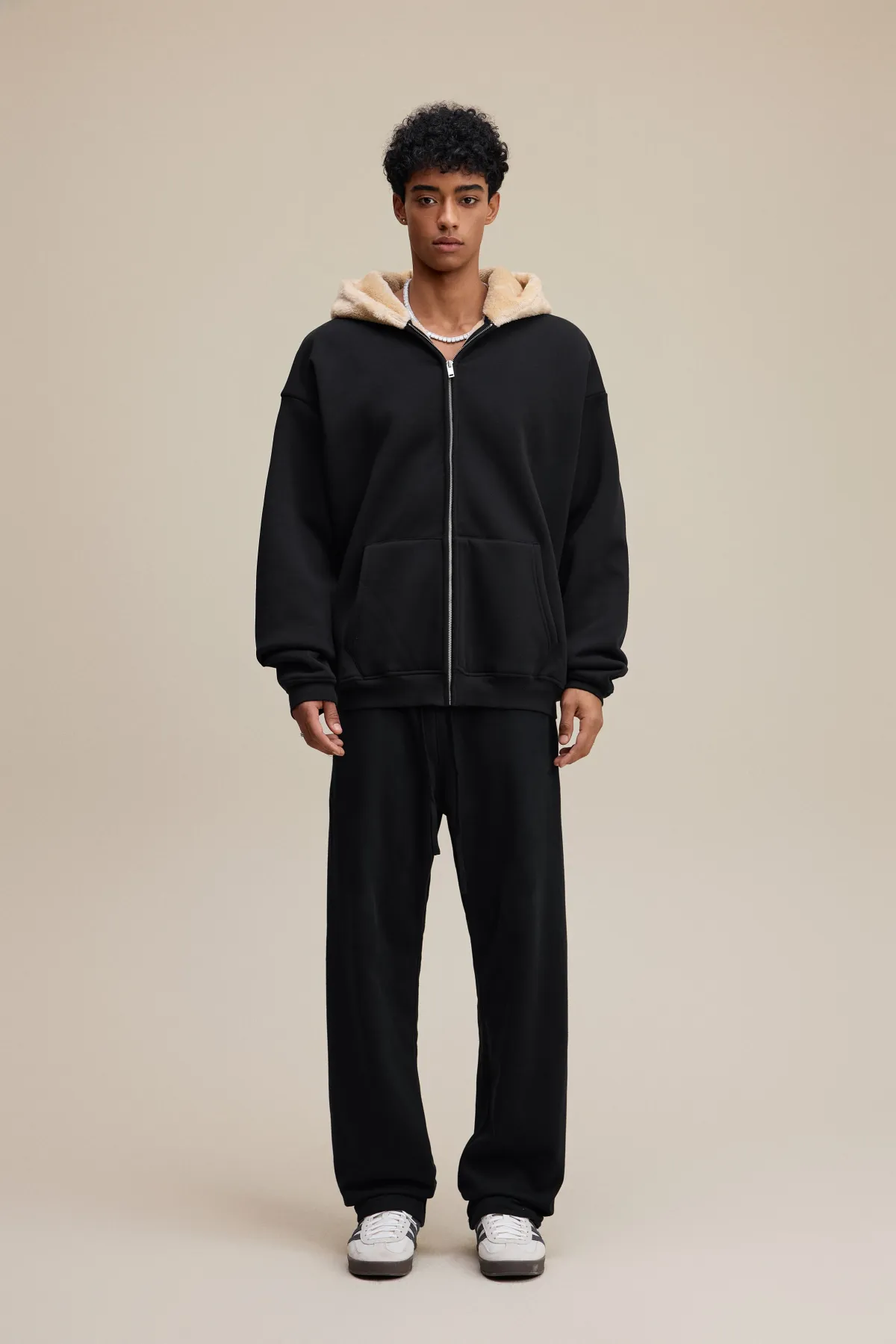 This 570GSM heavyweight zip hoodie delivers premium warmth and structure through its dense cotton shell and fleece-lined interior.