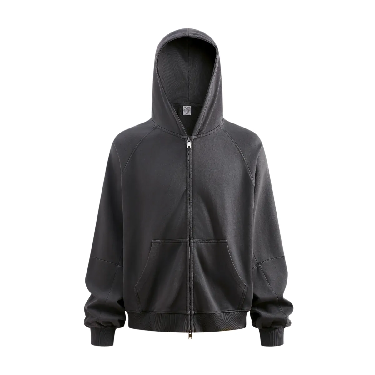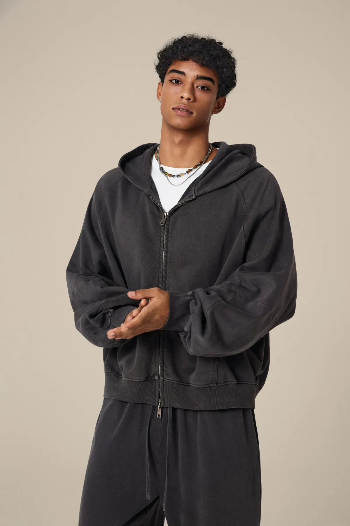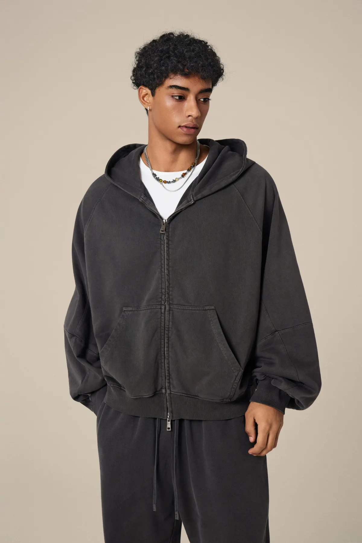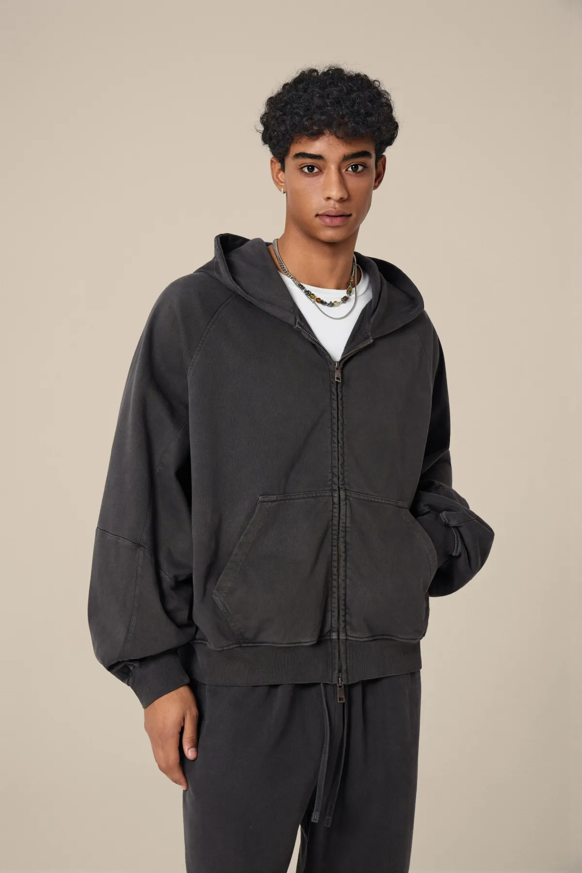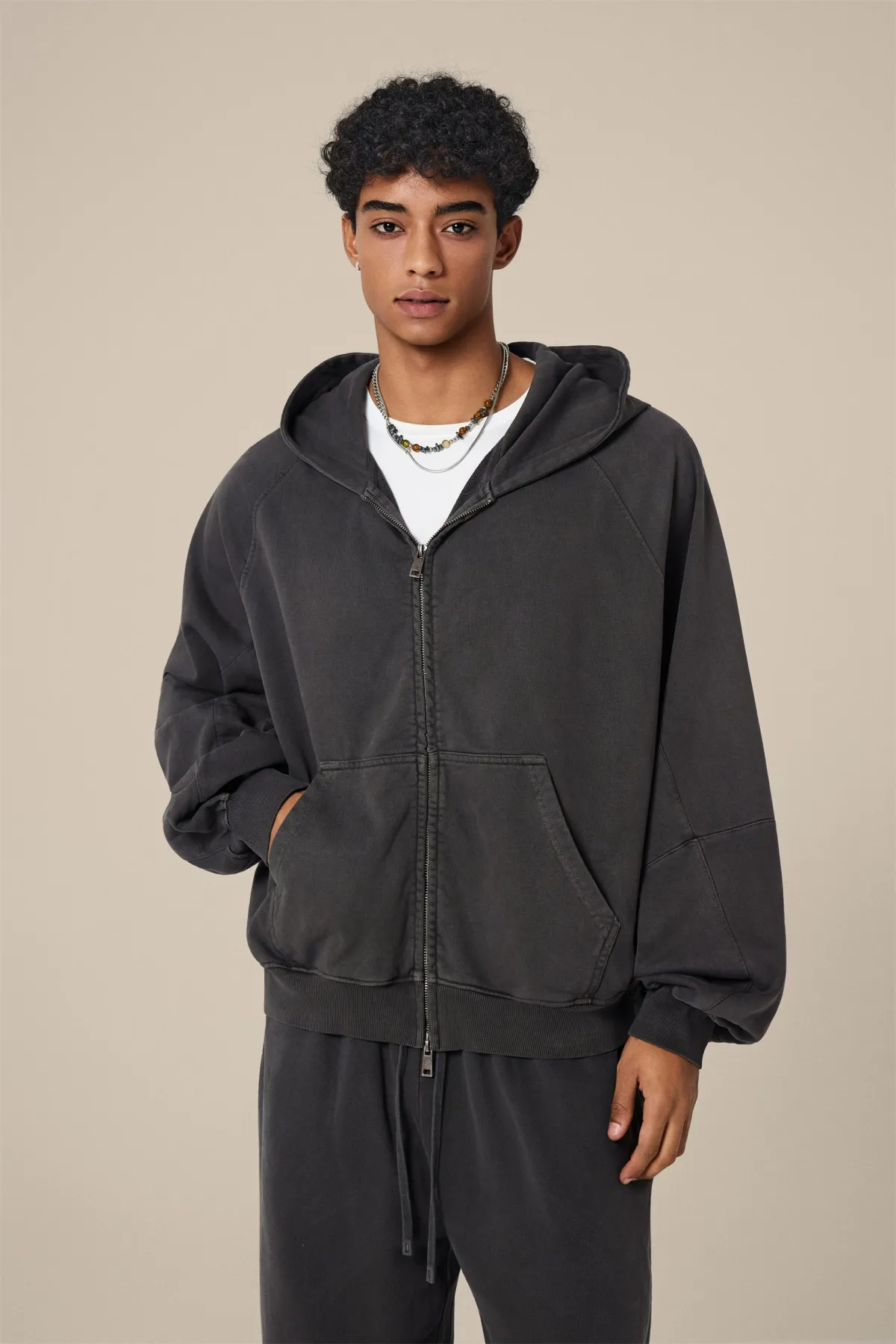 A full-length metal zipper offers versatile styling: wear it fully zipped as a clean sweatshirt, half-zipped for a layered street look, or fully open as a lightweight outer jacket.
