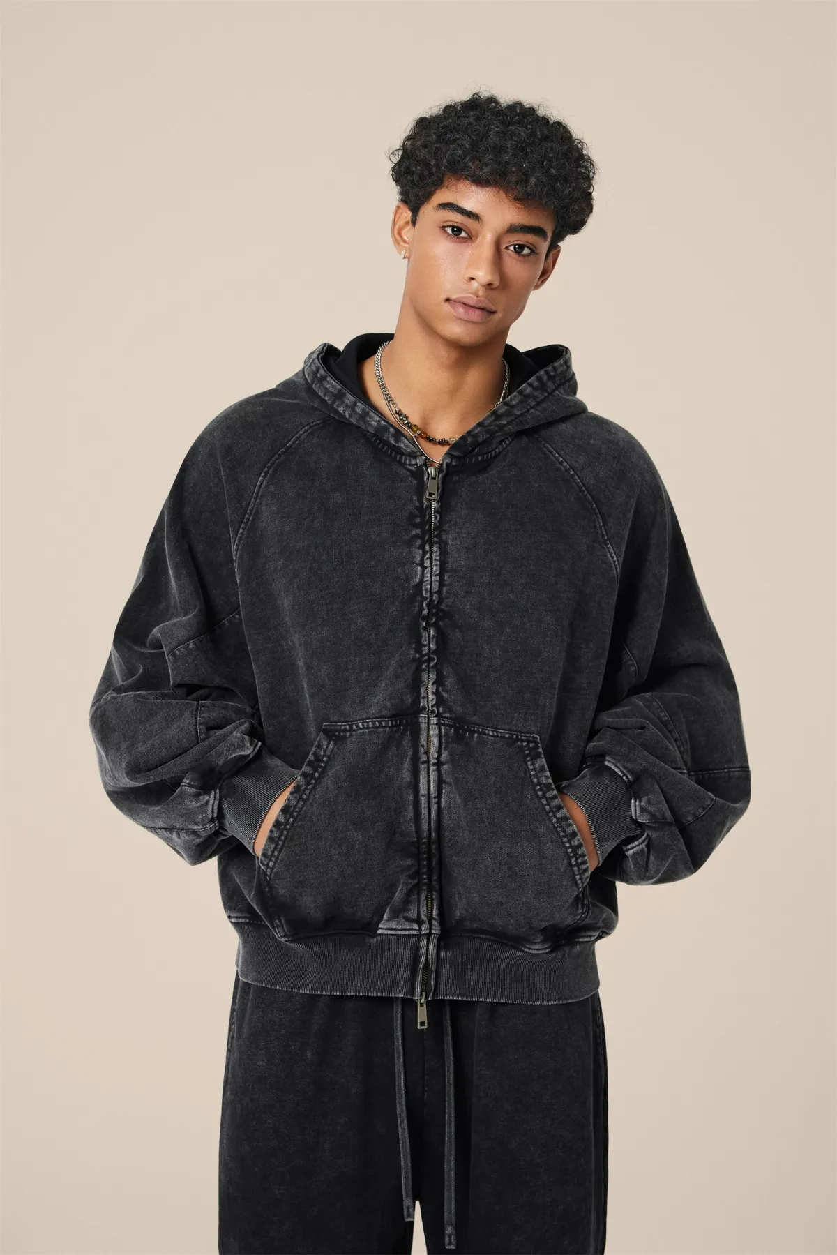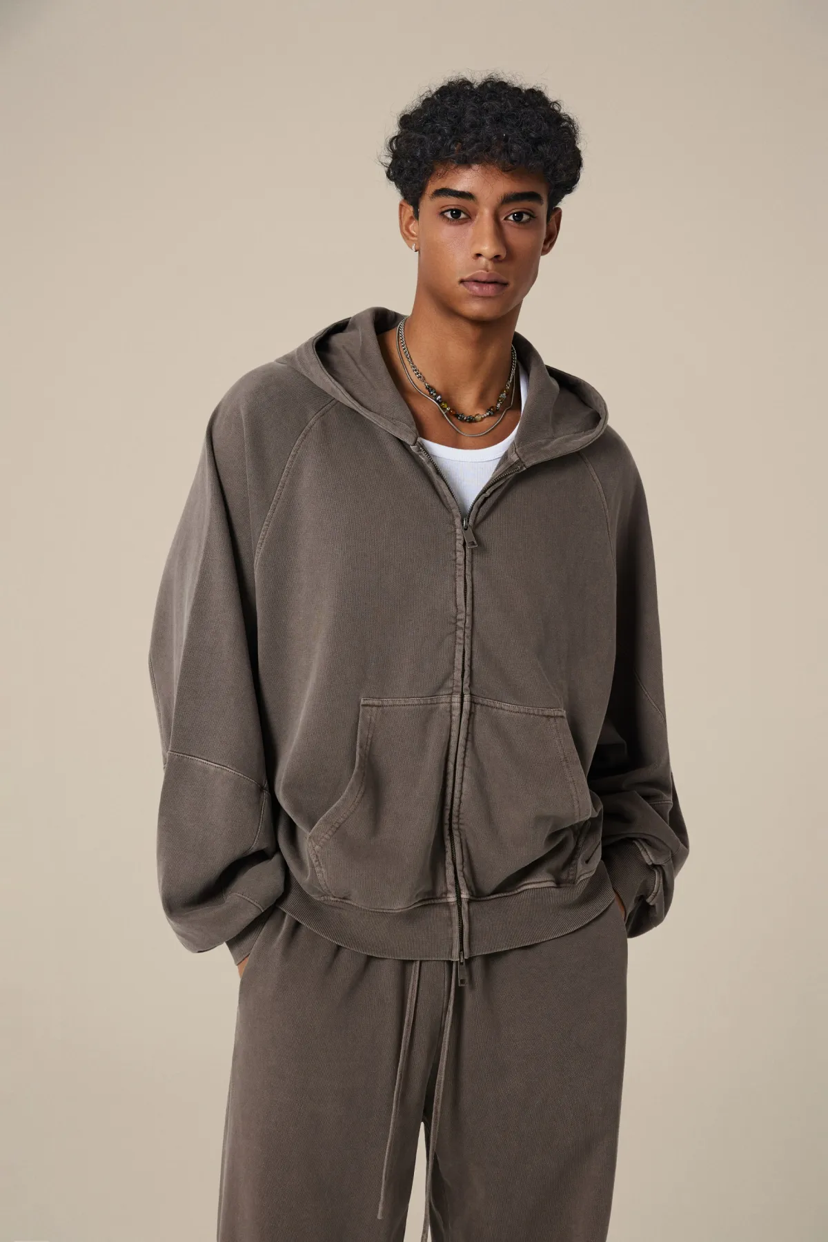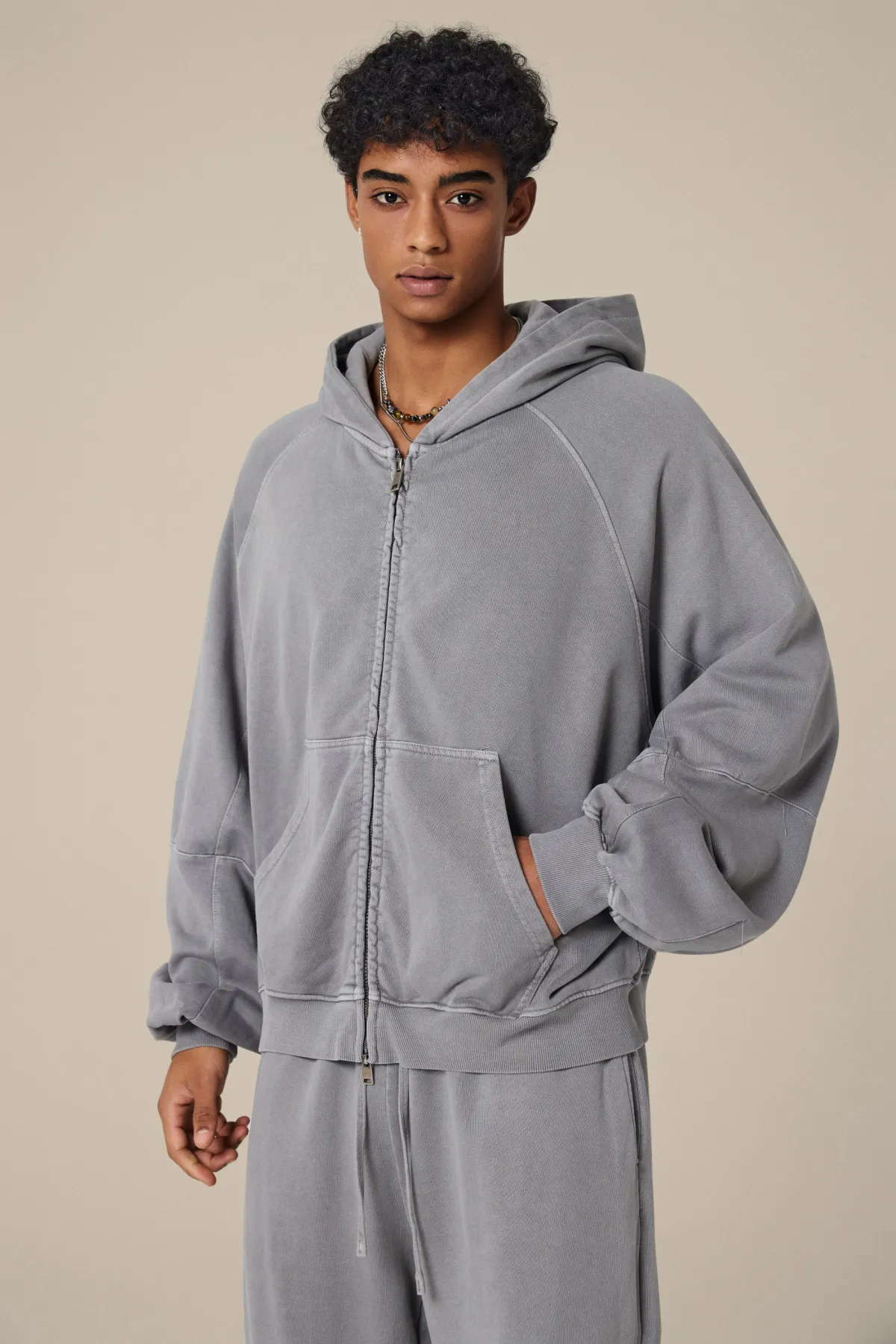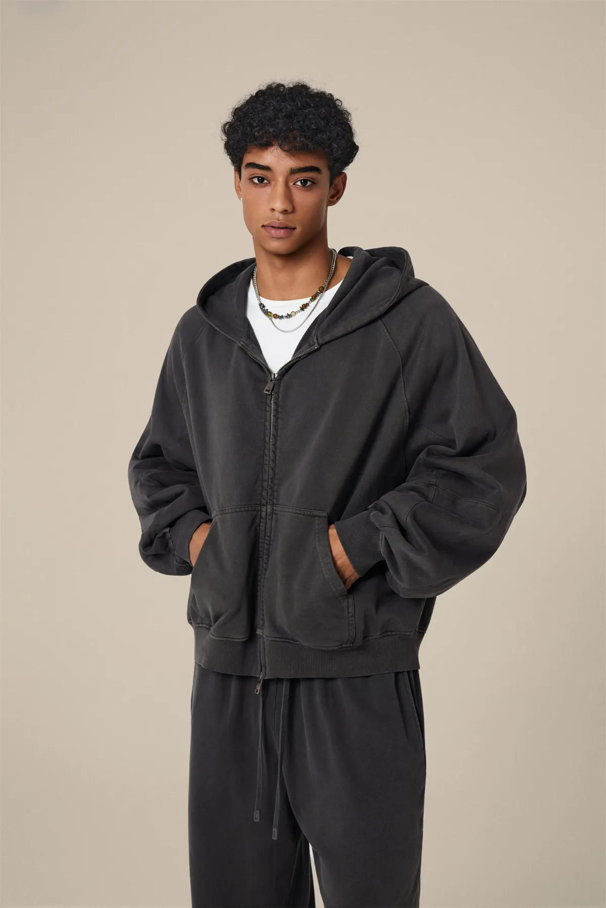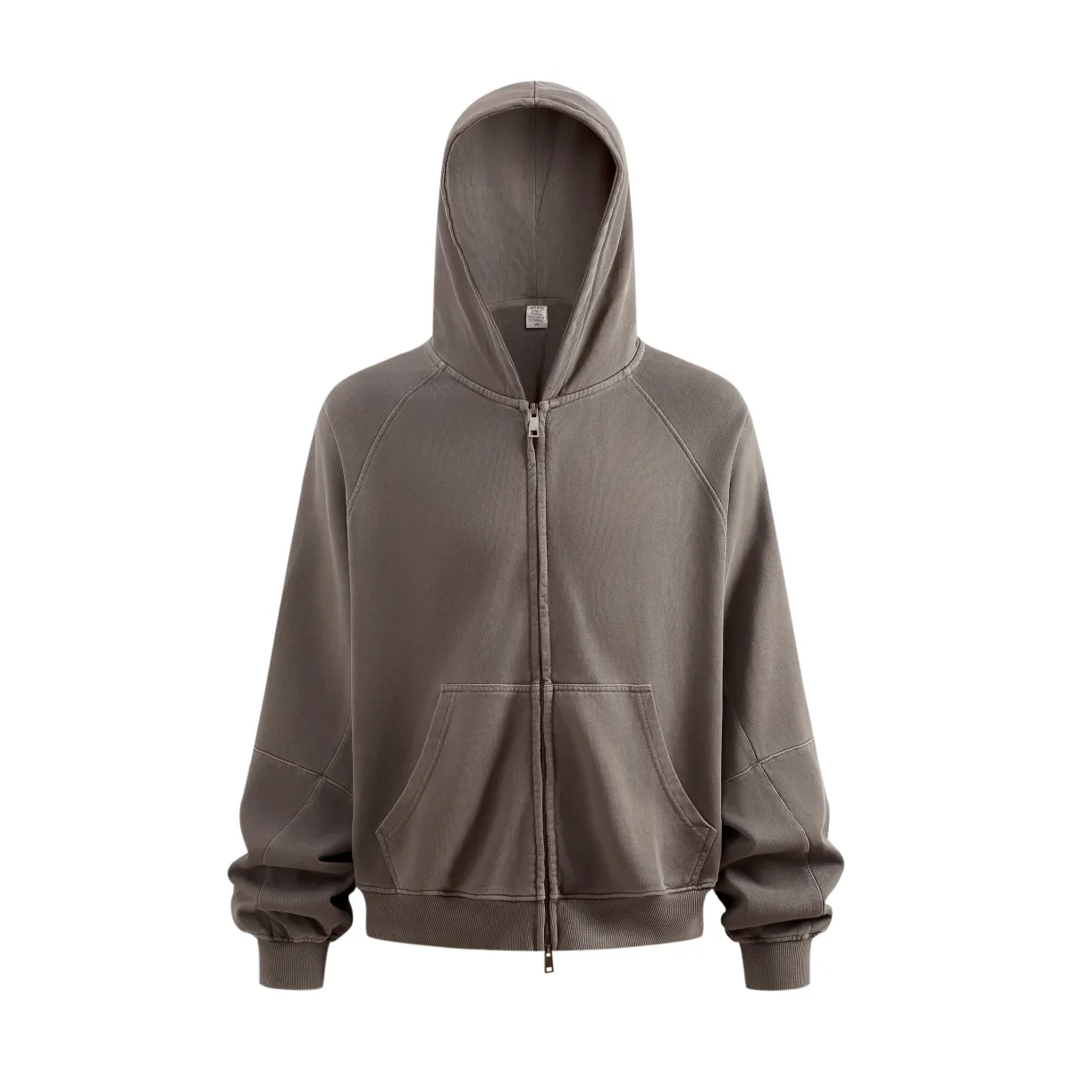A full-length metal zipper offers versatile styling: wear it fully zipped as a clean sweatshirt, half-zipped for a layered street look, or fully open as a lightweight outer jacket.
