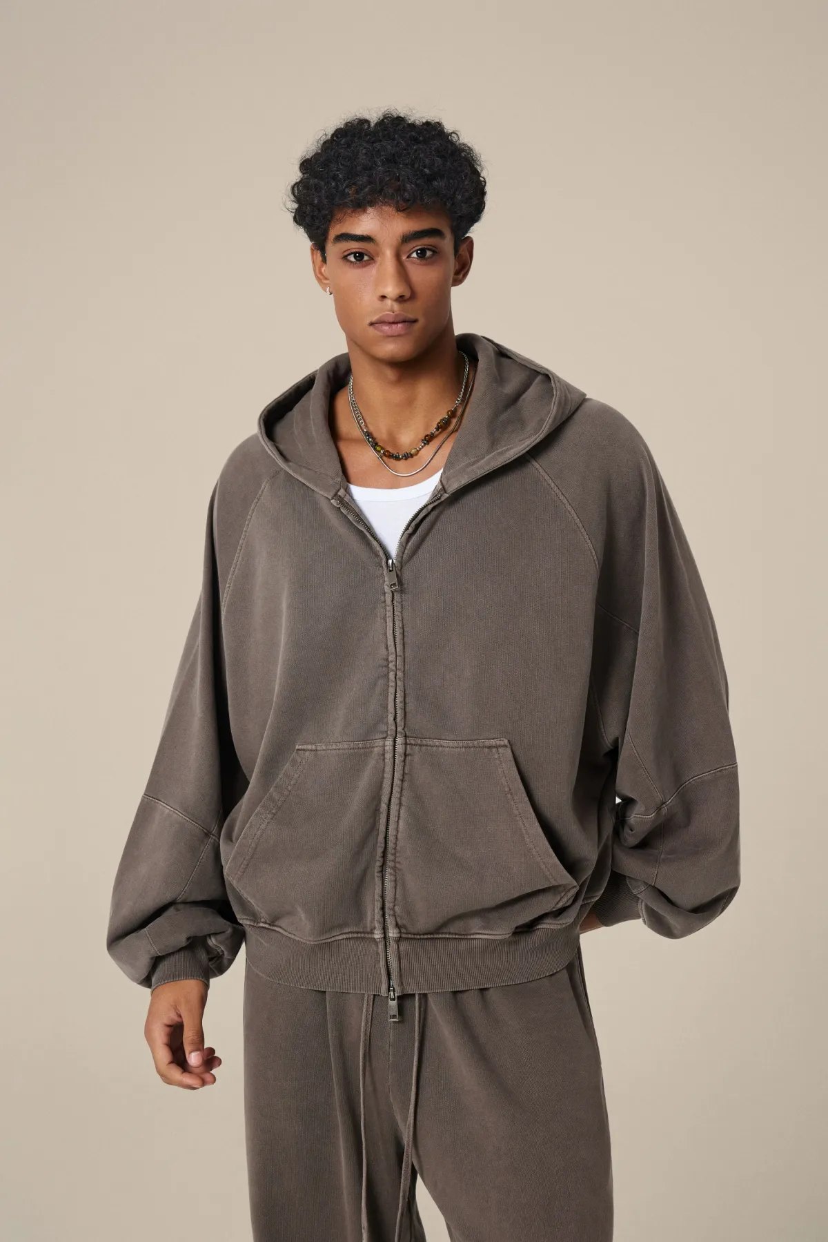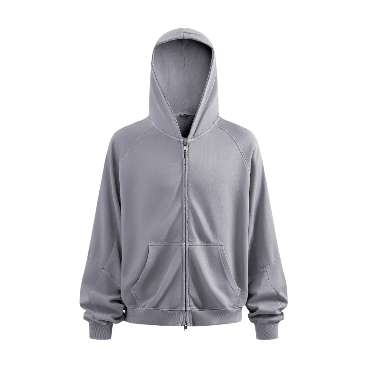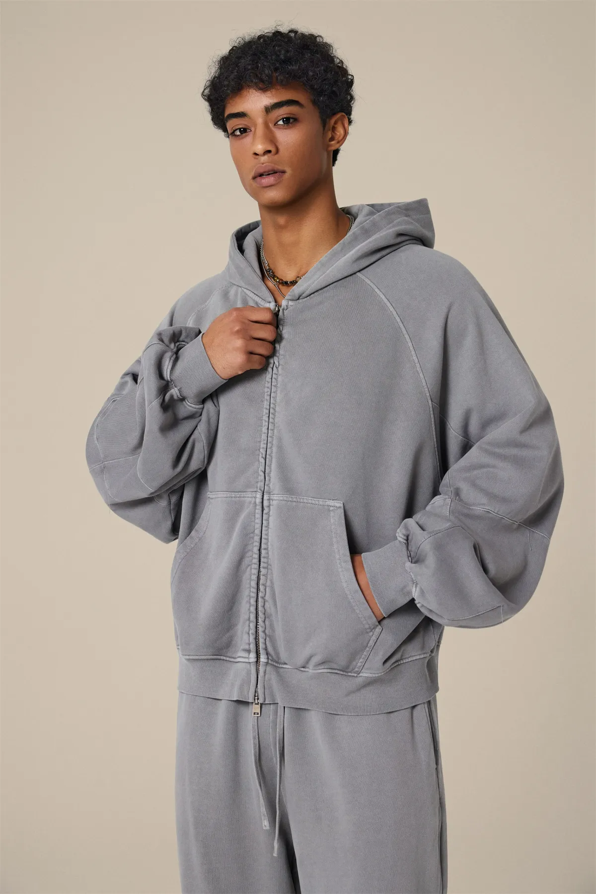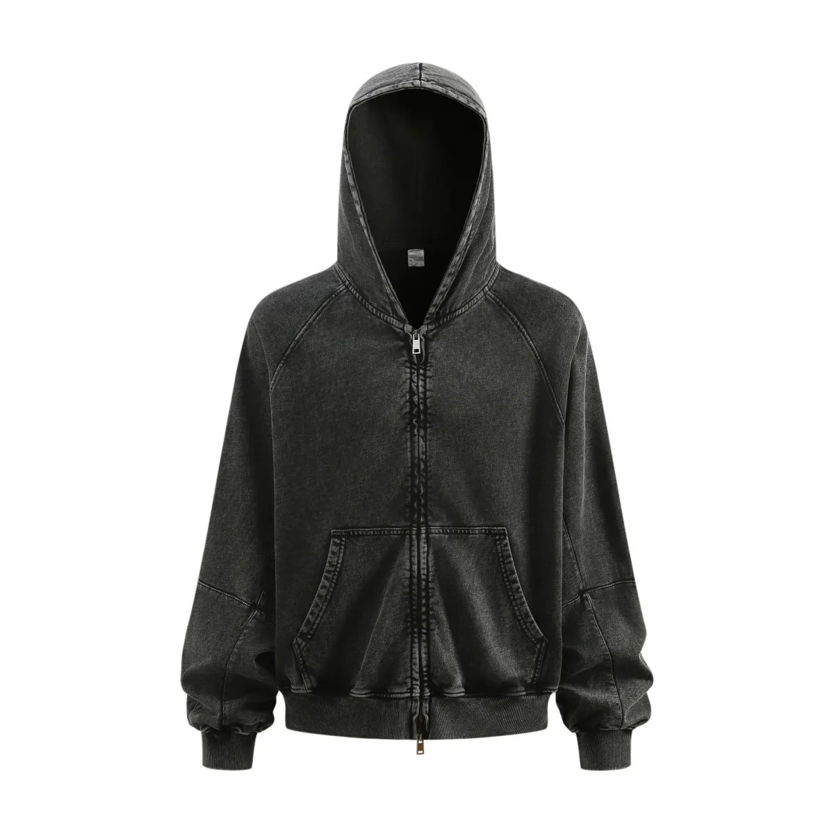 A full-length metal zipper offers versatile styling: wear it fully zipped as a clean sweatshirt, half-zipped for a layered street look, or fully open as a lightweight outer jacket.