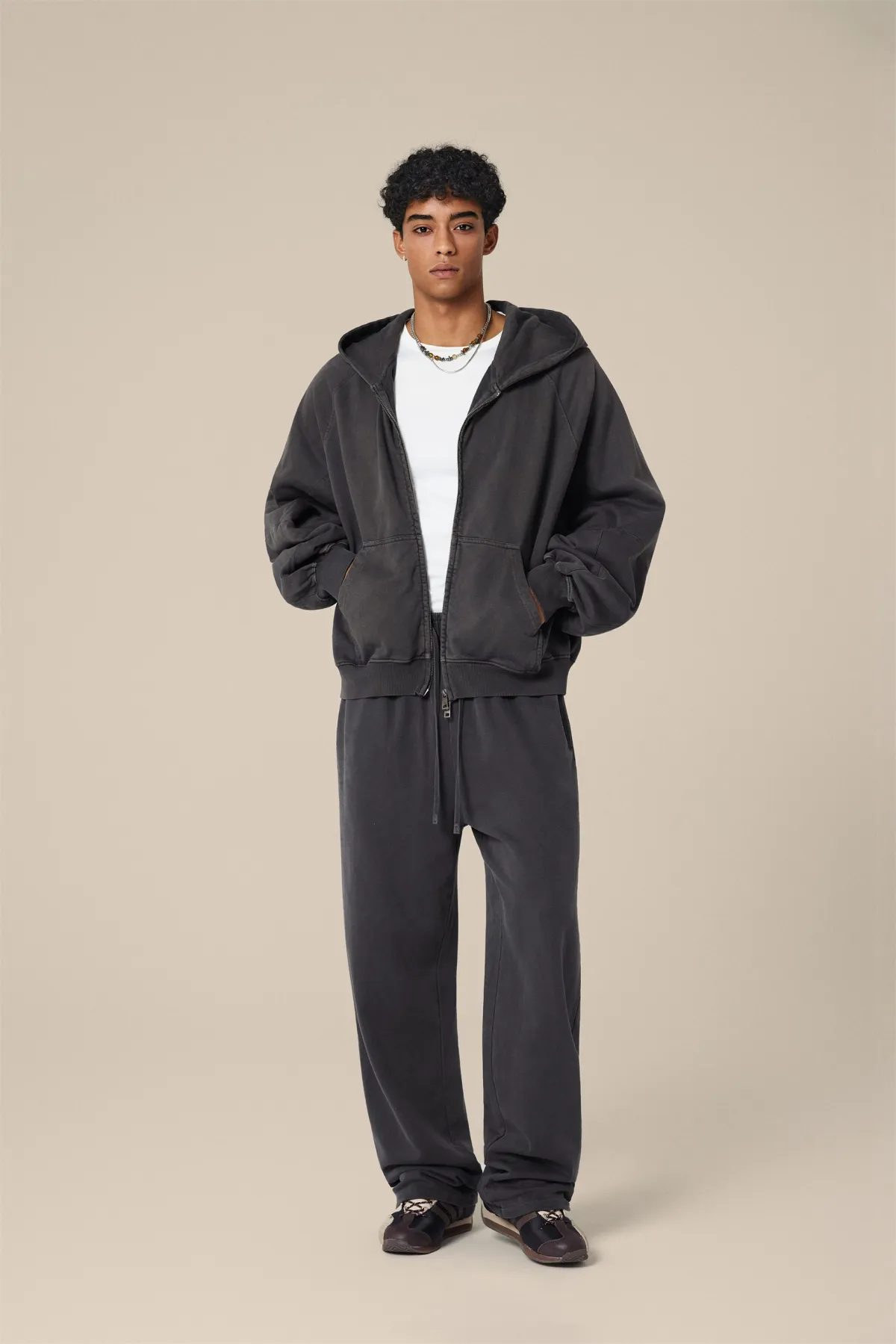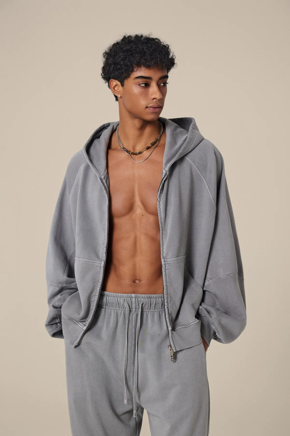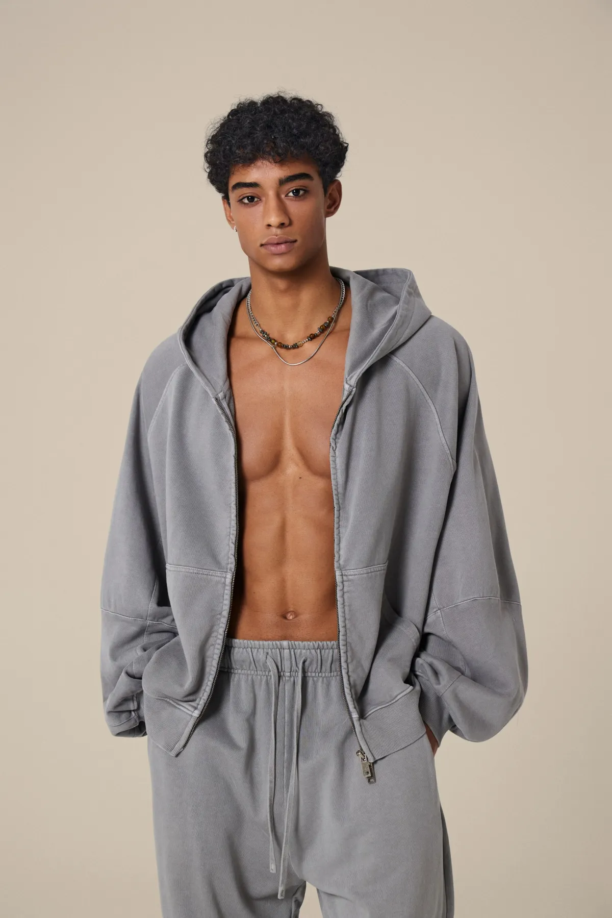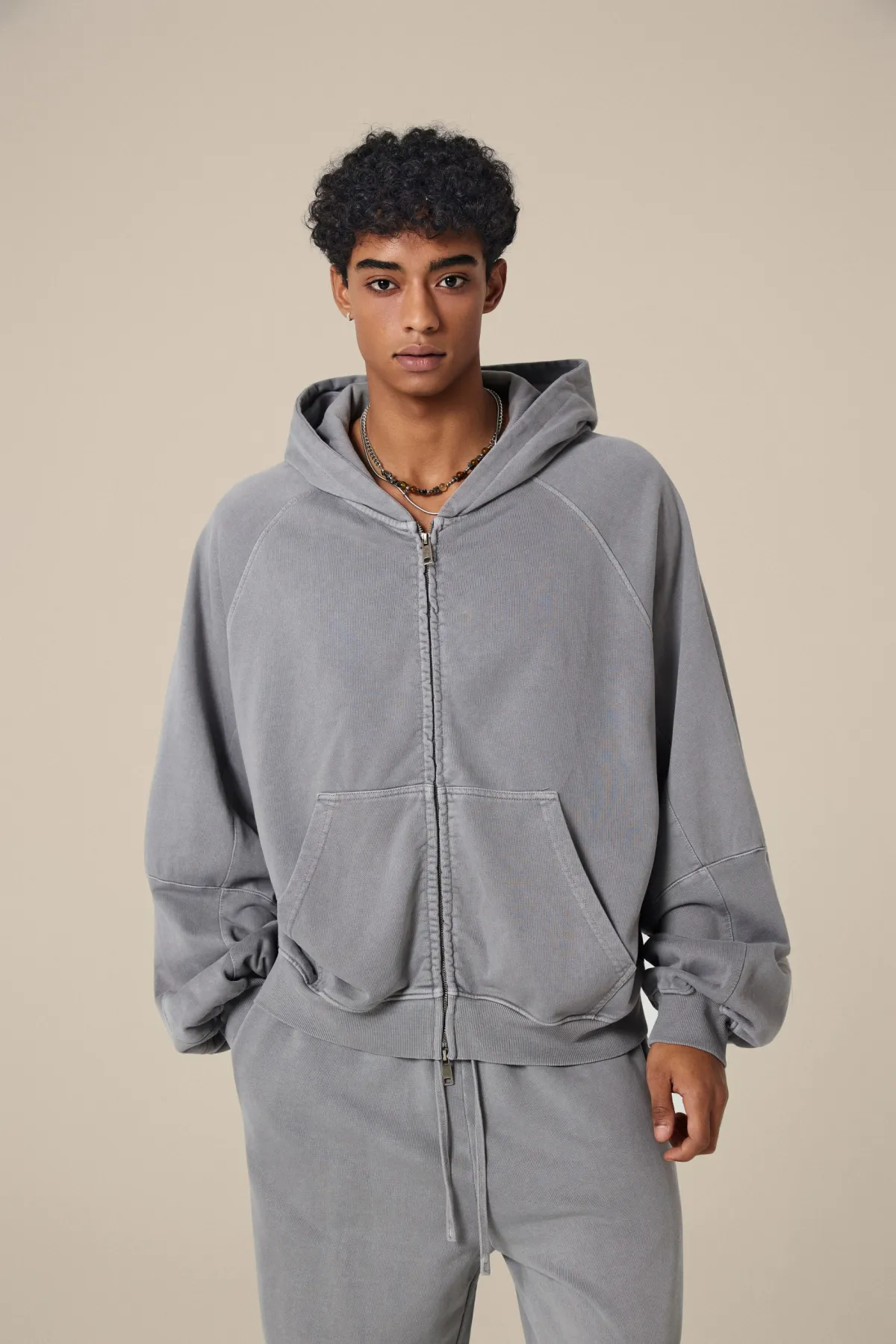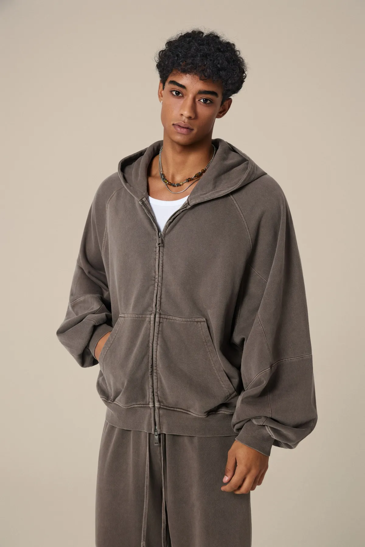 A full-length metal zipper offers versatile styling: wear it fully zipped as a clean sweatshirt, half-zipped for a layered street look, or fully open as a lightweight outer jacket.