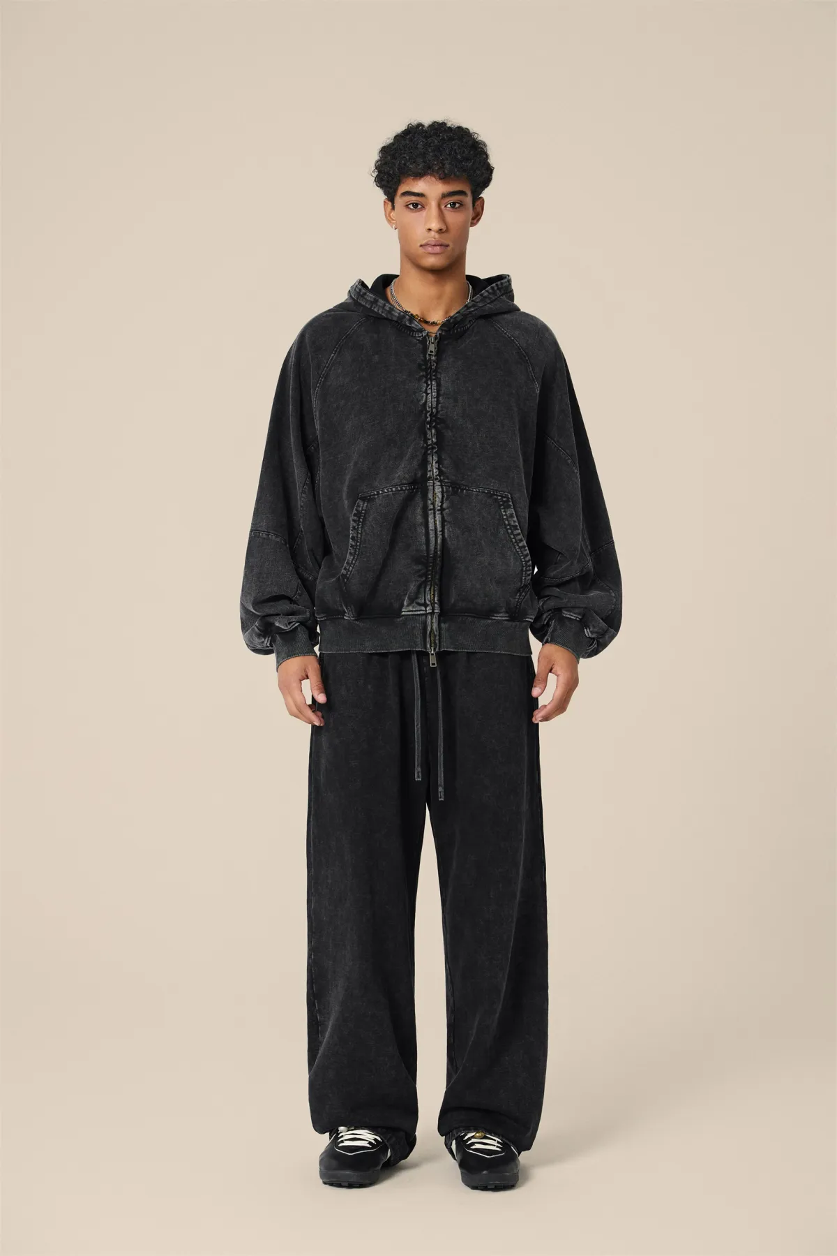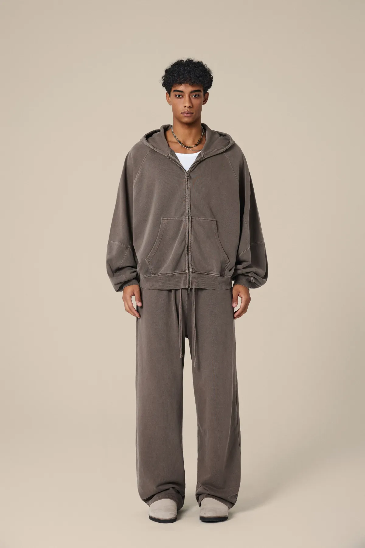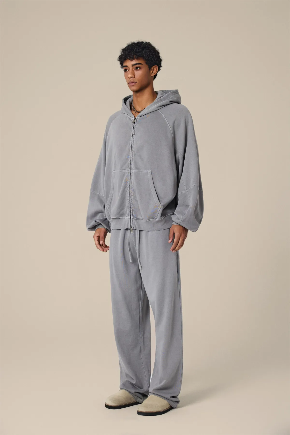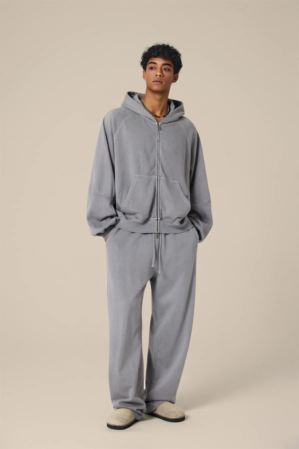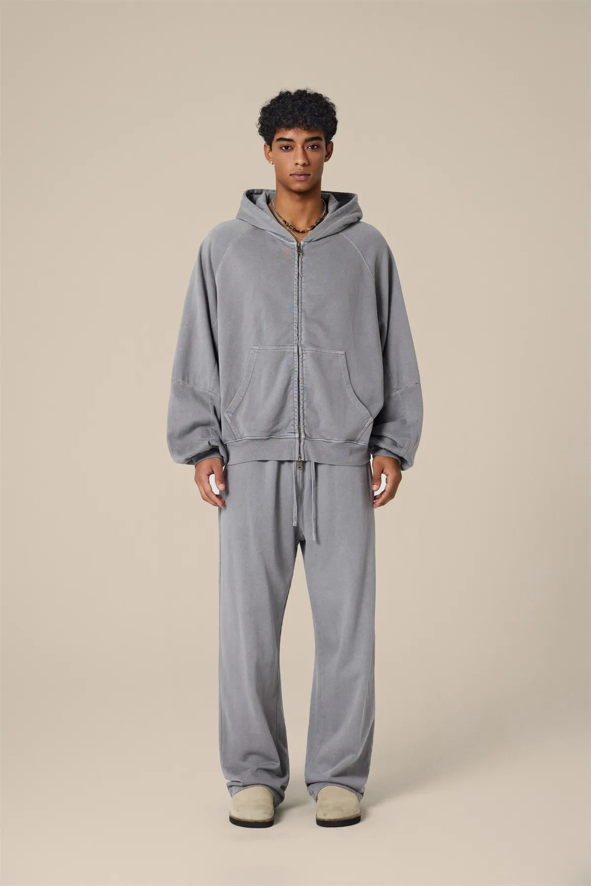 A full-length metal zipper offers versatile styling: wear it fully zipped as a clean sweatshirt, half-zipped for a layered street look, or fully open as a lightweight outer jacket.