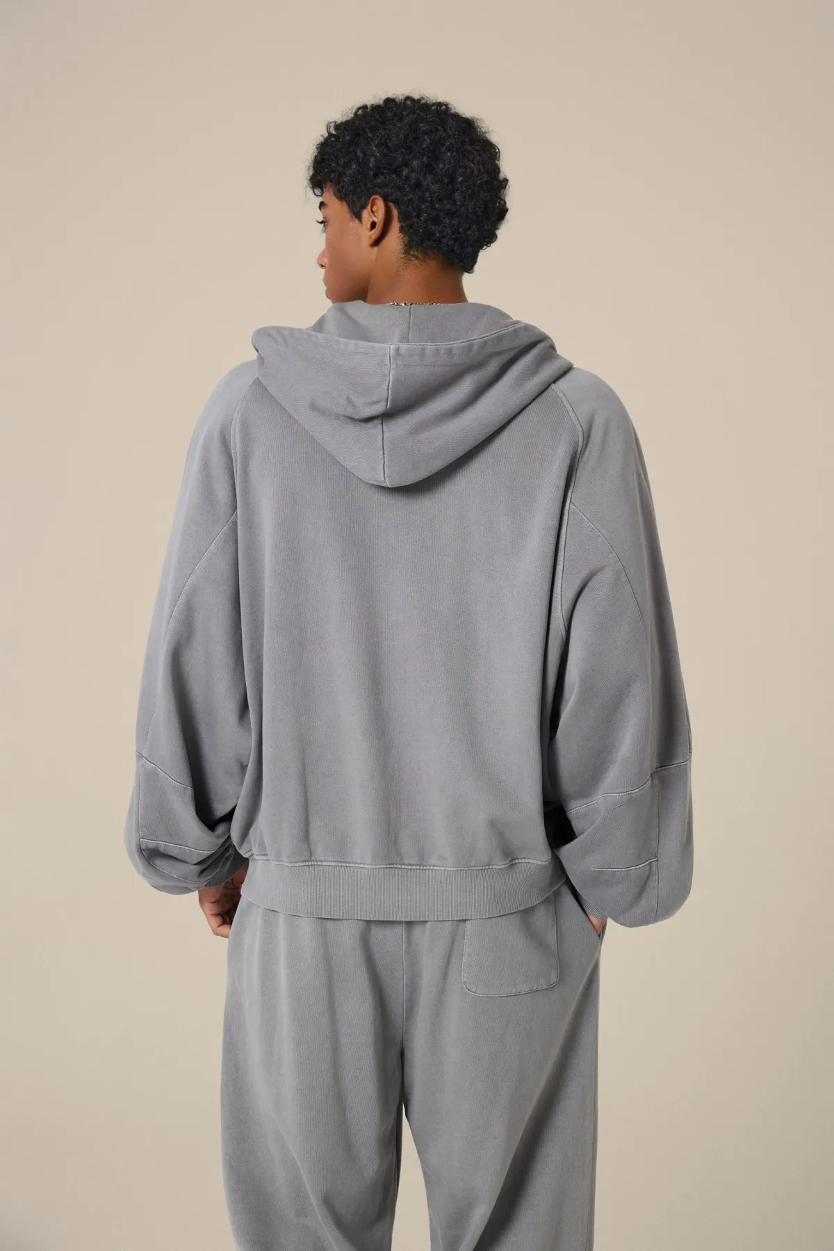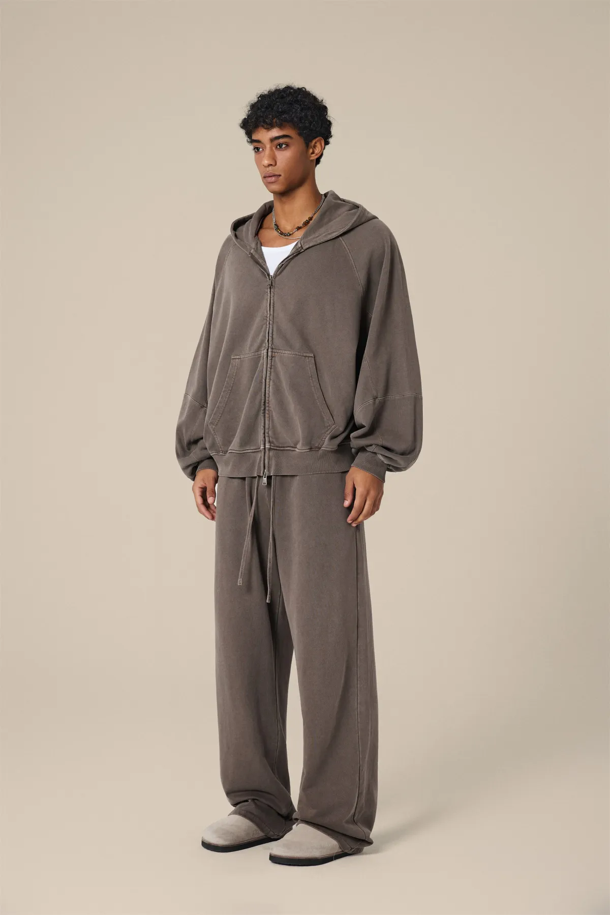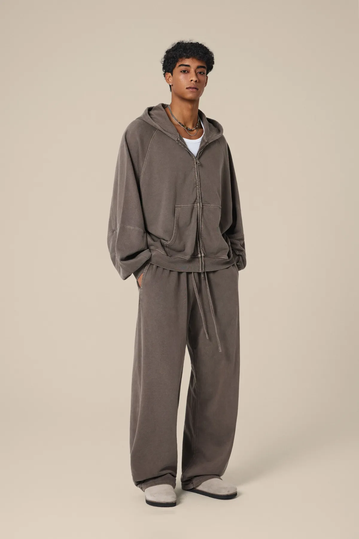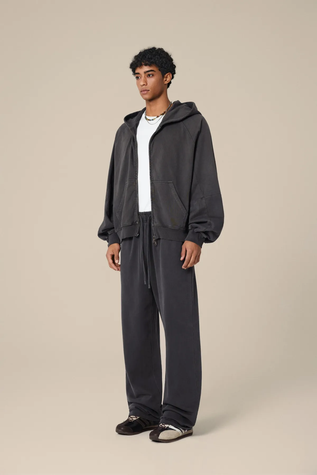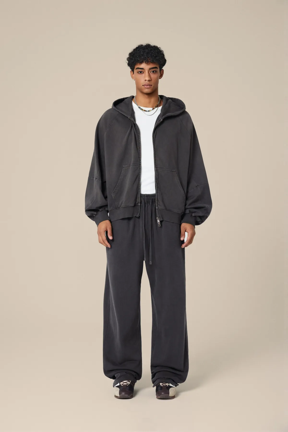 A full-length metal zipper offers versatile styling: wear it fully zipped as a clean sweatshirt, half-zipped for a layered street look, or fully open as a lightweight outer jacket.