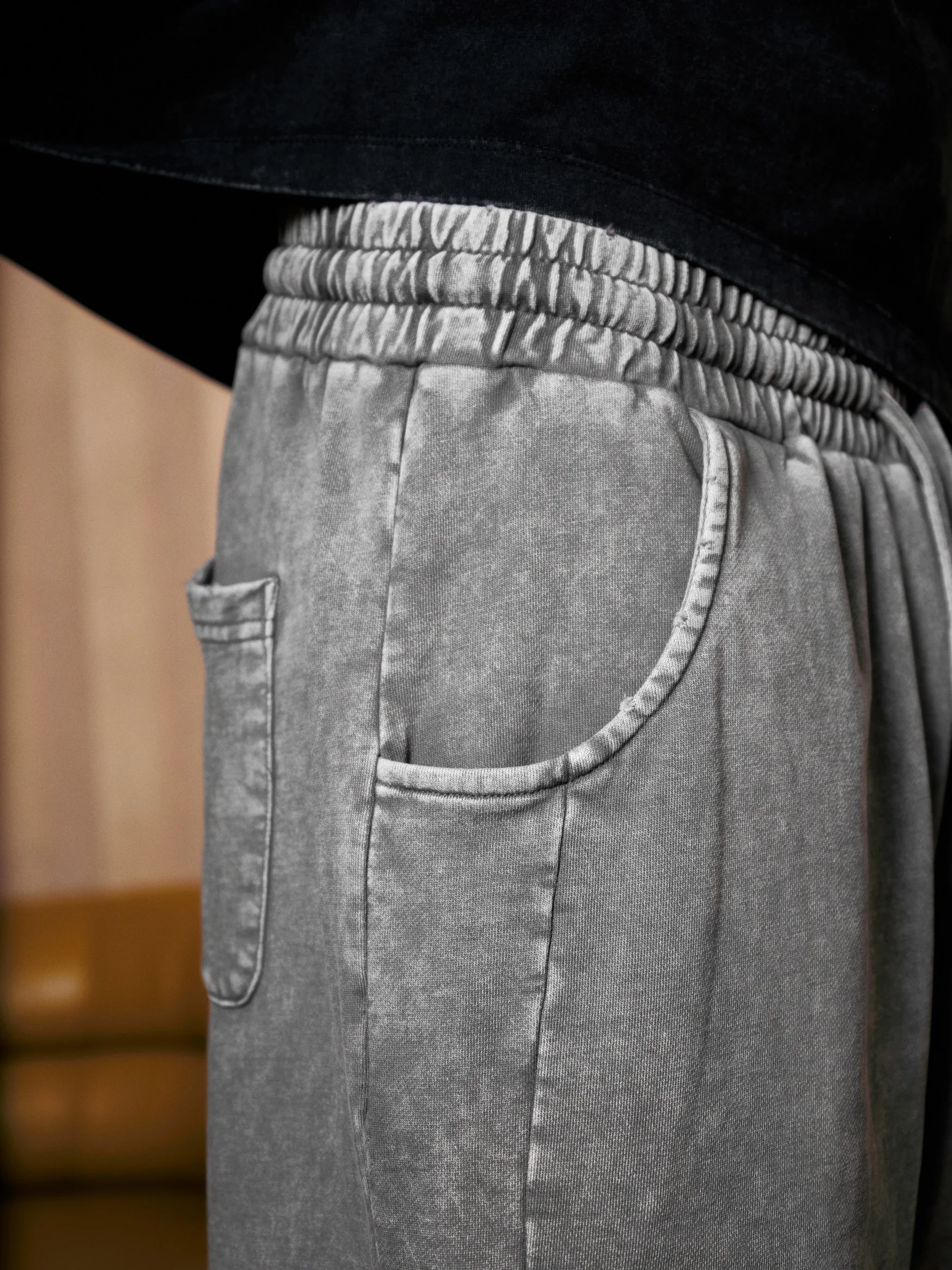 Loose-fit marled pants made from 100% cotton, 300g fabric with a clean, versatile color base. Features a durable double-needle hem, elastic waistband with buttonhole and flat drawcord for easy adjustment, and large self-fabric side pockets for practical storage. Front crease detailing adds depth, while crisp, modern lines elevate the overall look. A simple, reliable everyday essential for broad styling needs.