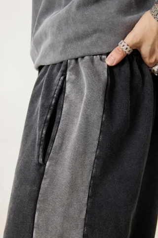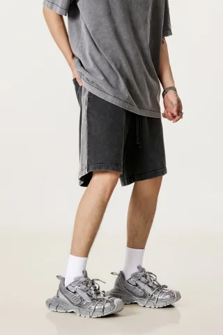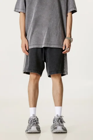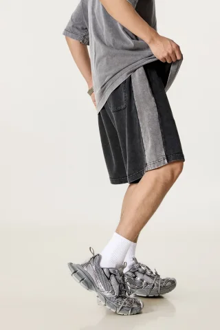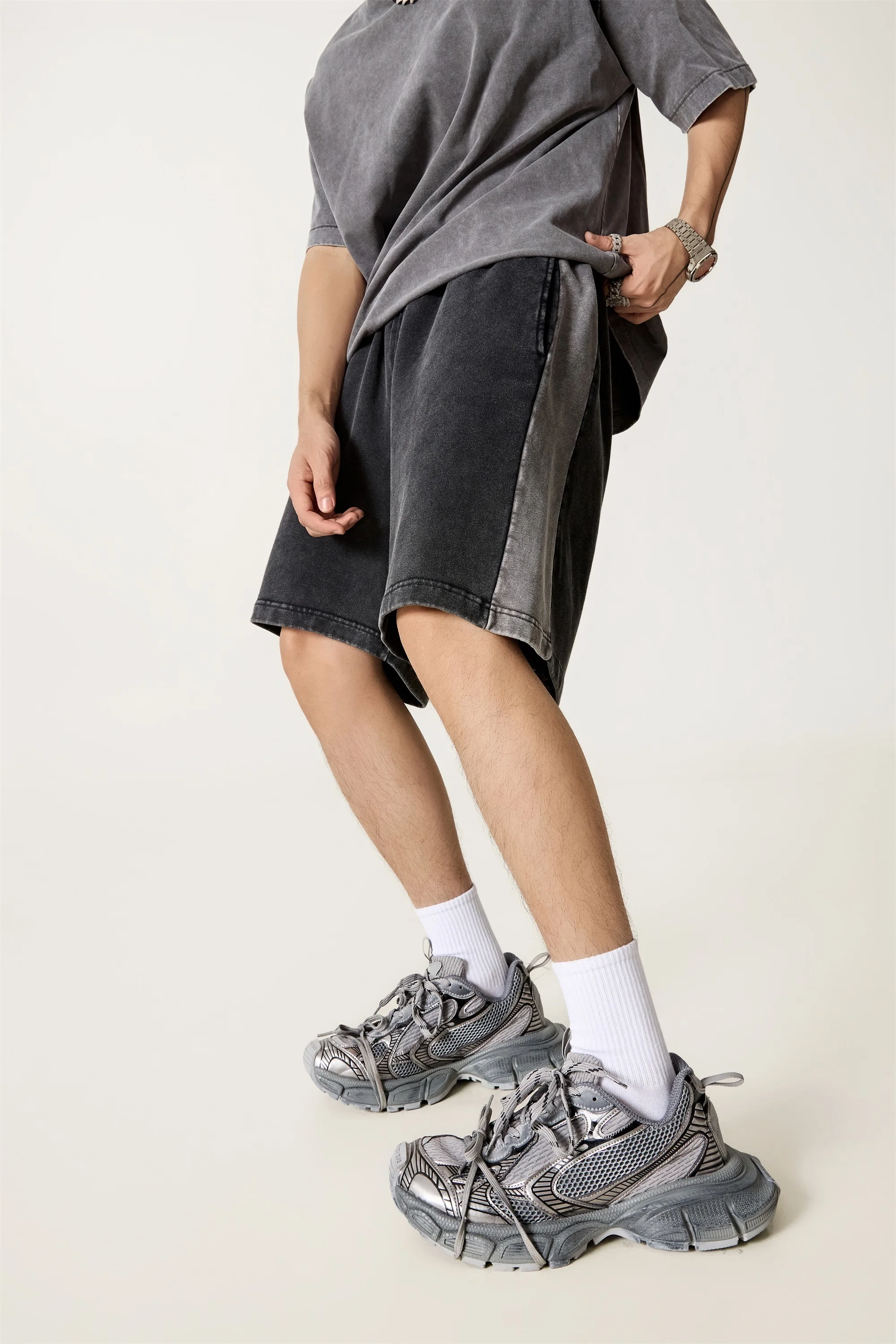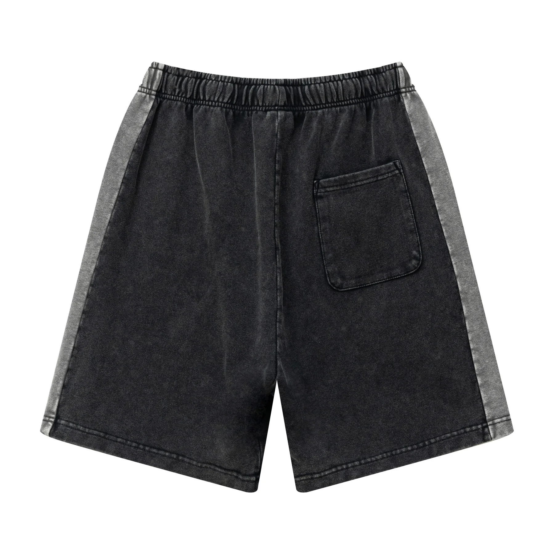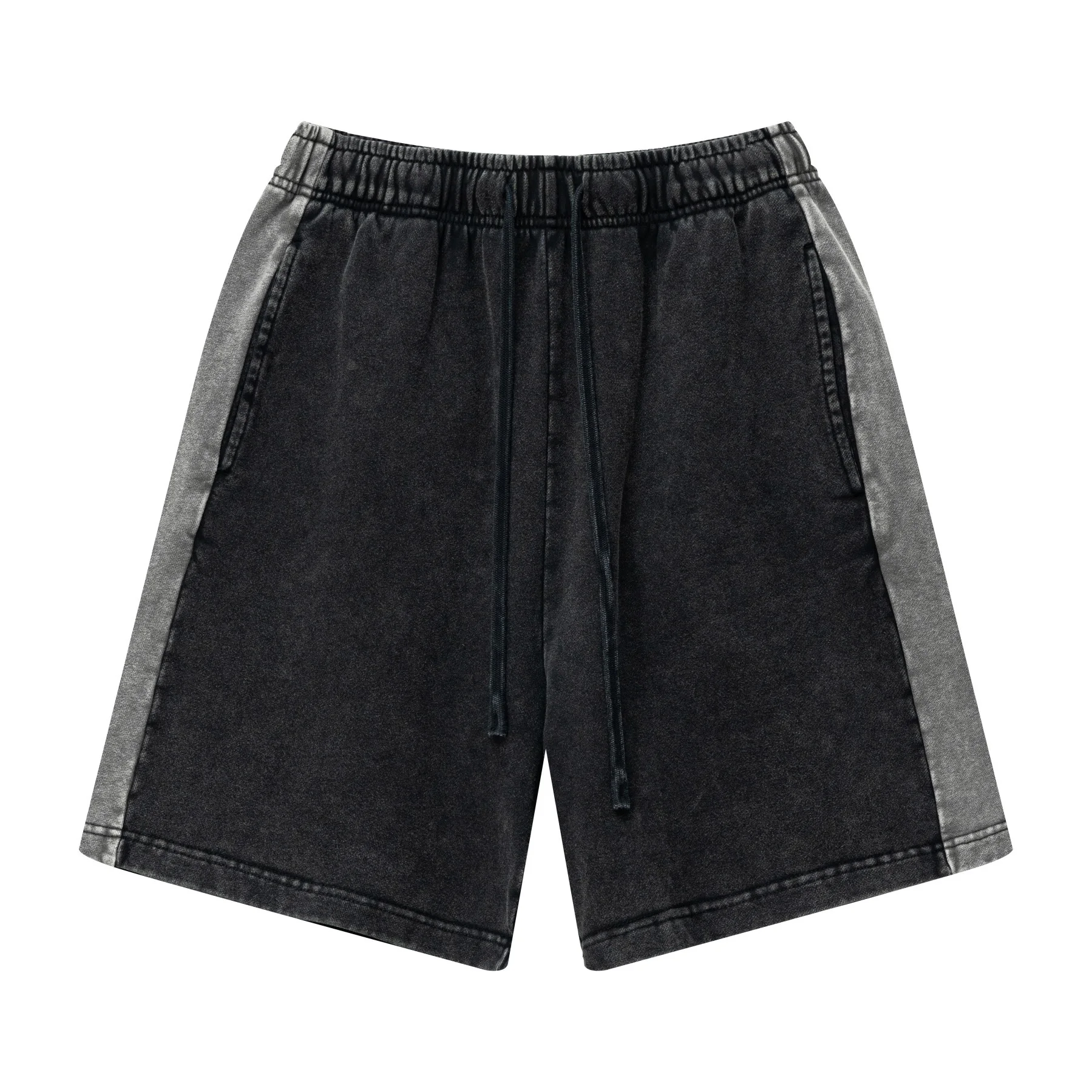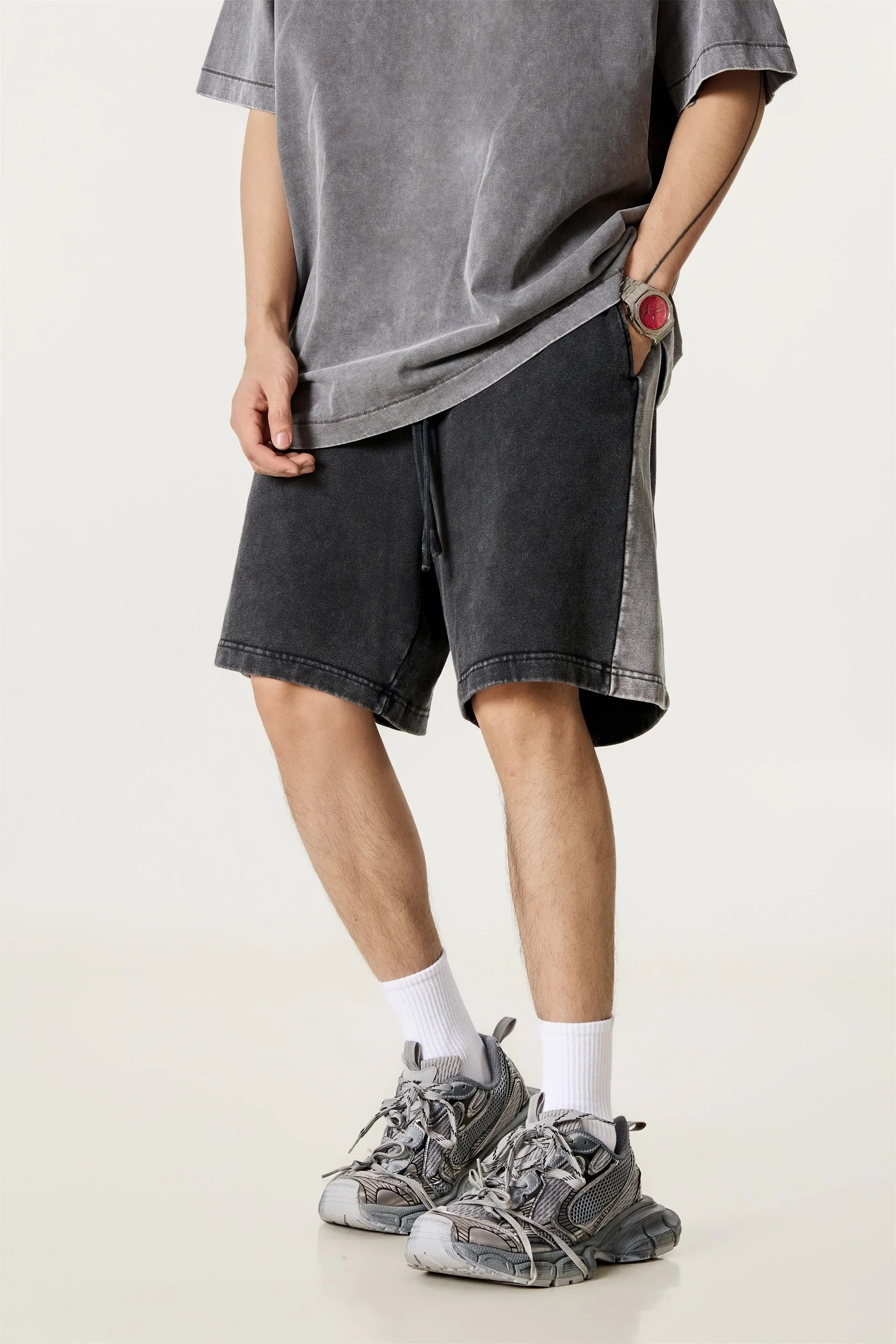 Crafted from 100% cotton beefy fabric, these 370g shorts offer a soft, breathable, non-shrinking wear with natural wrinkle resistance for long-lasting neatness. The snow-wash vintage process creates subtle white haze patterns and varied fading for a retro, worn-in look. Designed with an elastic waistband and contrast cotton drawcord, the shorts feature multi-color panel construction for bold contrast, functional pockets, and wide, dense-stitched hems with clean, durable lines. Ideal for street-inspired casual styling.