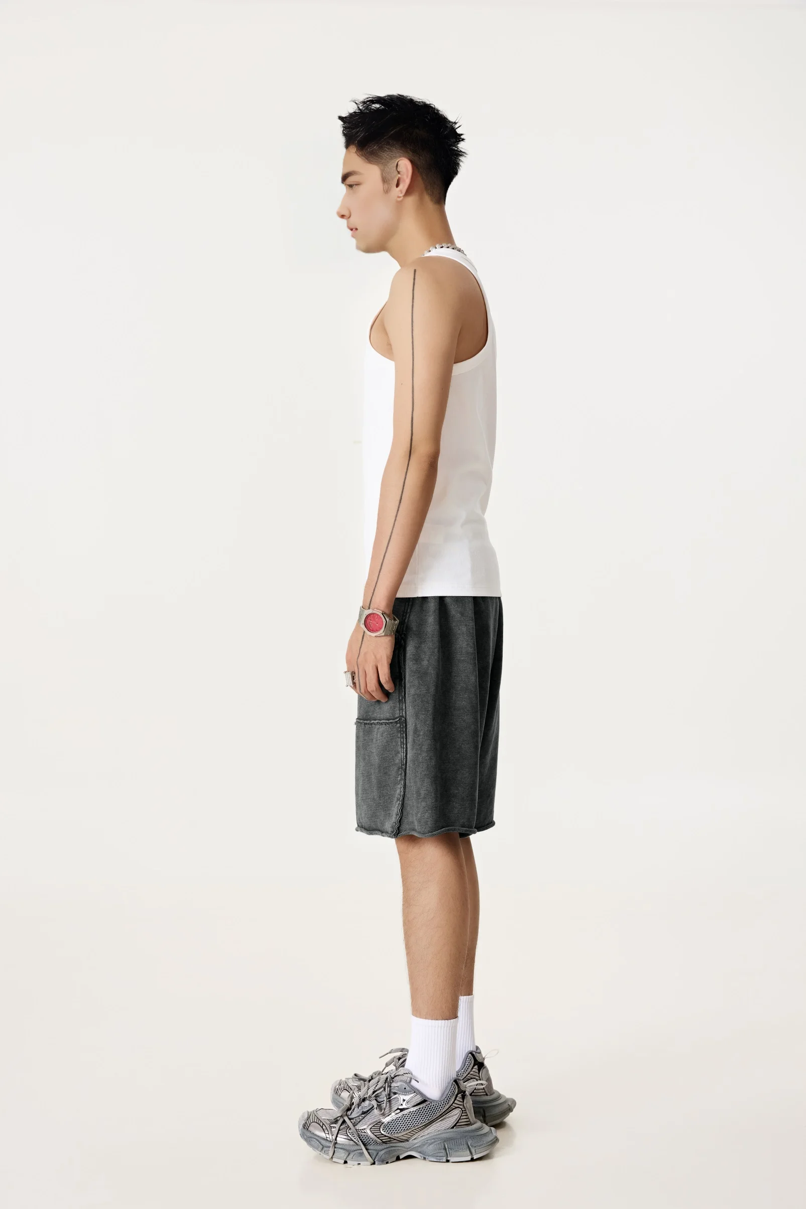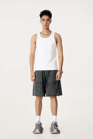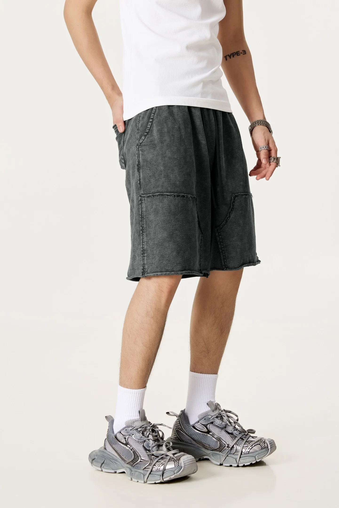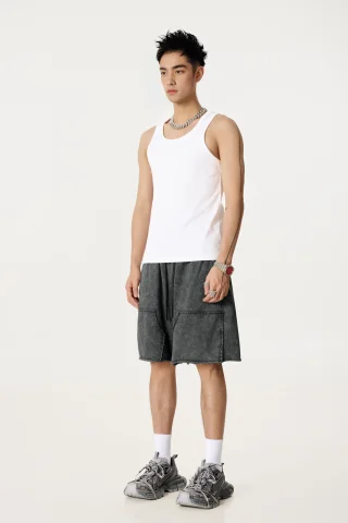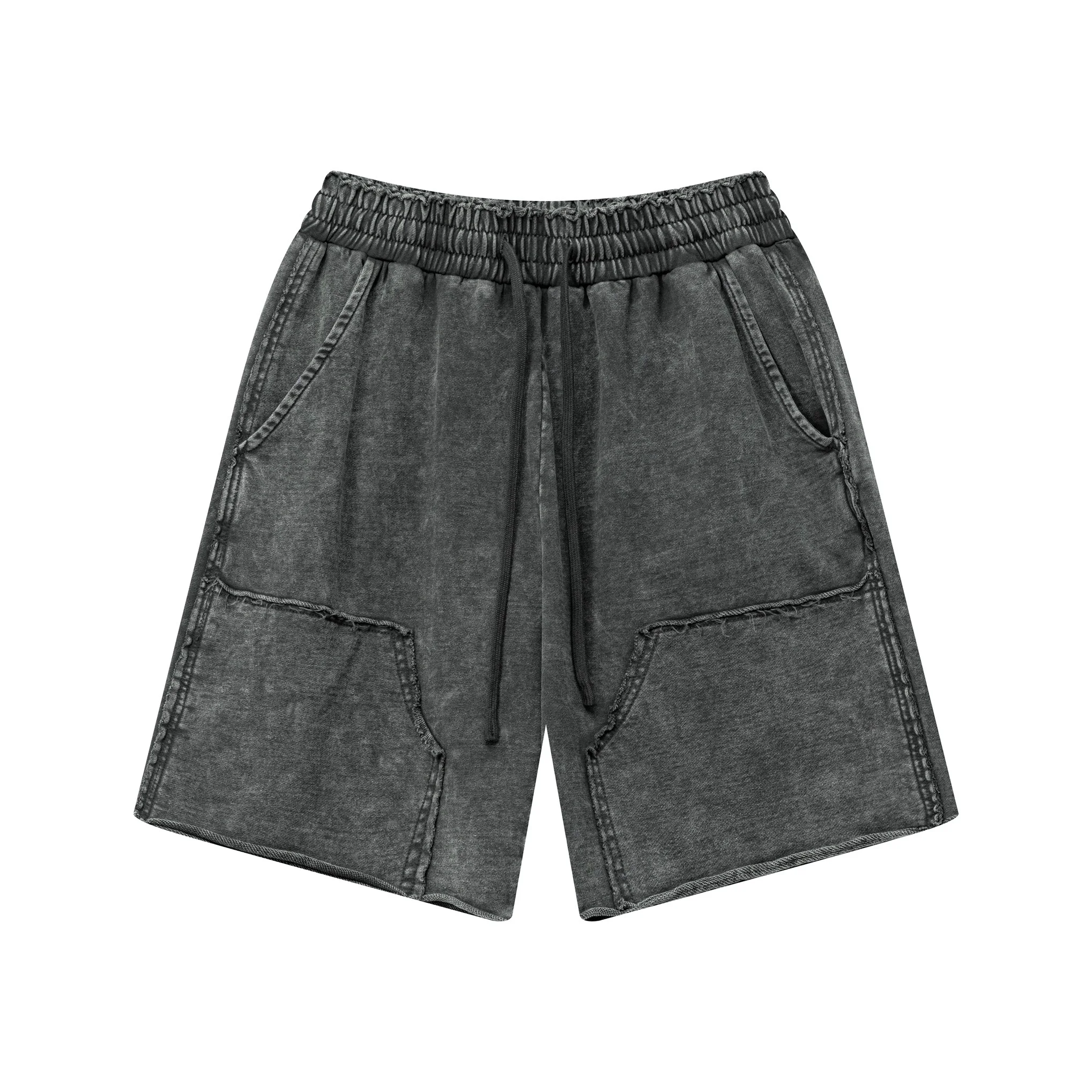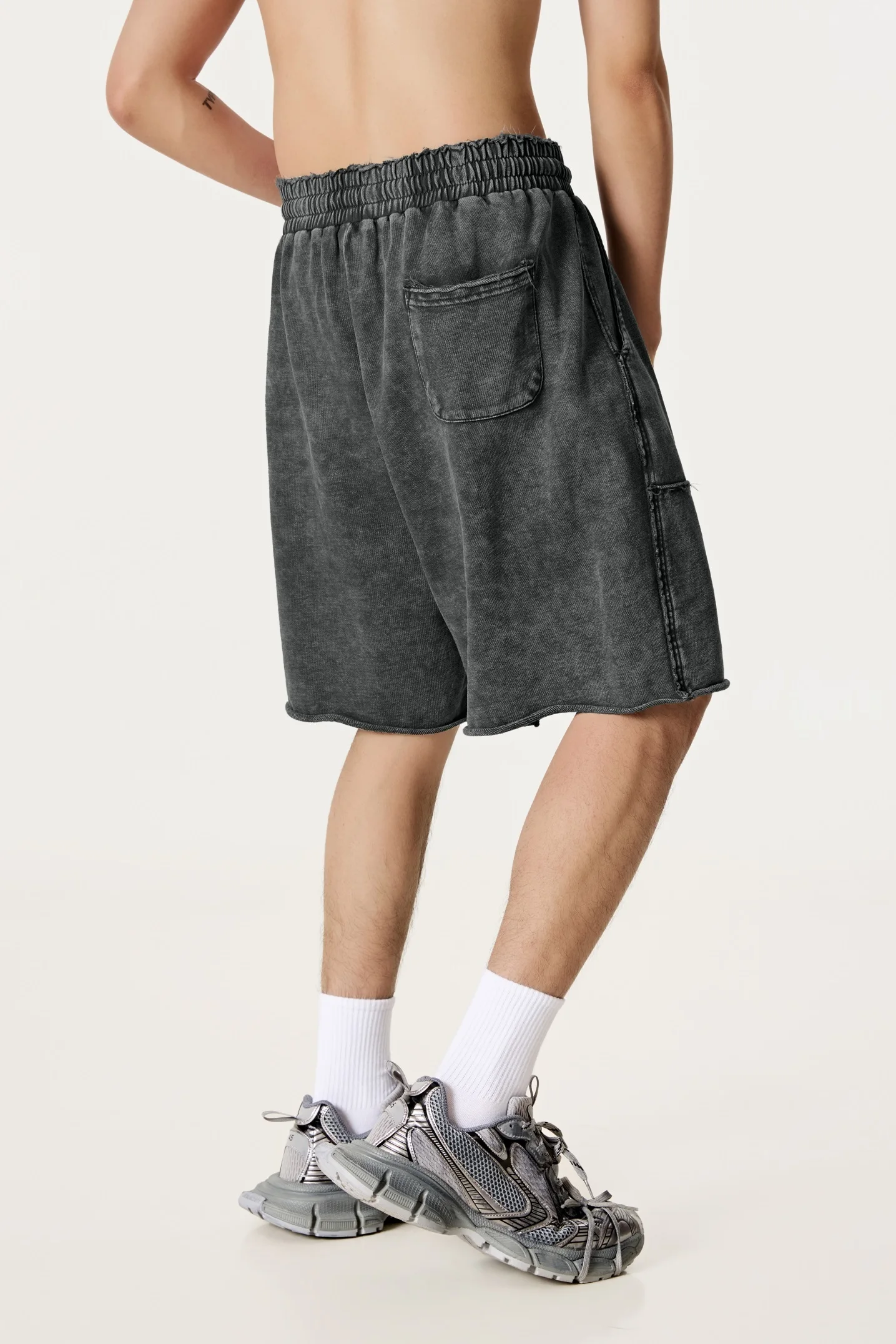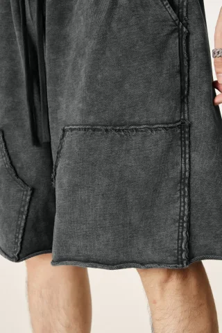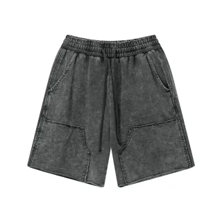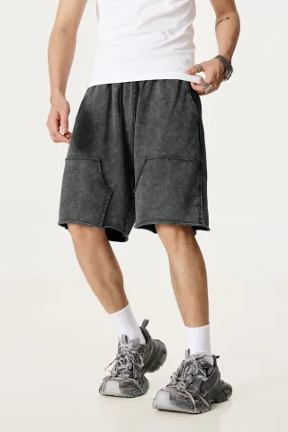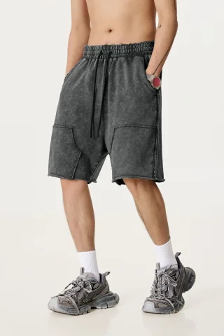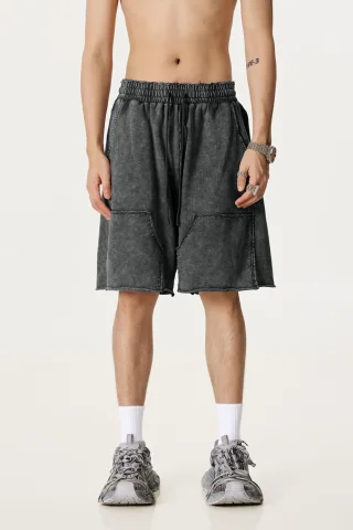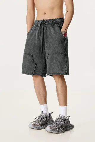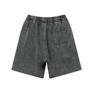 Crafted from 100% cotton wax-dyed beefy fabric (330g), these shorts are soft, breathable, and highly durable, resisting wear and maintaining color after repeated washes. The heavy wash and snow-wash process creates natural, snow-like faded patterns that develop uniquely with wear. Designed with an elastic waistband, raw-edge cotton drawcord, side-panel accents, and raw-edge hems, offering a relaxed, street-ready fit suitable for casual and athletic collections.