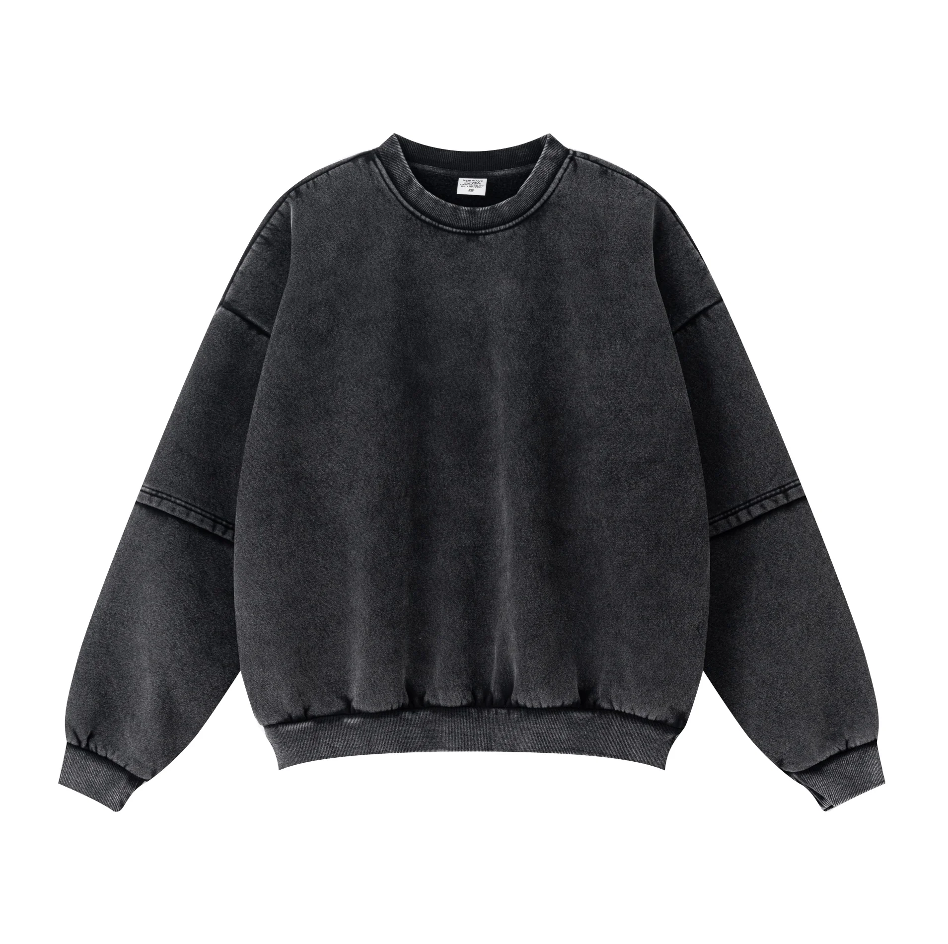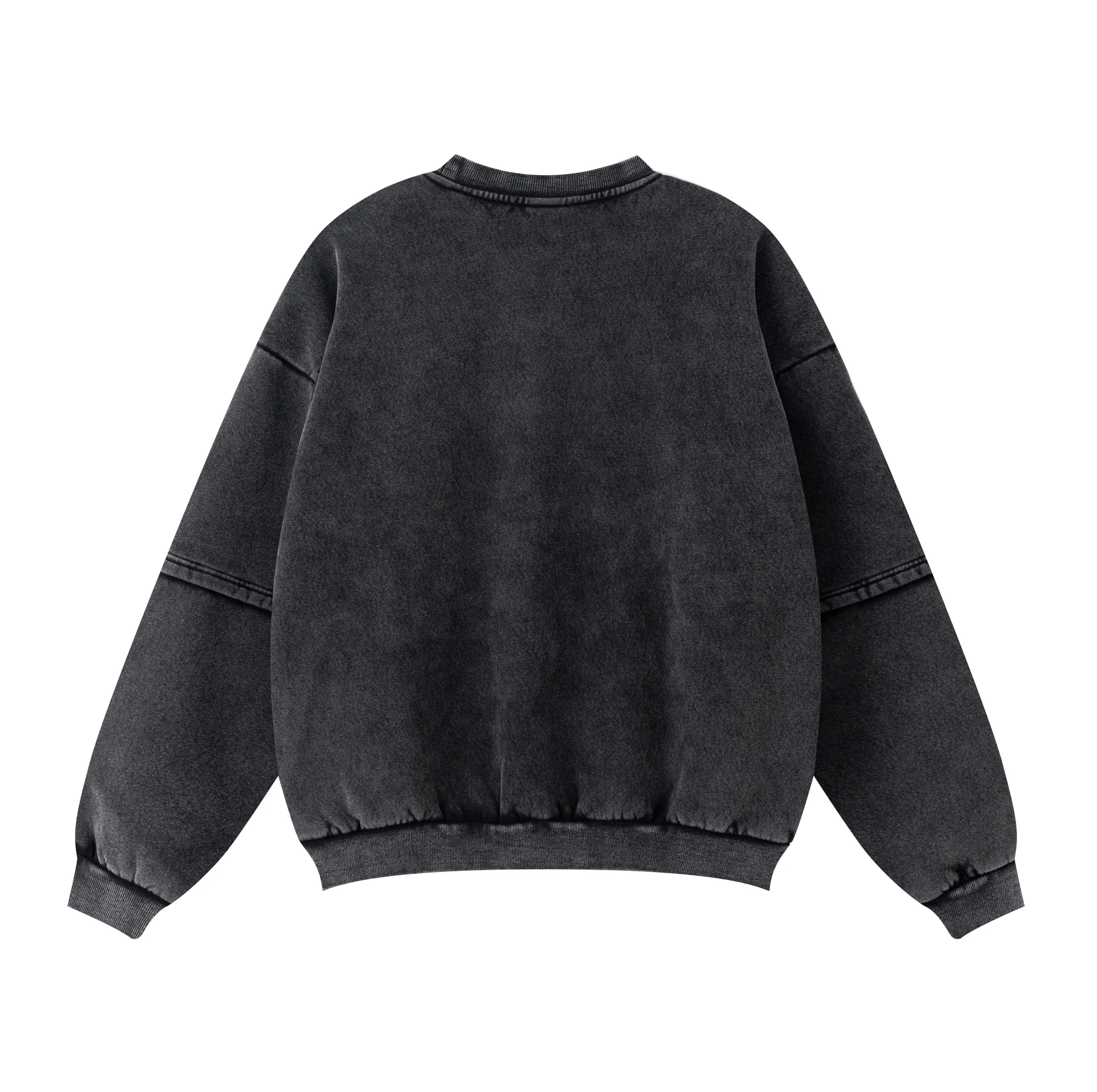 360GSM Unisex Faux-Two-Piece Distressed Snow-Wash Fleece-Lined Crew Neck Sweatshirt