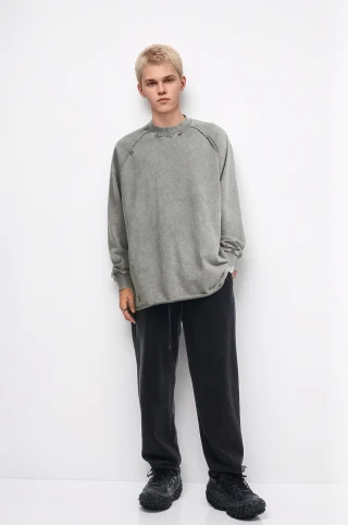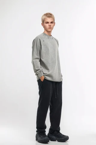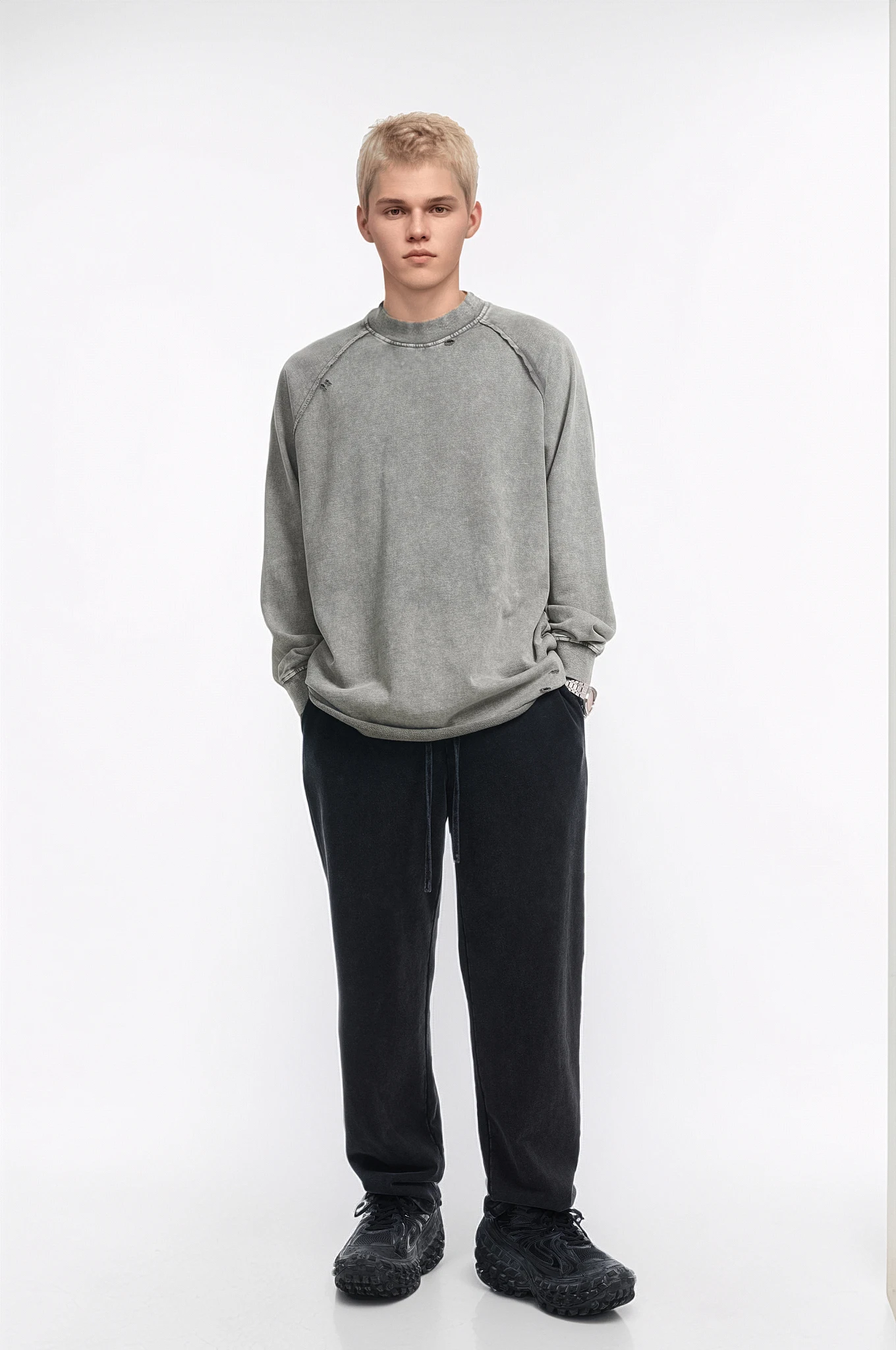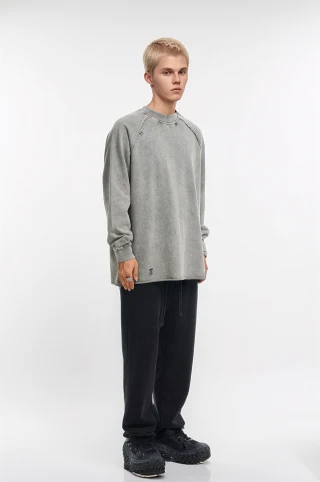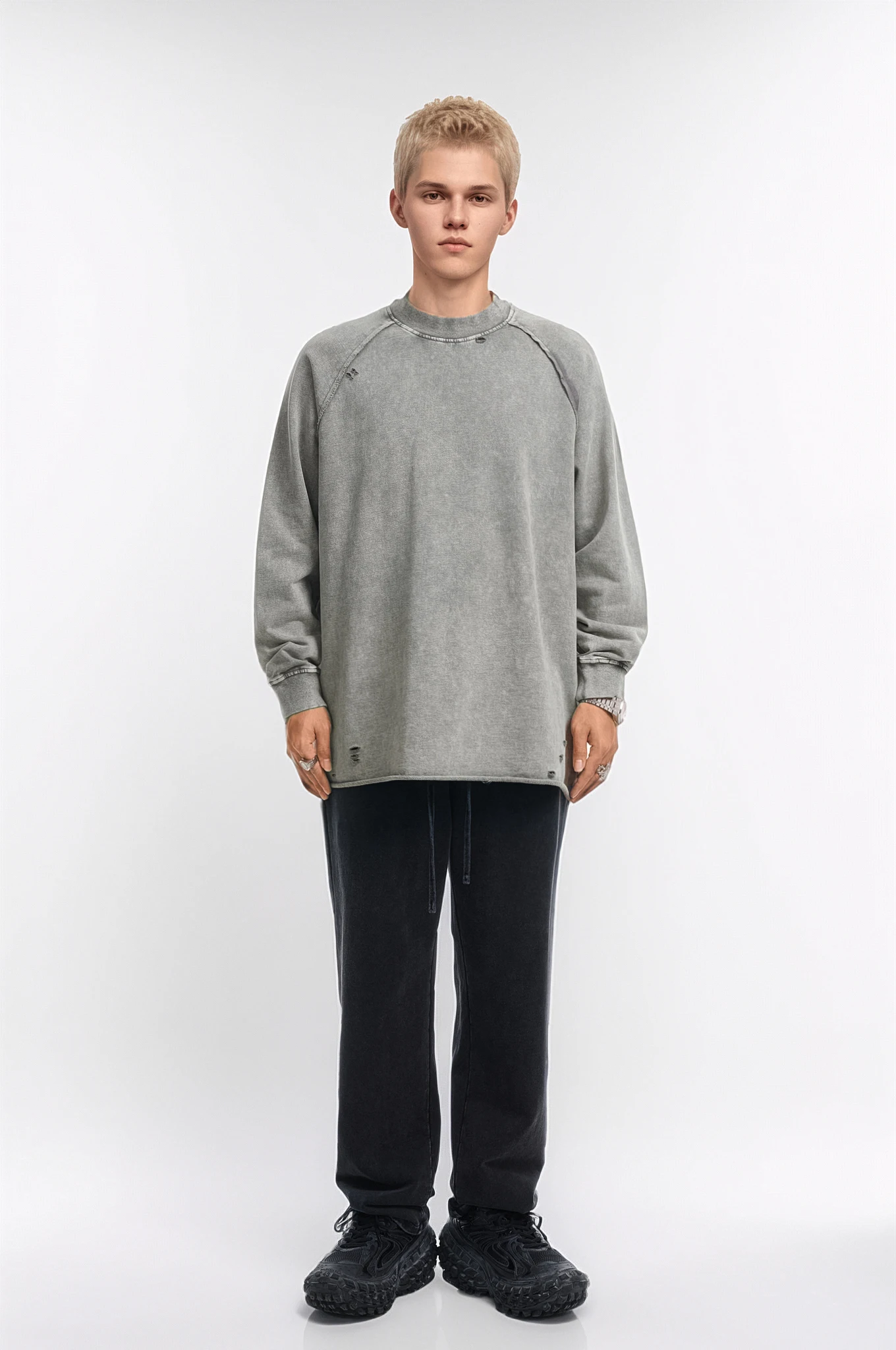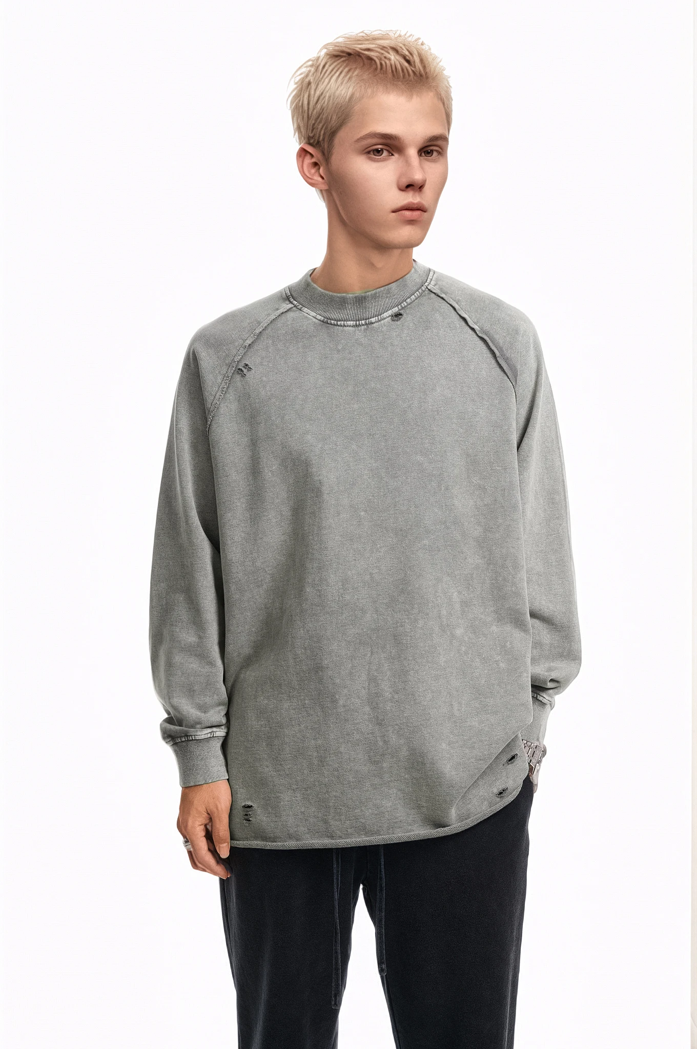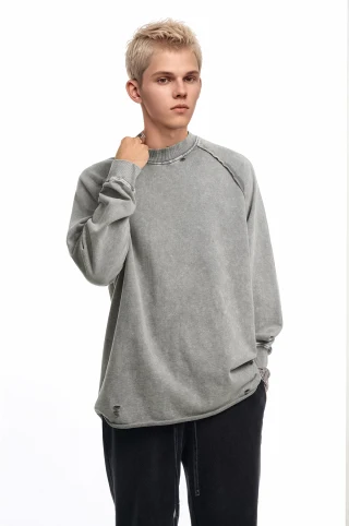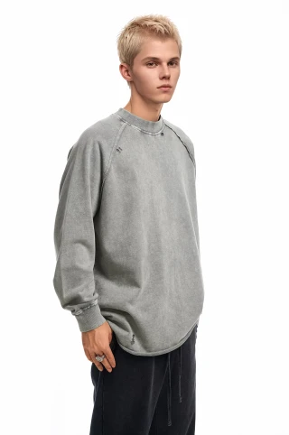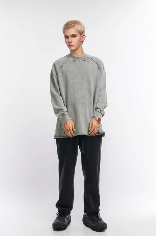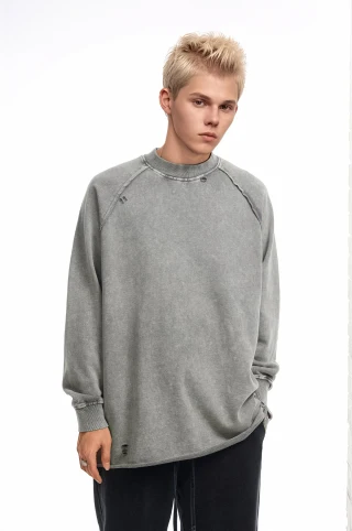 Crafted from 100% cotton heavyweight sweatshirt fabric, this style delivers a structured yet comfortable silhouette with a naturally vintage finish. The raglan-sleeve design with raw edge cuffs enhances the relaxed streetwear attitude while maintaining a flattering arm line. A distressed front slit detail adds depth and individuality, showcasing an effortless, lived-in aesthetic. The heavy snow-wash treatment creates multi-tonal color layers and a soft, aged hand feel — ideal for brands seeking authentic retro character with modern appeal. Finished with a reinforced cotton herringbone neck tape, ribbed cuffs and hem, and clean, dense stitching for durability and comfort. A statement piece that combines craftsmanship, comfort, and streetwear edge — perfect for premium AW collections or casual fashion lines.
