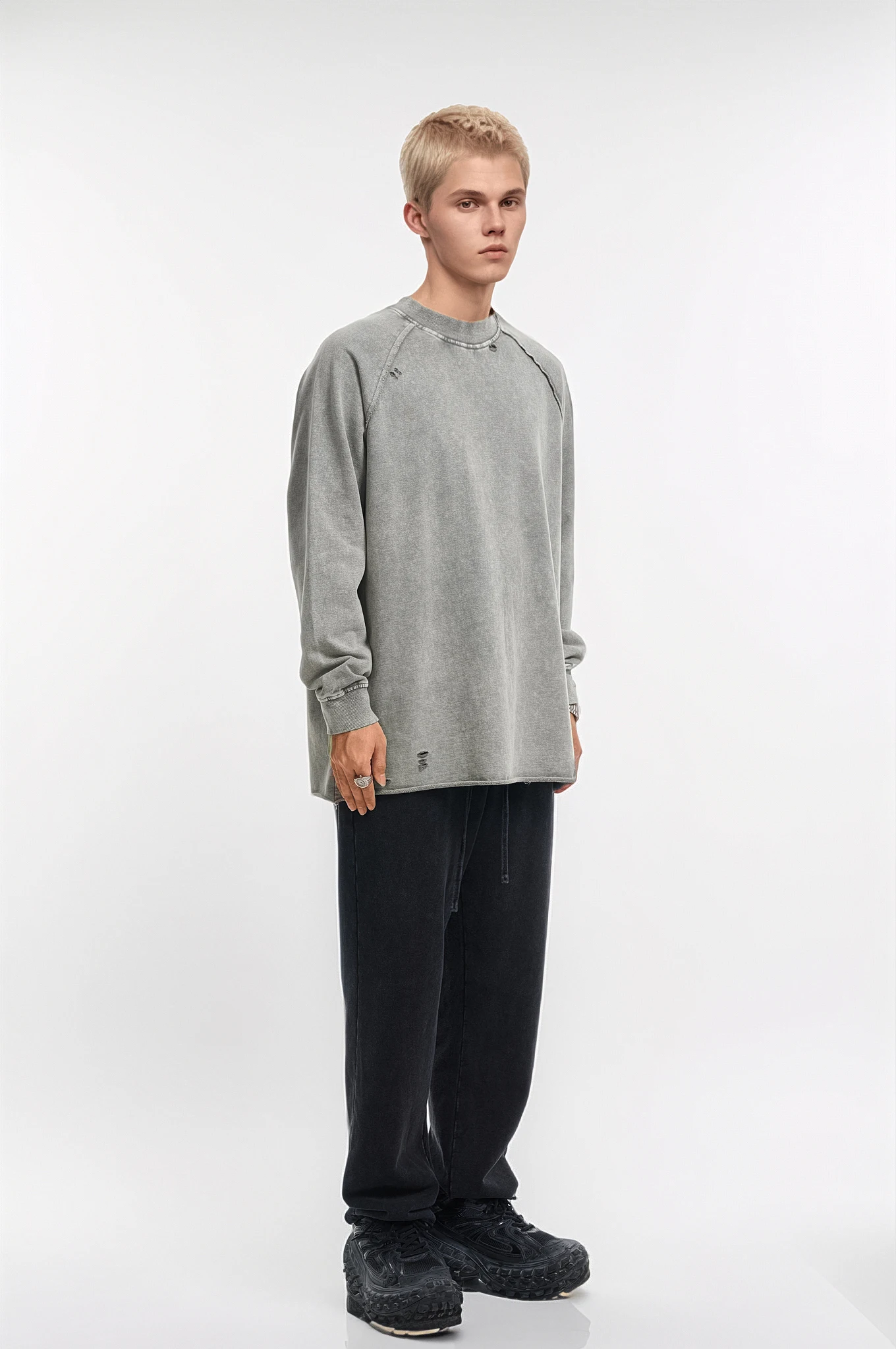 330GSM Unisex Fall/Winter New Distressed Snow-Wash Raglan Sleeves Raw-Edge Long-Sleeve T-shirt