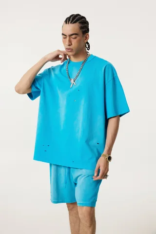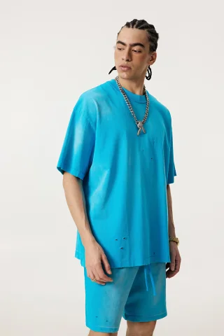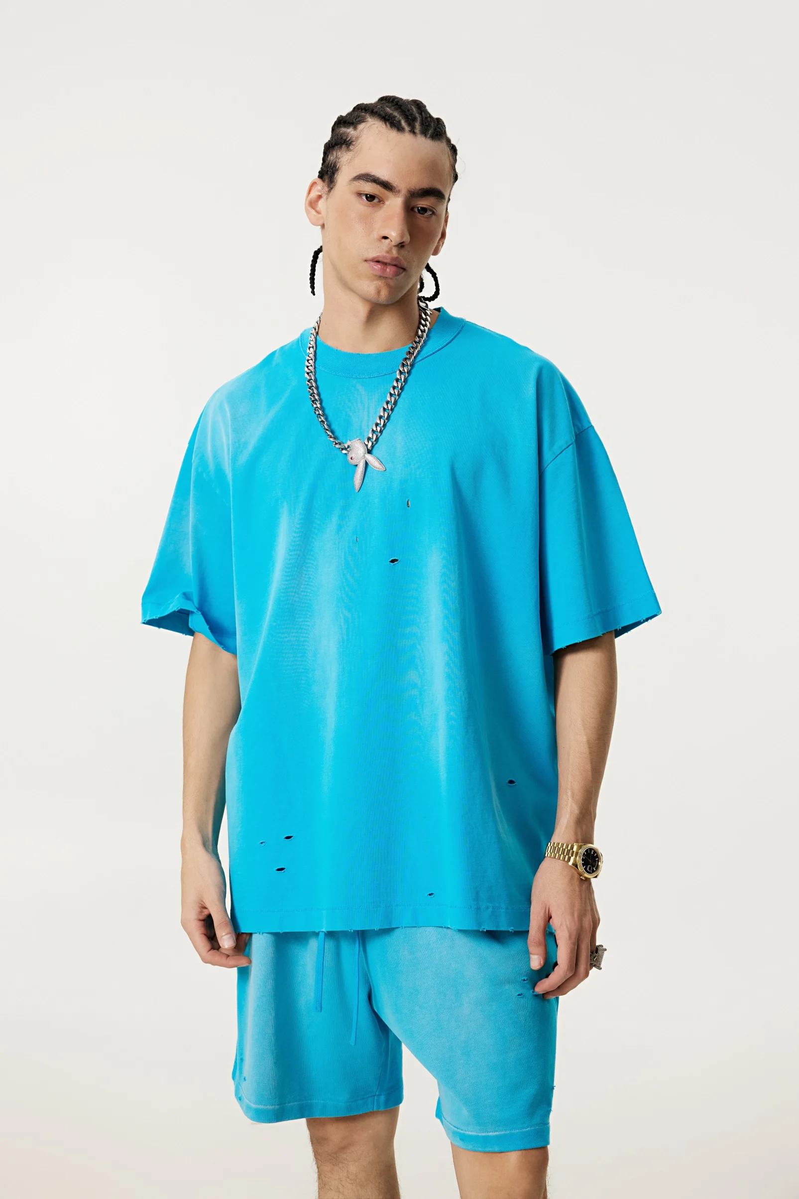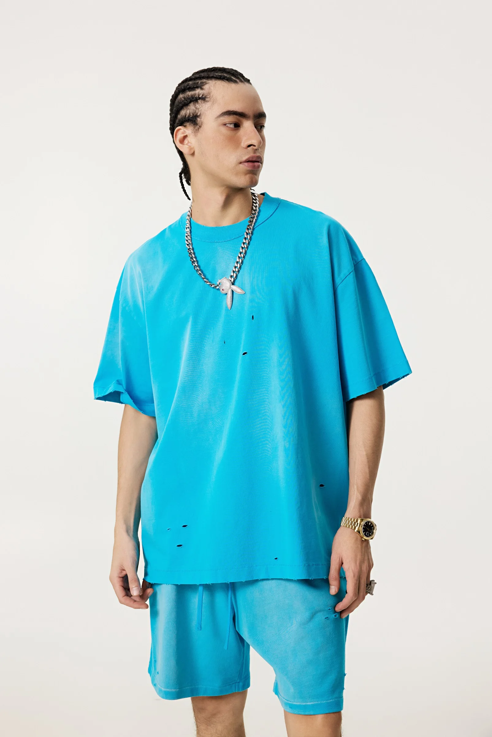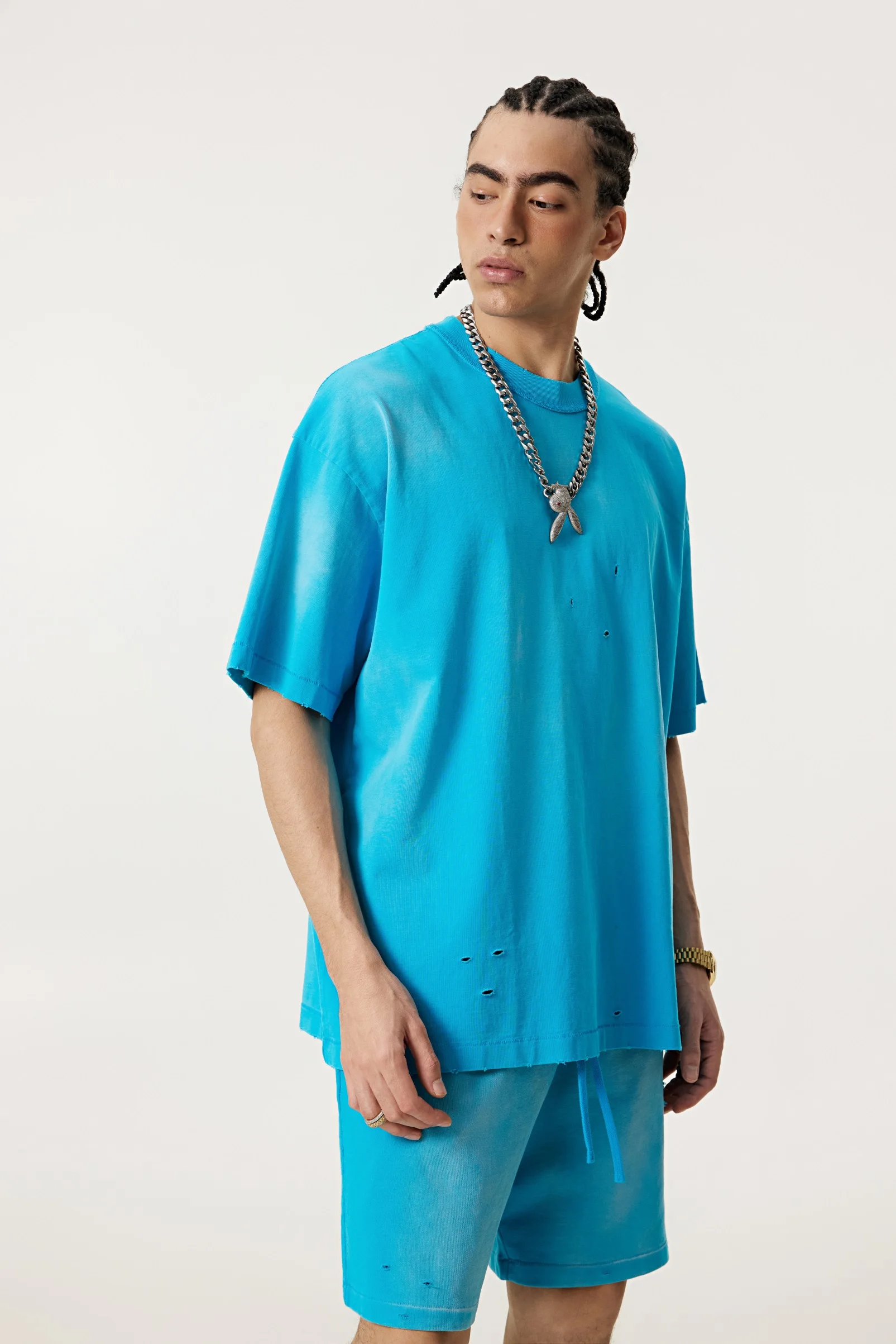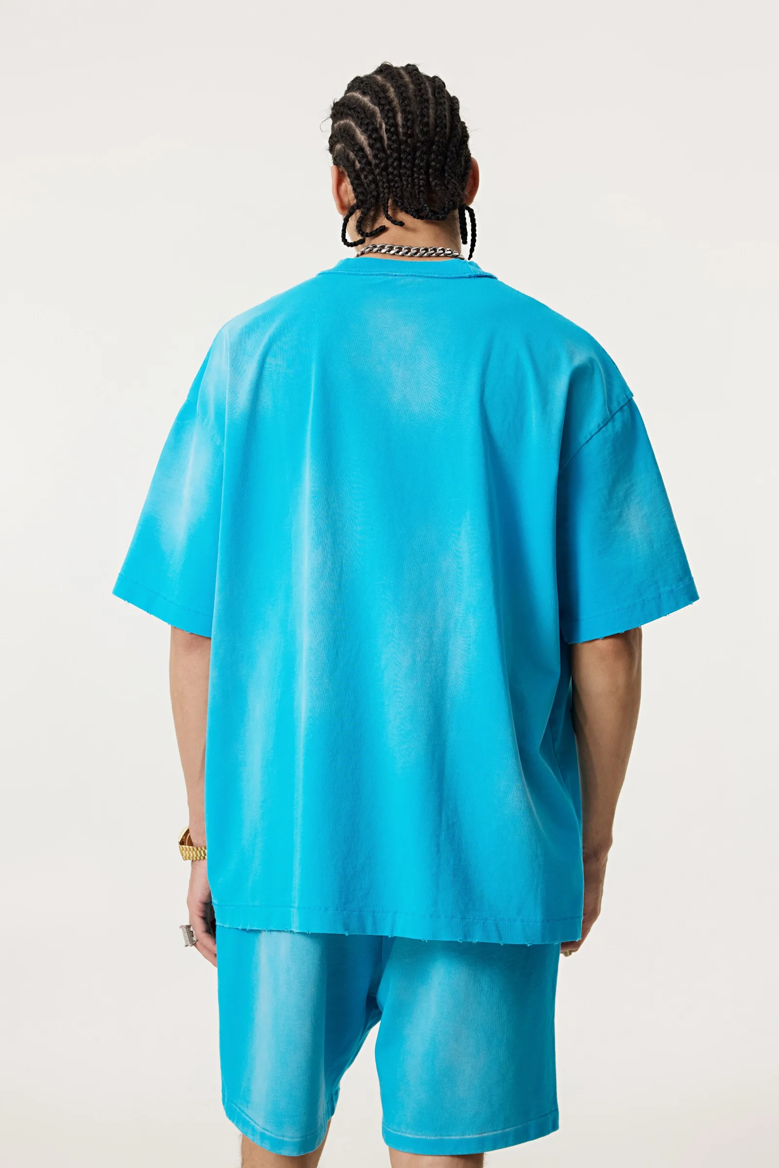285GSM Unisex PP-Sprayed (Monkey Wash) Ripped Raw-Edge Short-Sleeve T-shirt