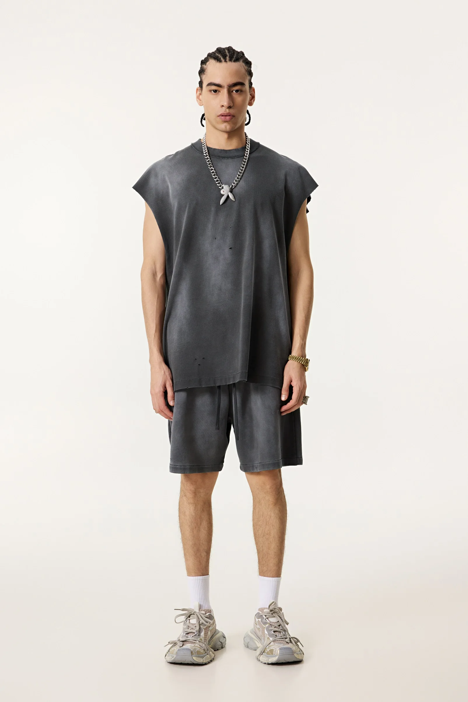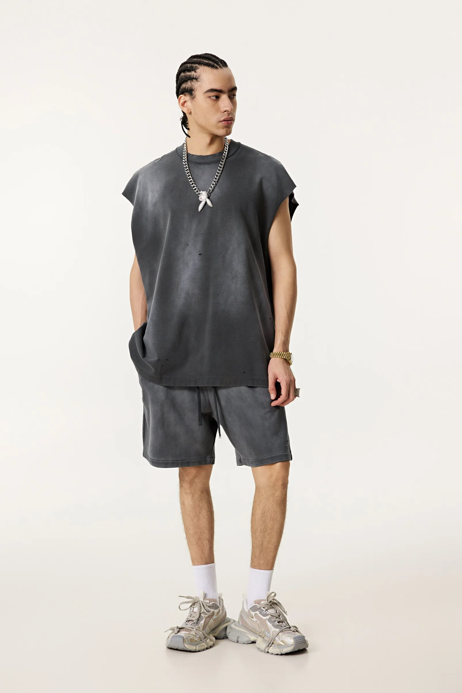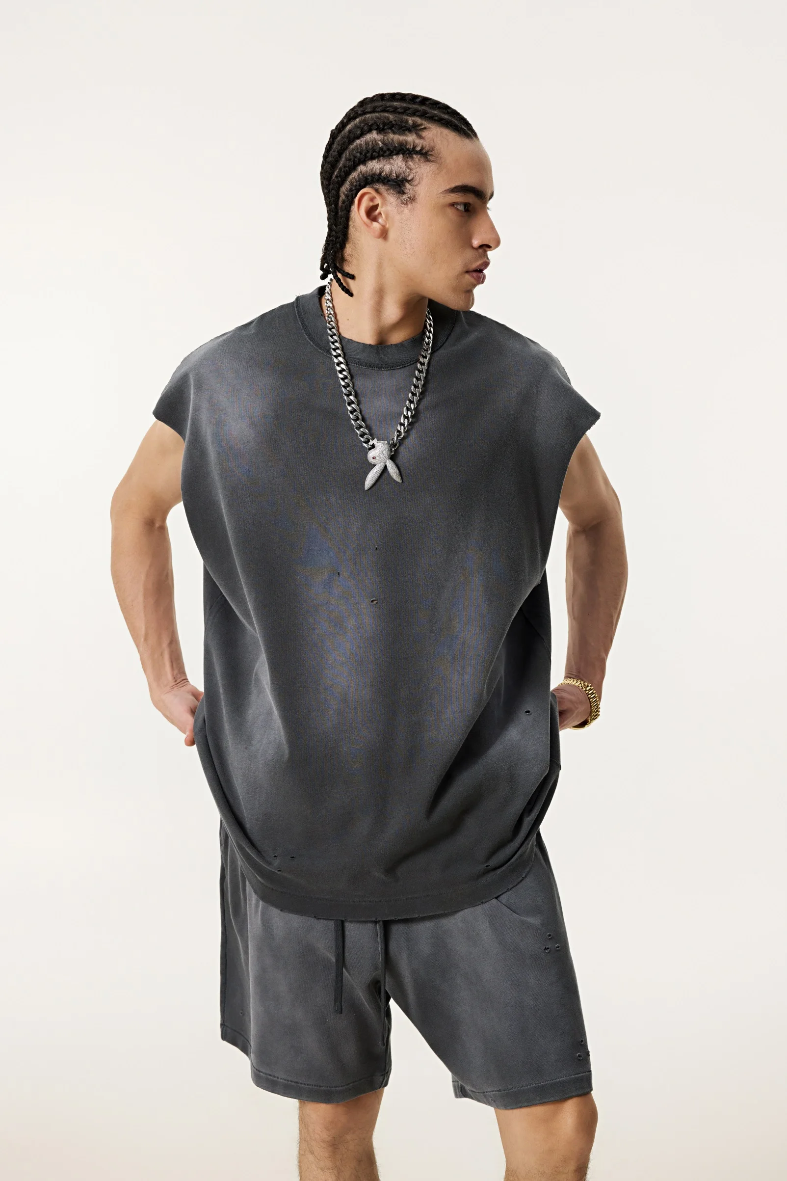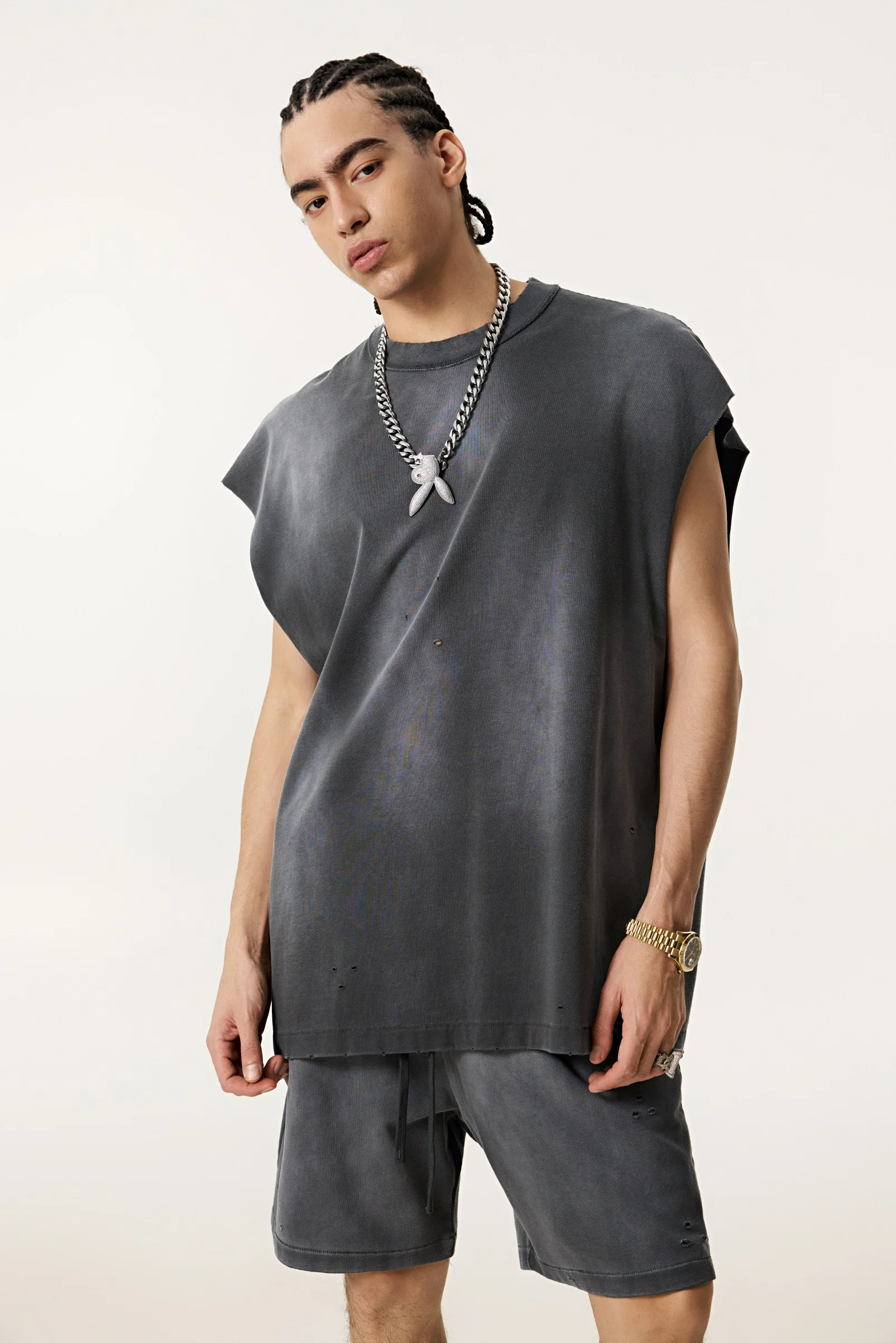 285GSM Unisex Monkey-Wash PP Spray Distressed Sleeveless Top