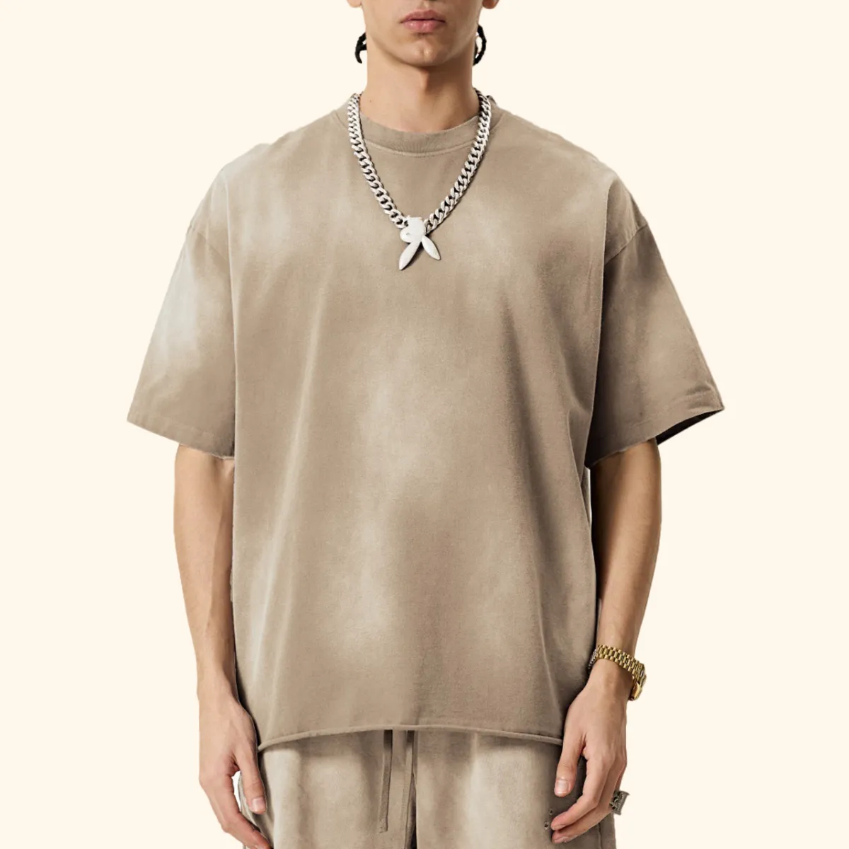 Crafted from 100% double-yarn cotton plain weave, 285gsm fabric offers breathability, softness, and shrink resistance. The set features vintage spray-wash and distressed detailing with deliberate holes and frayed edges for a naturally faded, retro look. Attention to detail includes 1x1 ribbed collars for shape retention, neat and secure stitching, and reinforced hems. Available in 7 colors, this matching set combines style, durability, and nostalgic appeal—ideal for premium retail or customization.