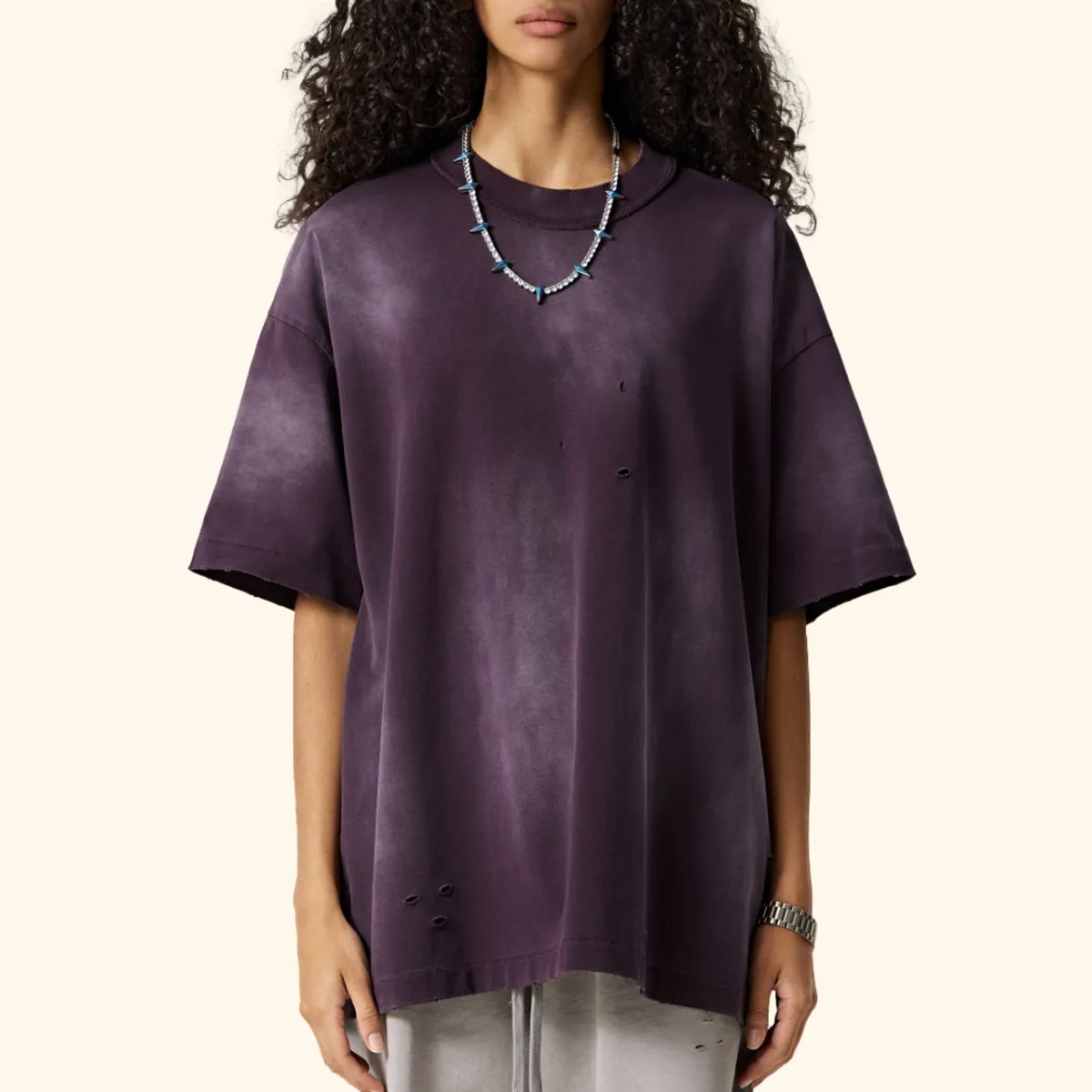 285GSM Women's Monkey-Wash PP Spray Ripped Raw-Edge Short Sleeve T-shirt