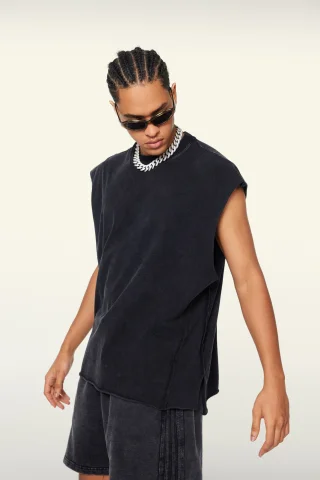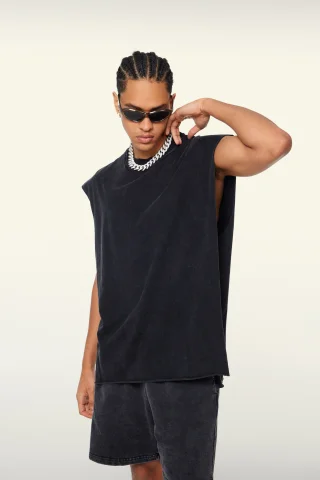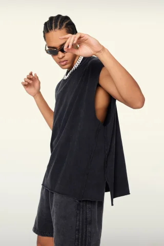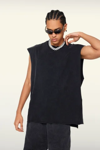 This 270GSM crewneck tank is made from soft, 100% cotton with a vintage wash for a relaxed, lived-in feel. The high neck creates a flattering silhouette, while the loose fit and raw-edged details add a stylish, casual touch. The split hem design (short front, longer back) enhances your shape, making it a versatile piece for any wardrobe. Perfect for effortless, everyday wear.