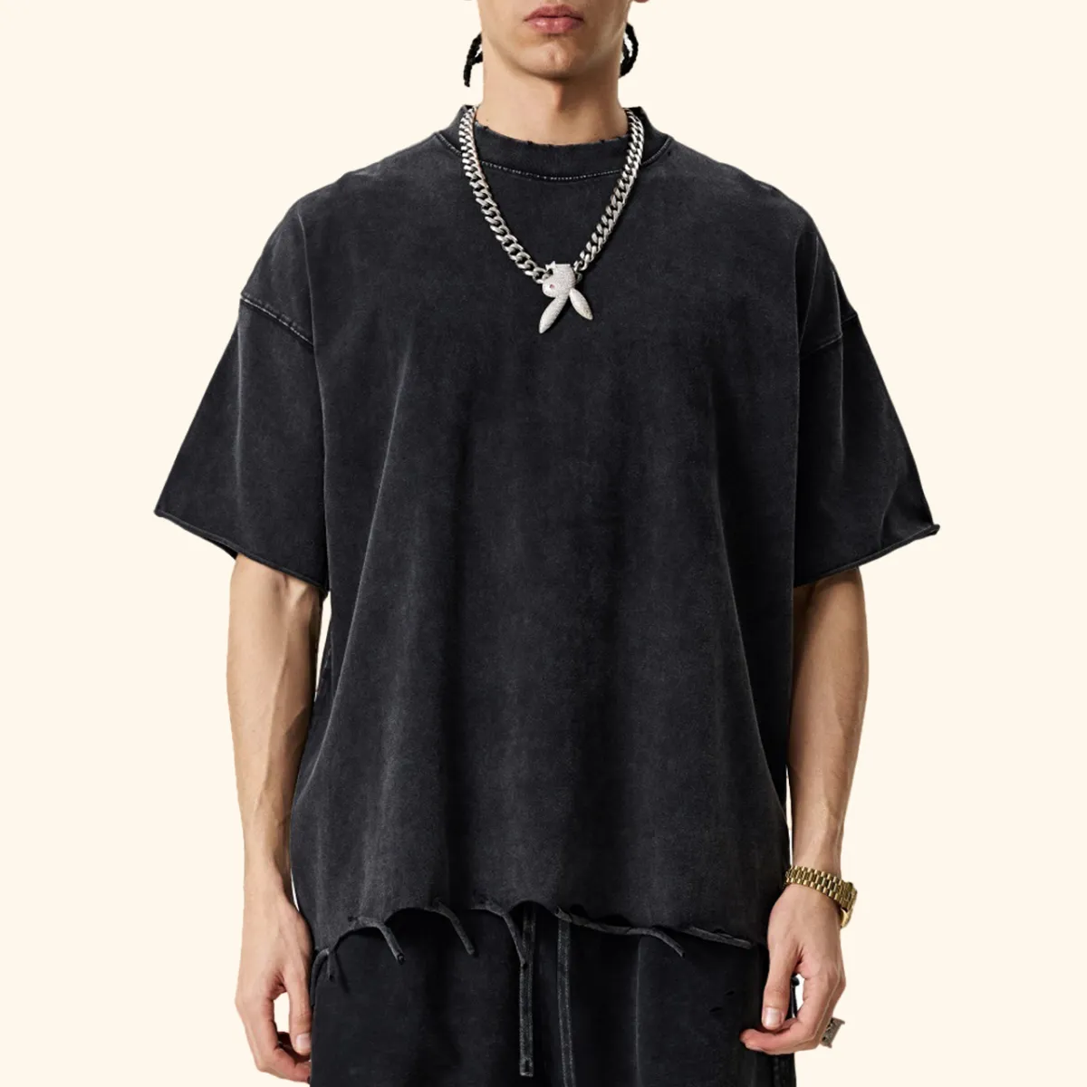275GSM Unisex Raw-Edge Reverse-Wash Fried-Color Short-Sleeve T-shirt