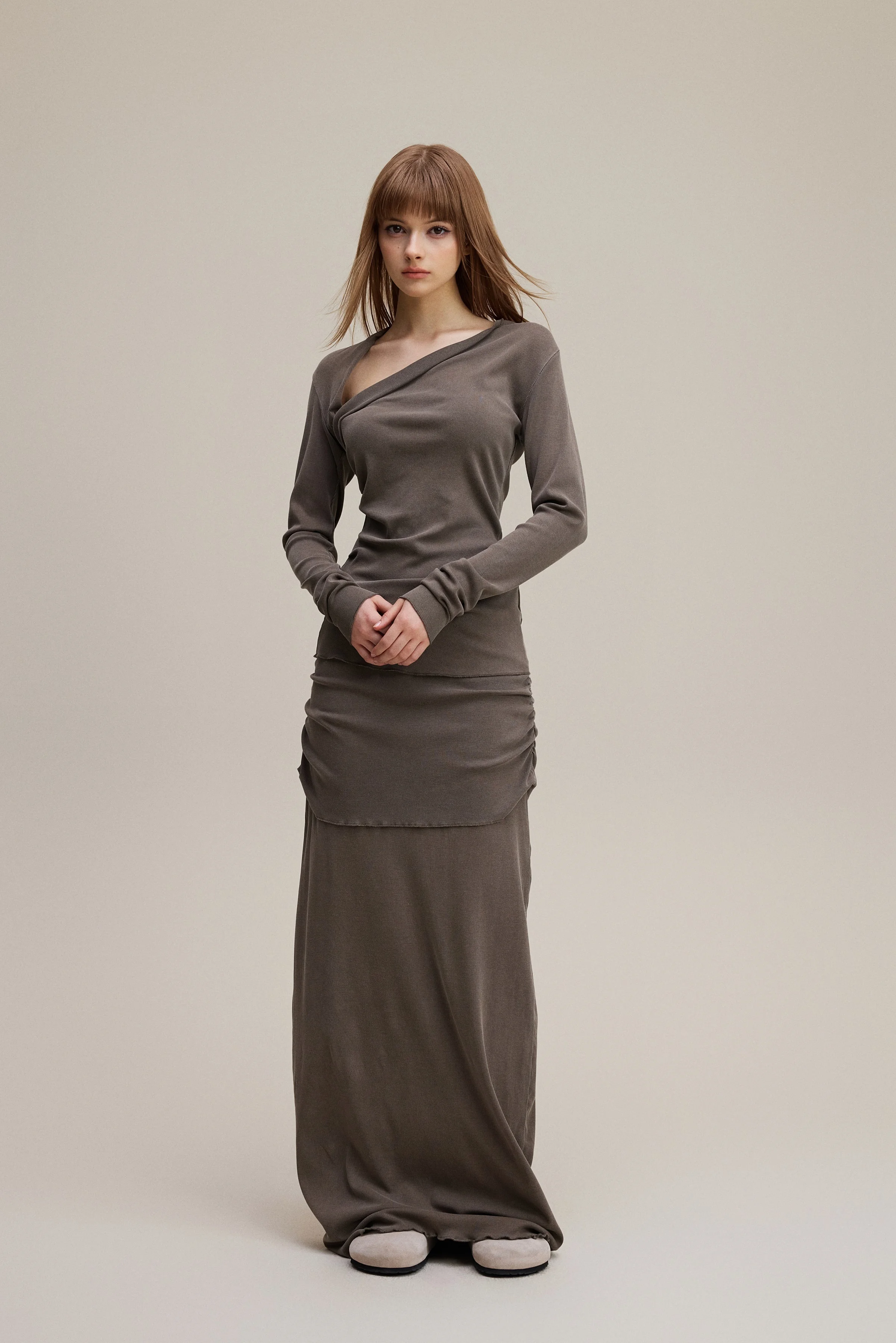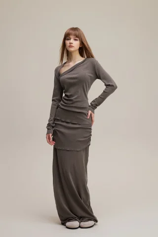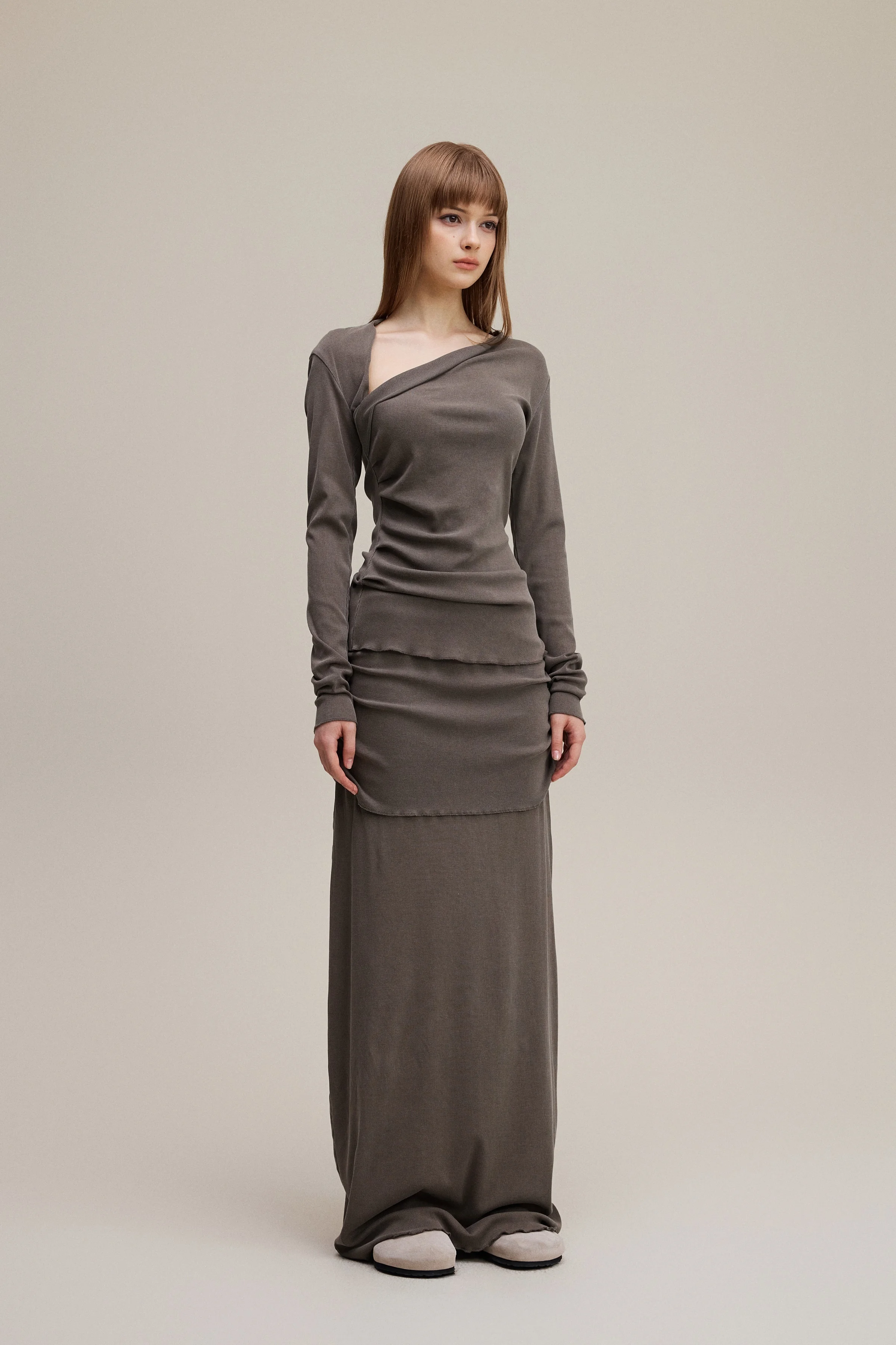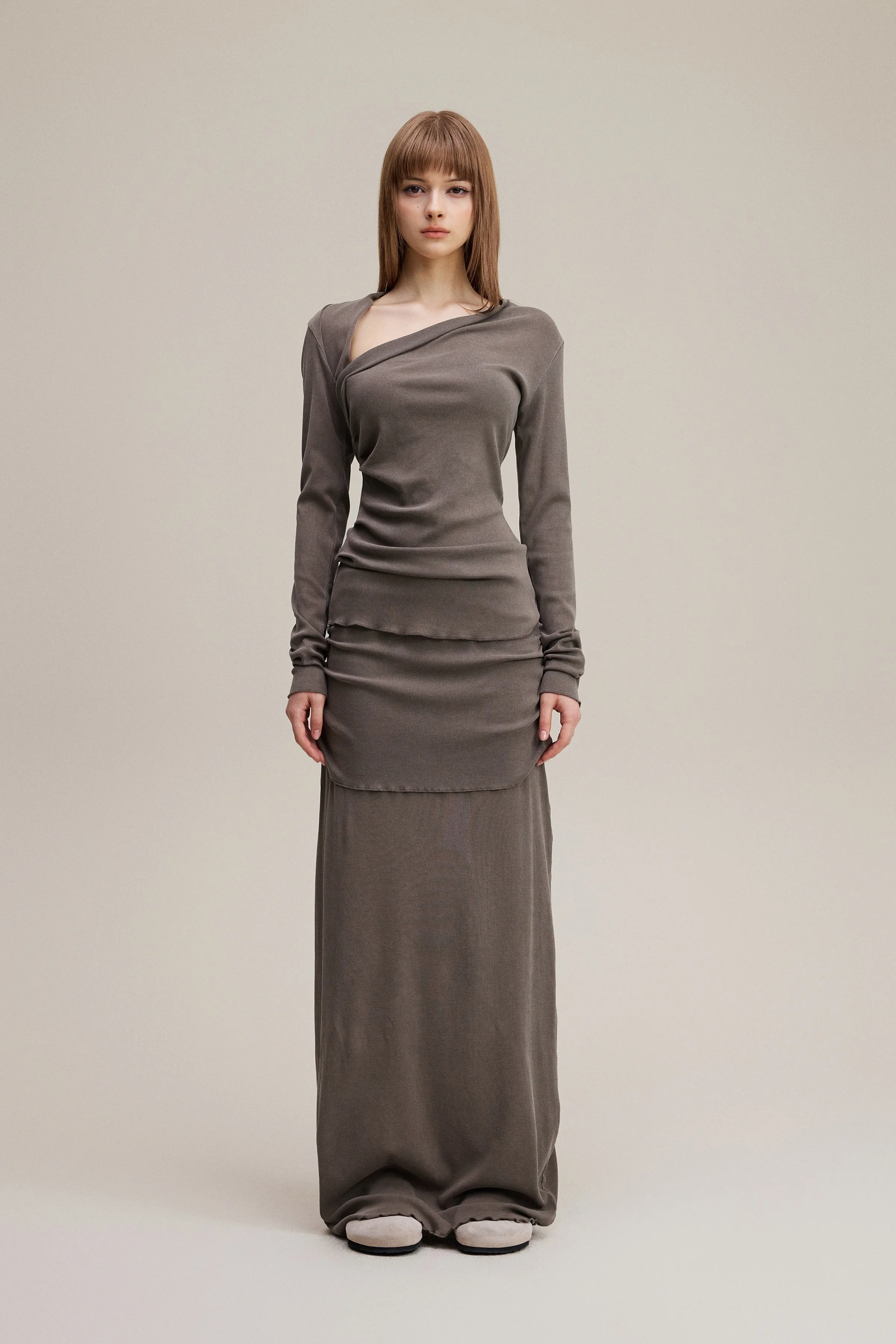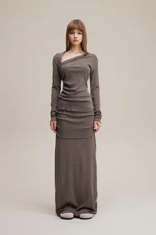 Made with 275GSM natural fiber cotton that stays soft and smooth after repeated washing. Asymmetric off shoulder neckline highlights the collarbone and creates a slimmer upper body line. Forward side seams shape the waist, while the curved back hem adds a flattering finish. Washed with a 12 step vintage process for a matte tone and natural texture on every piece—ideal for elevated daily wear and light occasion styling.
