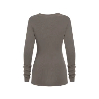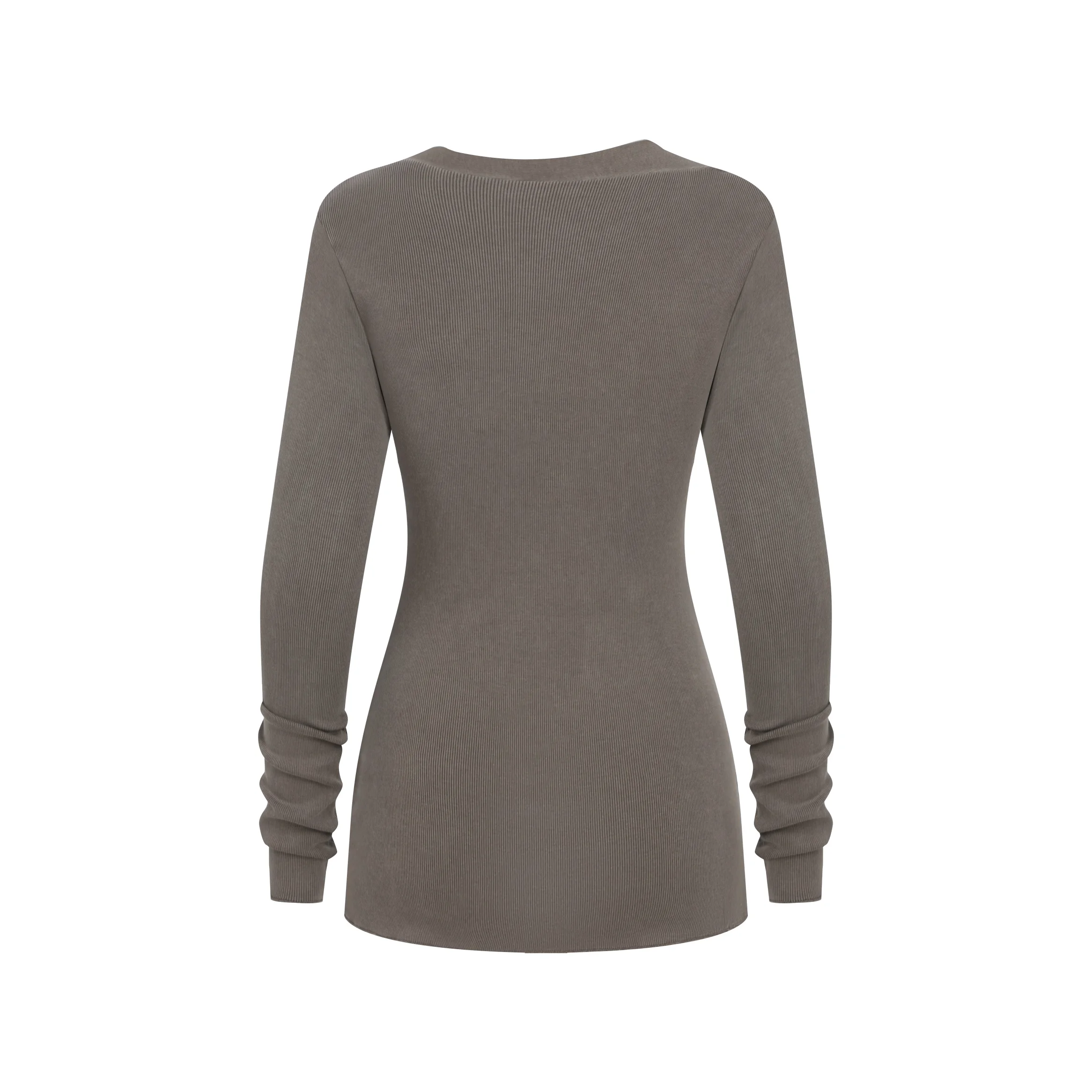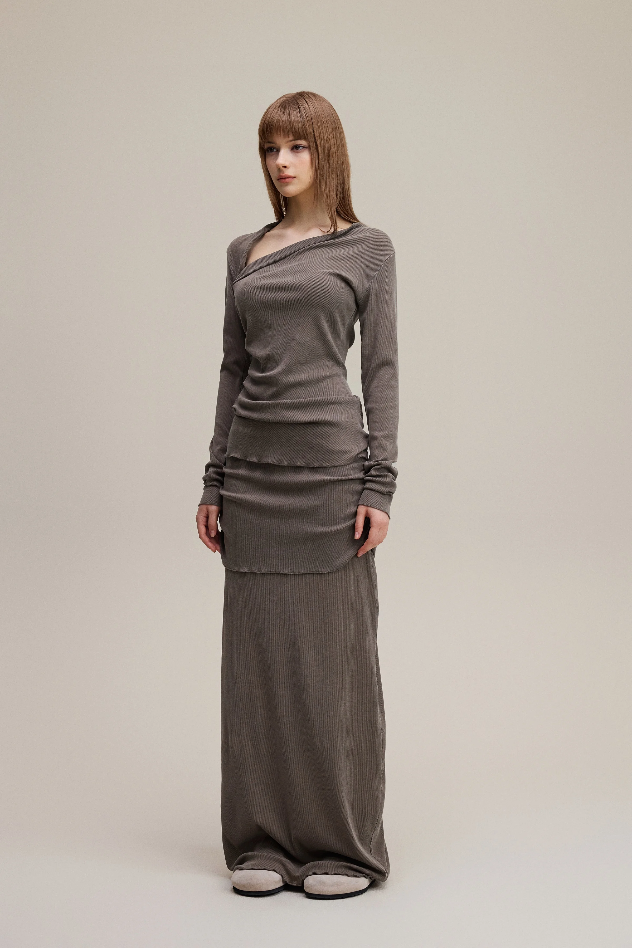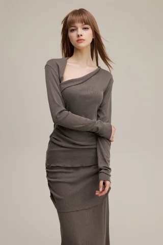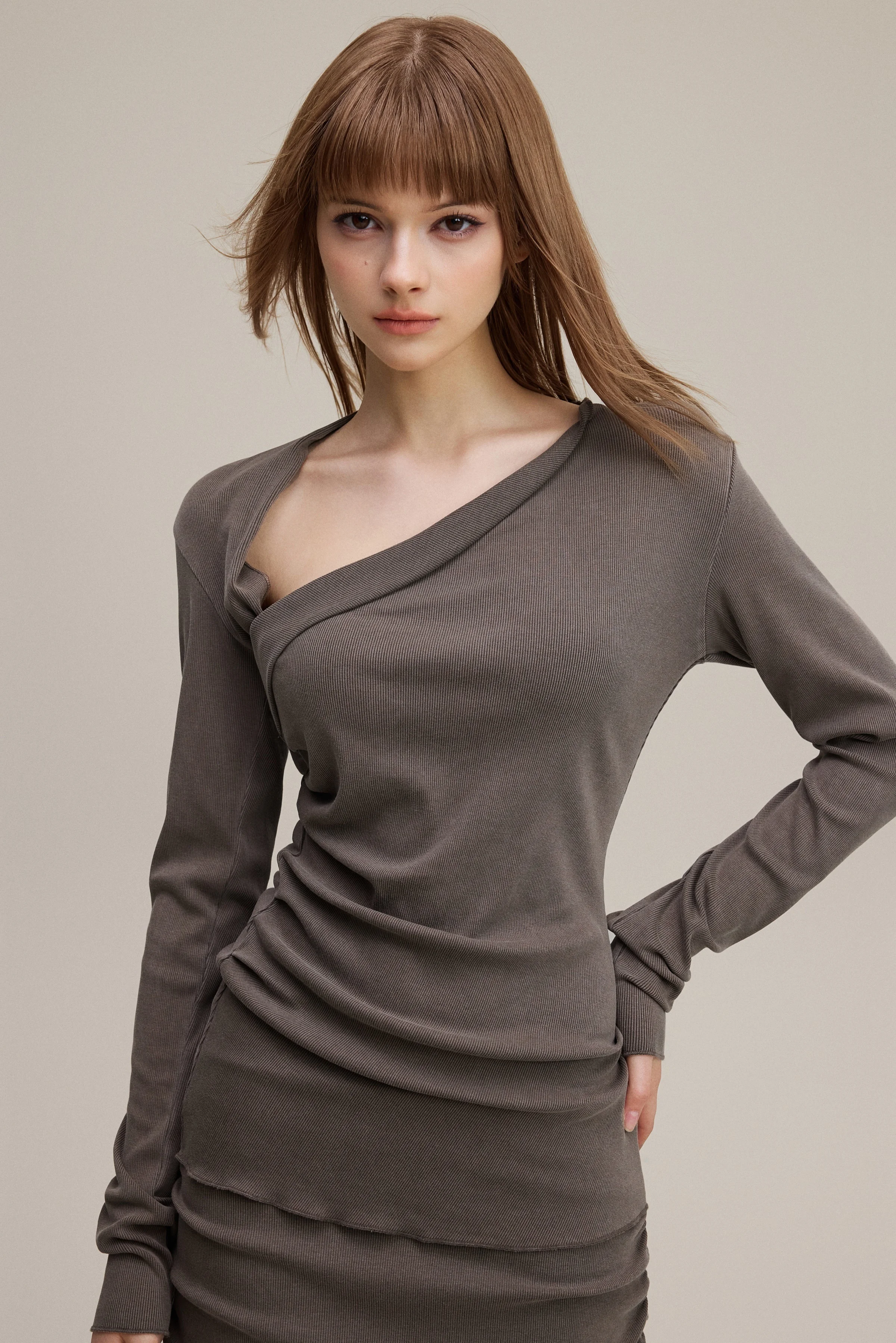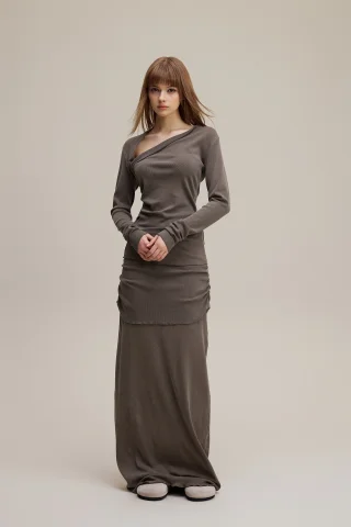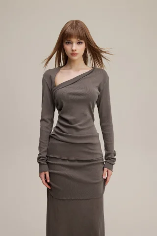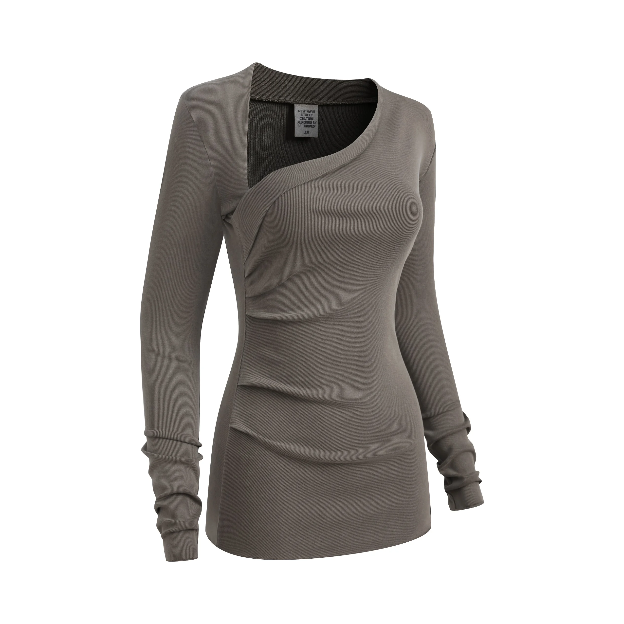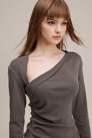 275GSM Women’s Slim-Fit Asymmetrical Shoulder Pigment-Wash Long-Sleeve Top