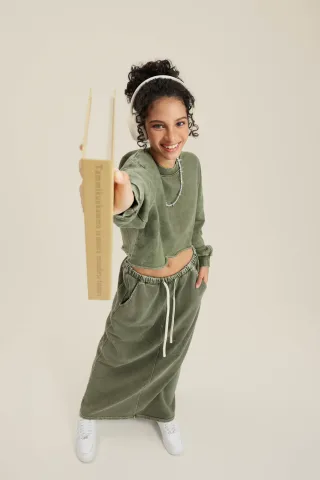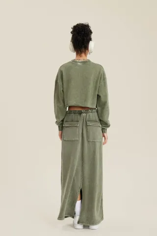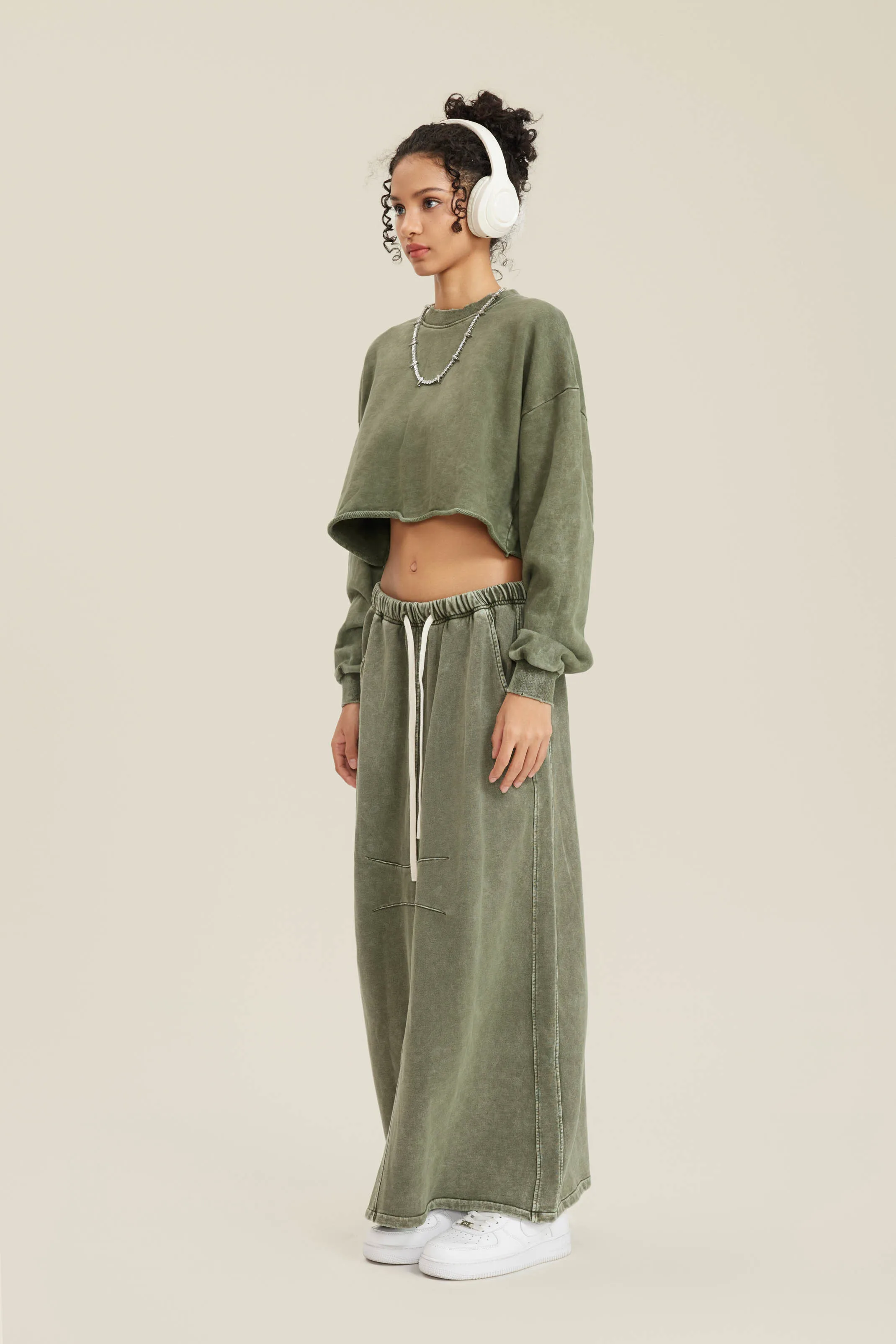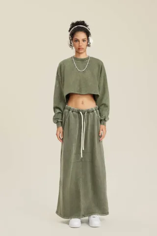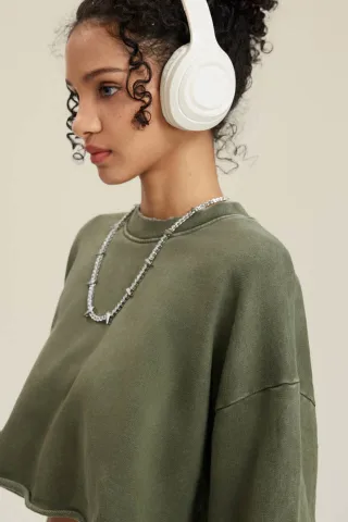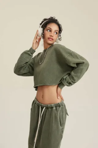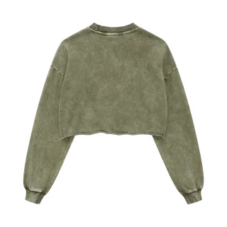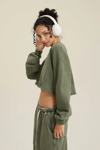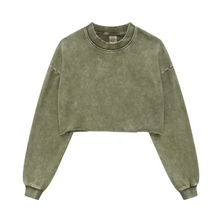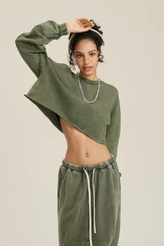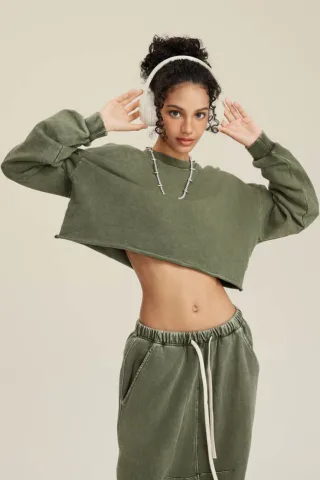 Made with 380GSM 100% heavyweight cotton with natural texture for a breathable yet structured feel. Acid wash dyeing creates rich tonal depth with unique vintage patterns, paired with subtle abrasion for an authentic worn-in look. Boxy cropped silhouette lifts the waistline for a longer-leg effect, while the relaxed fit and slight drop shoulder enhance comfort and flatter different body shapes. Thick double-needle rib neckline maintains structure without constriction. Raw edge detailing adds a handcrafted touch and reinforces the retro workwear attitude. Ideal for streetwear-driven customers seeking character, texture, and lasting shape retention.