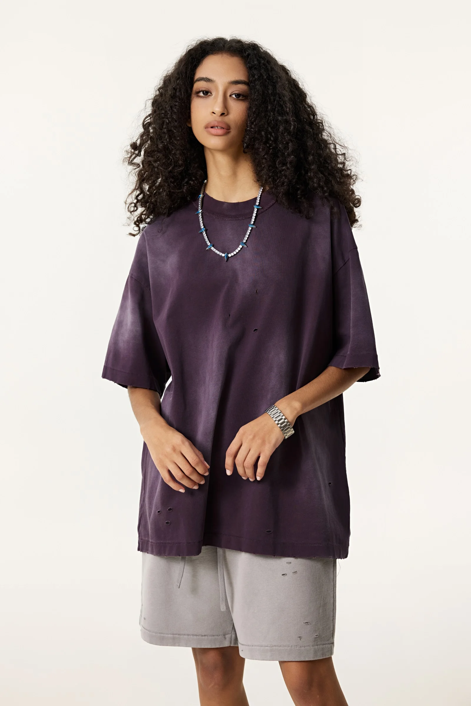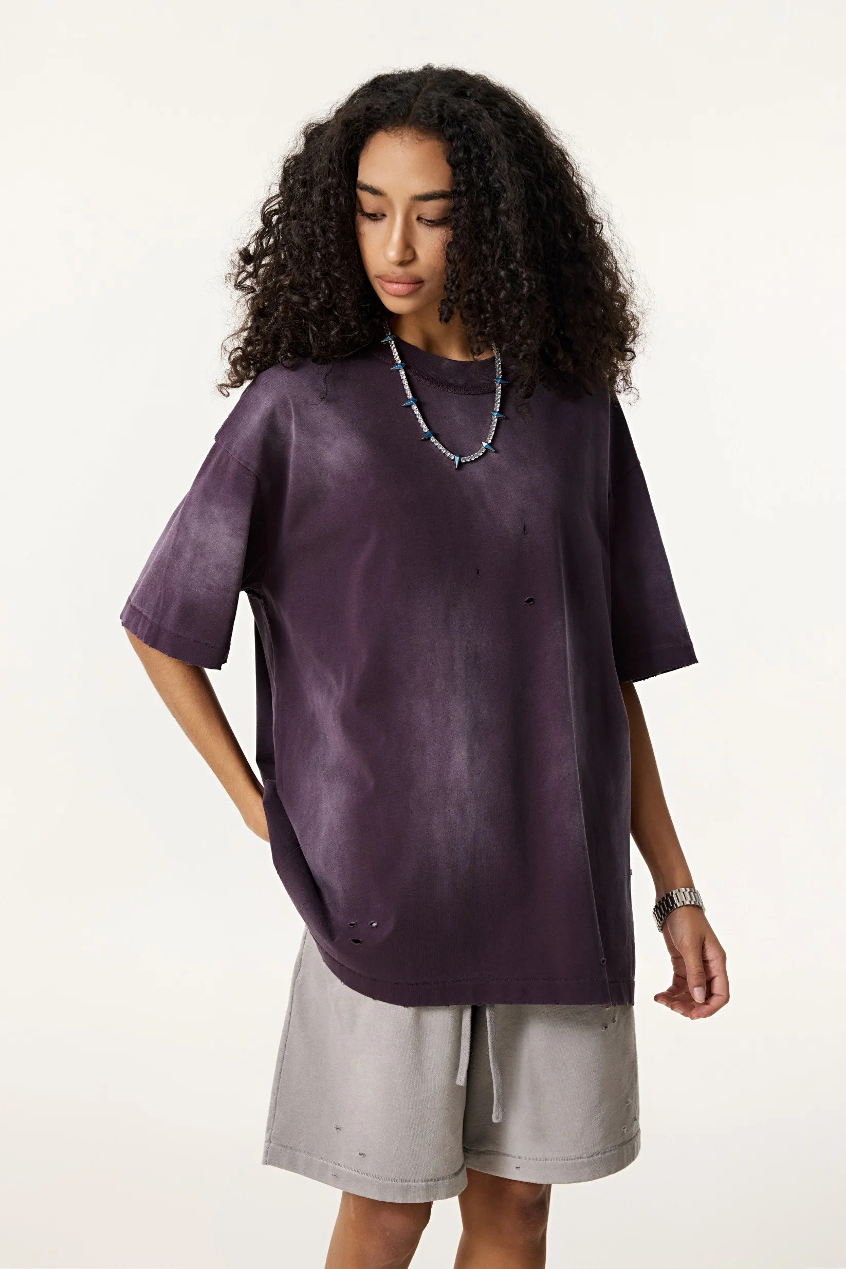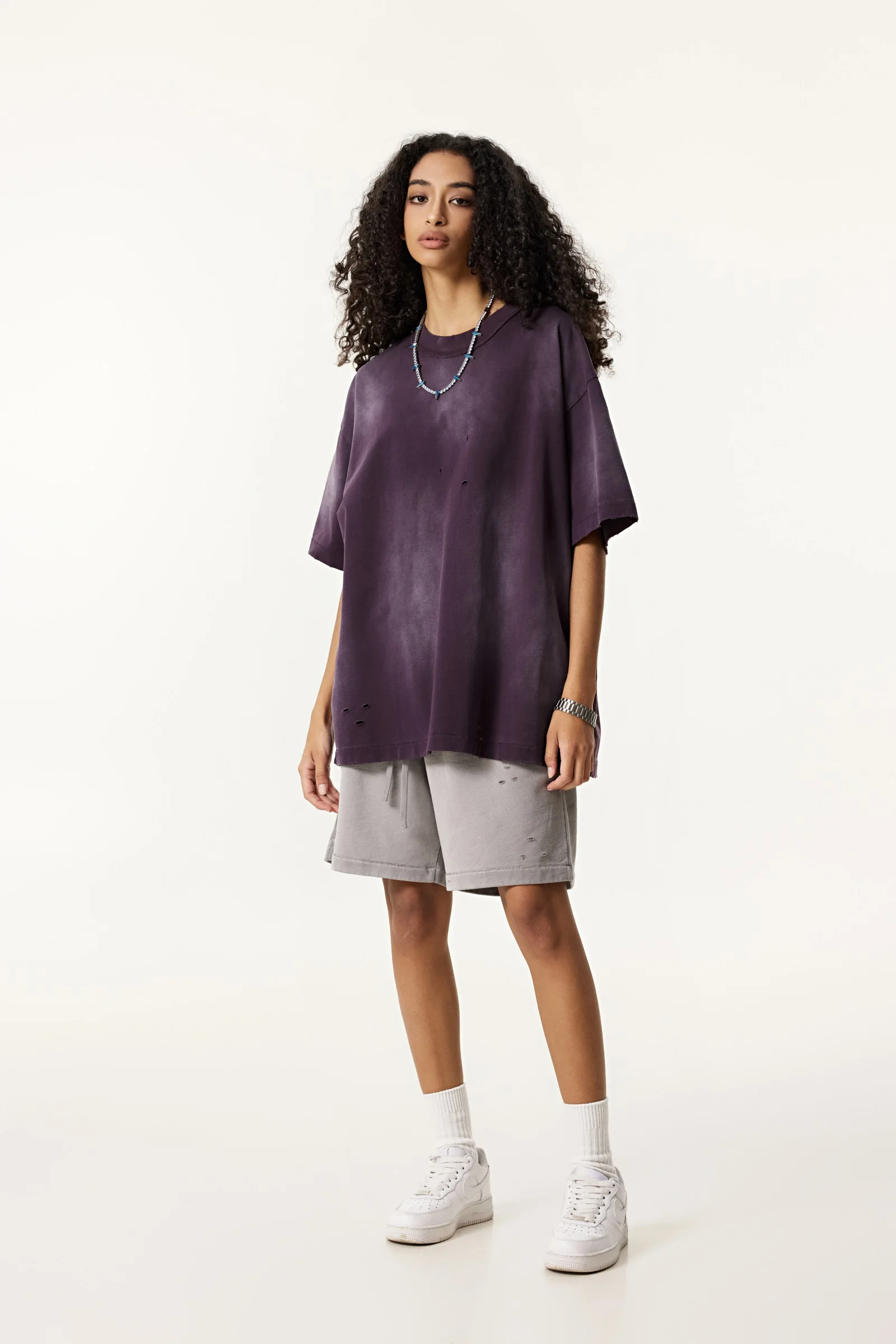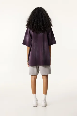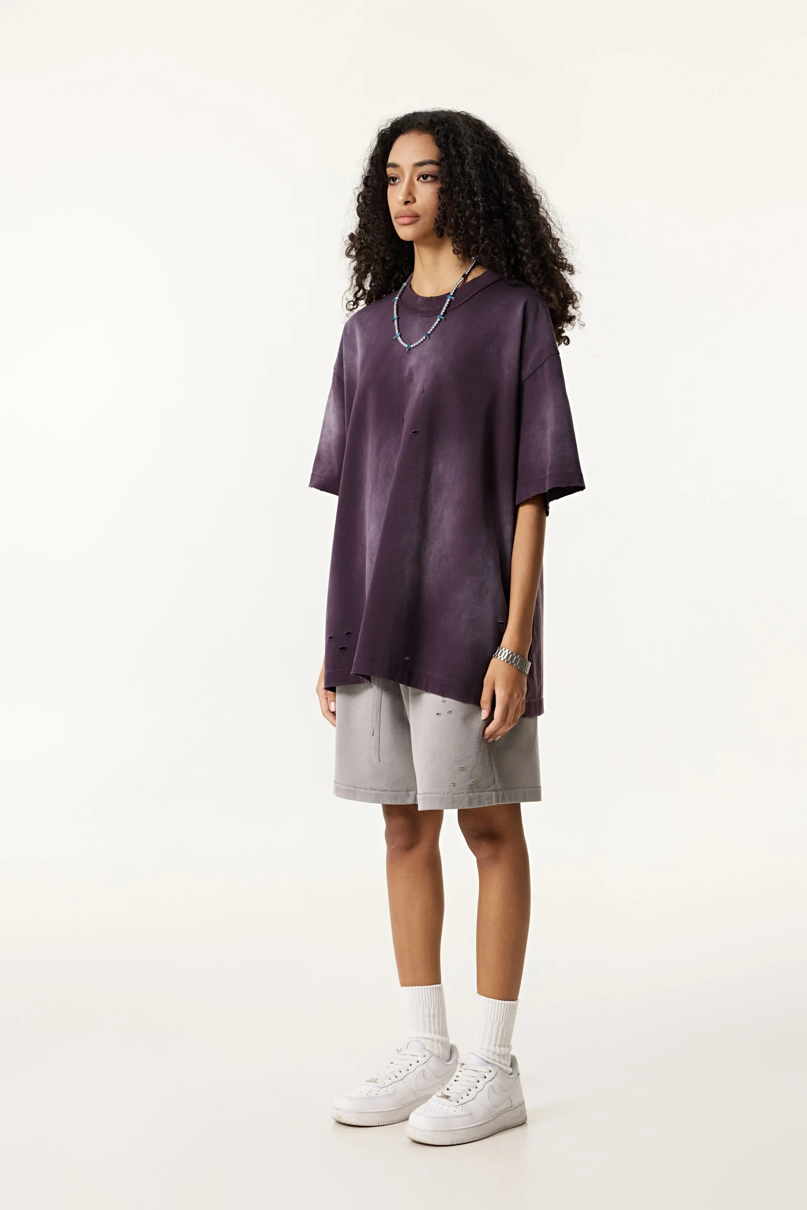 285GSM Women's Monkey-Wash PP Spray Ripped Raw-Edge Short Sleeve T-shirt