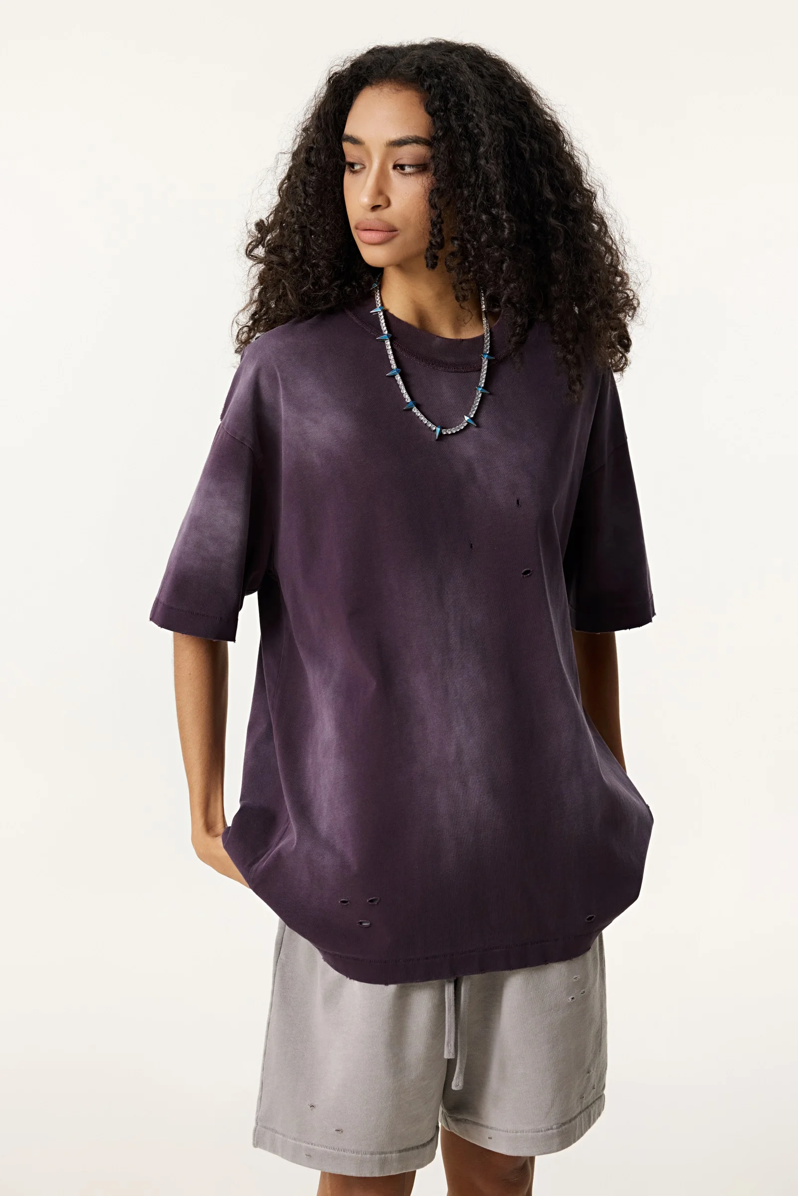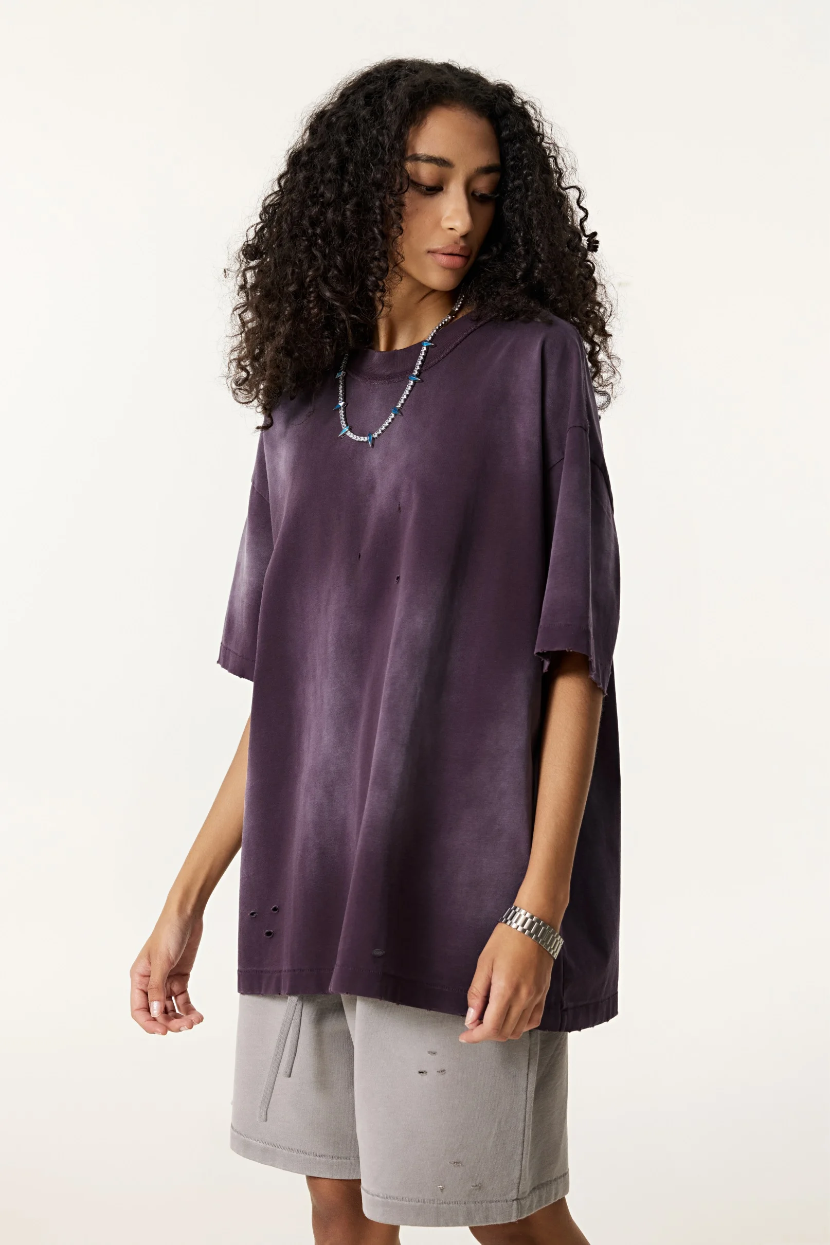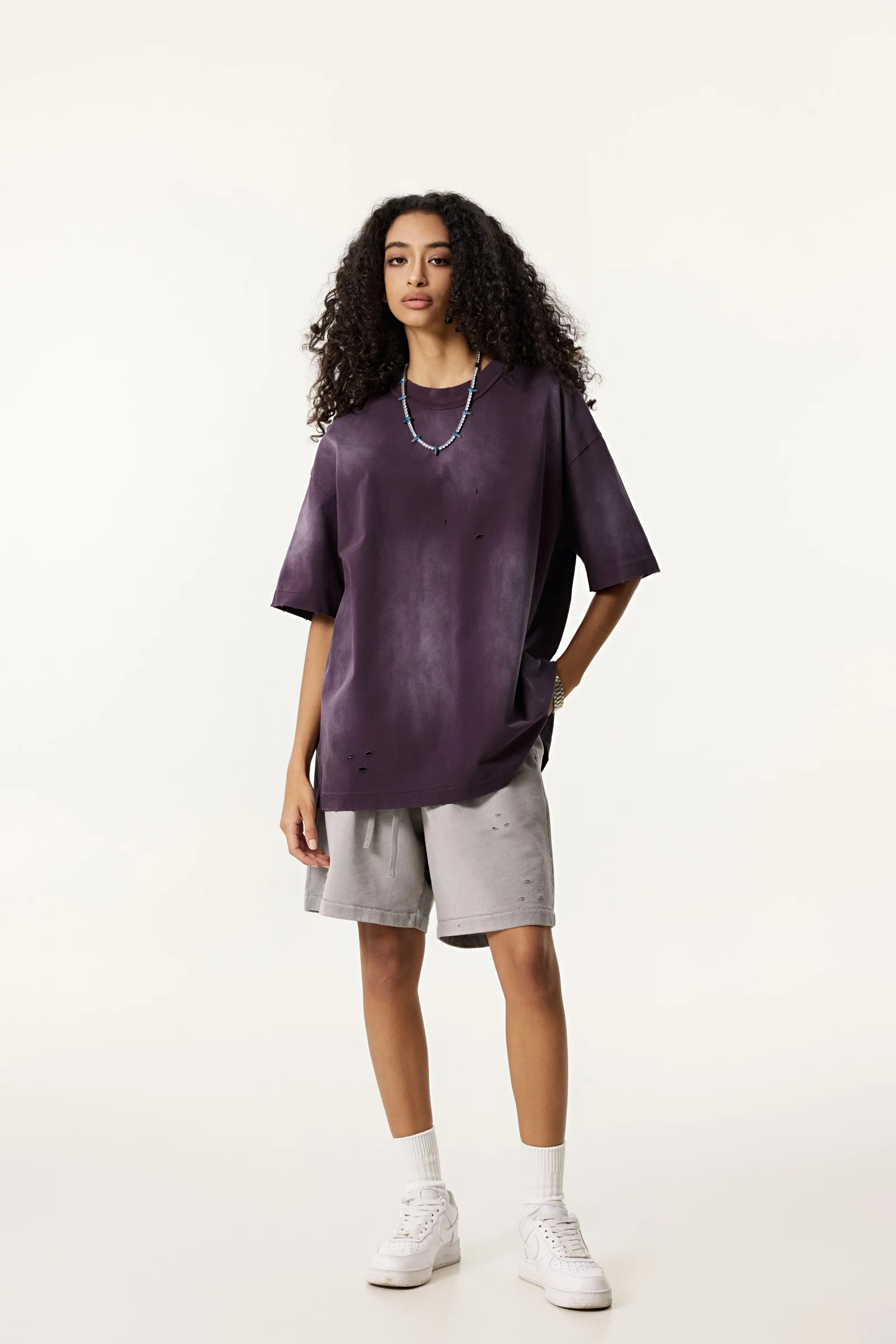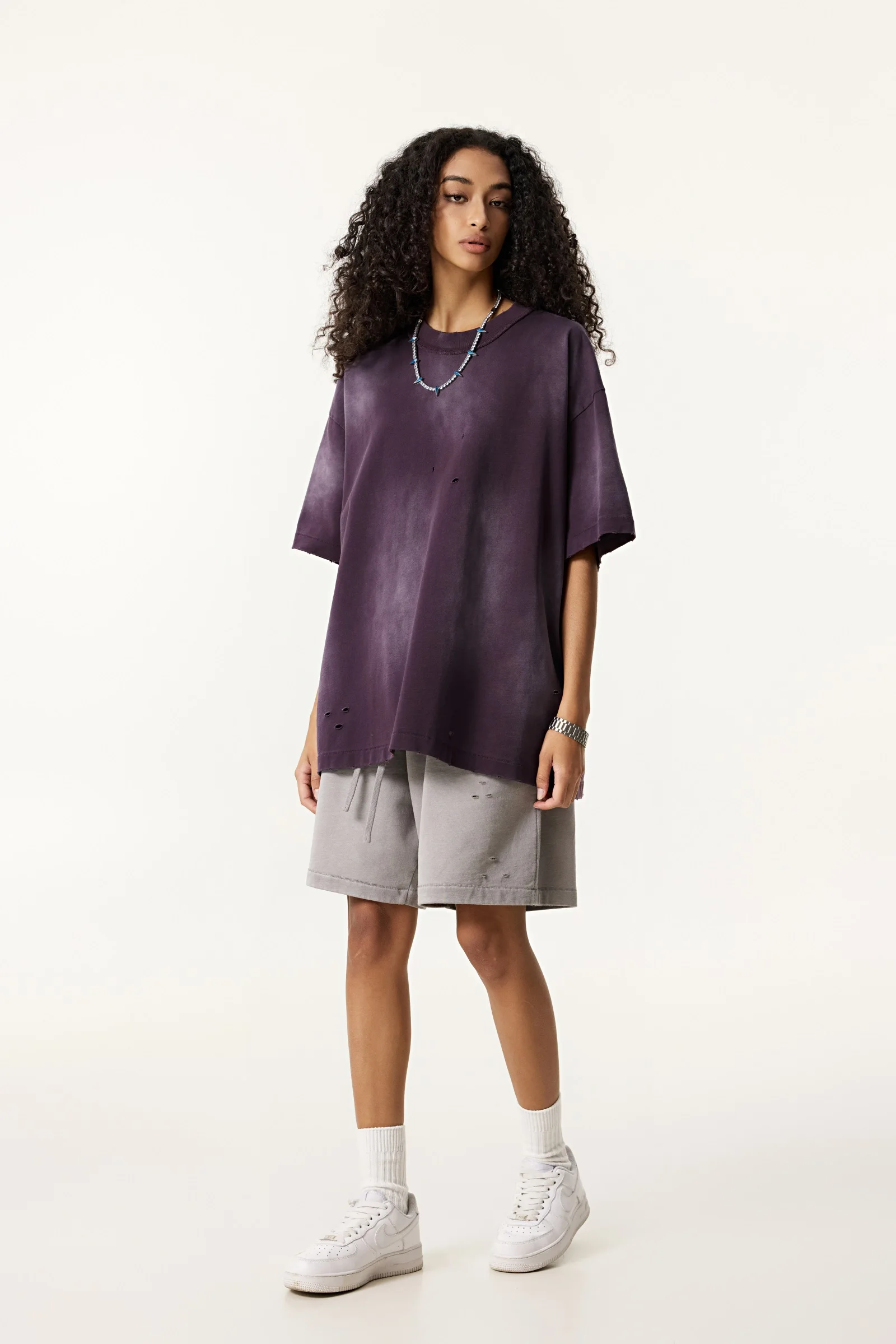 285GSM Women's Monkey-Wash PP Spray Ripped Raw-Edge Short Sleeve T-shirt