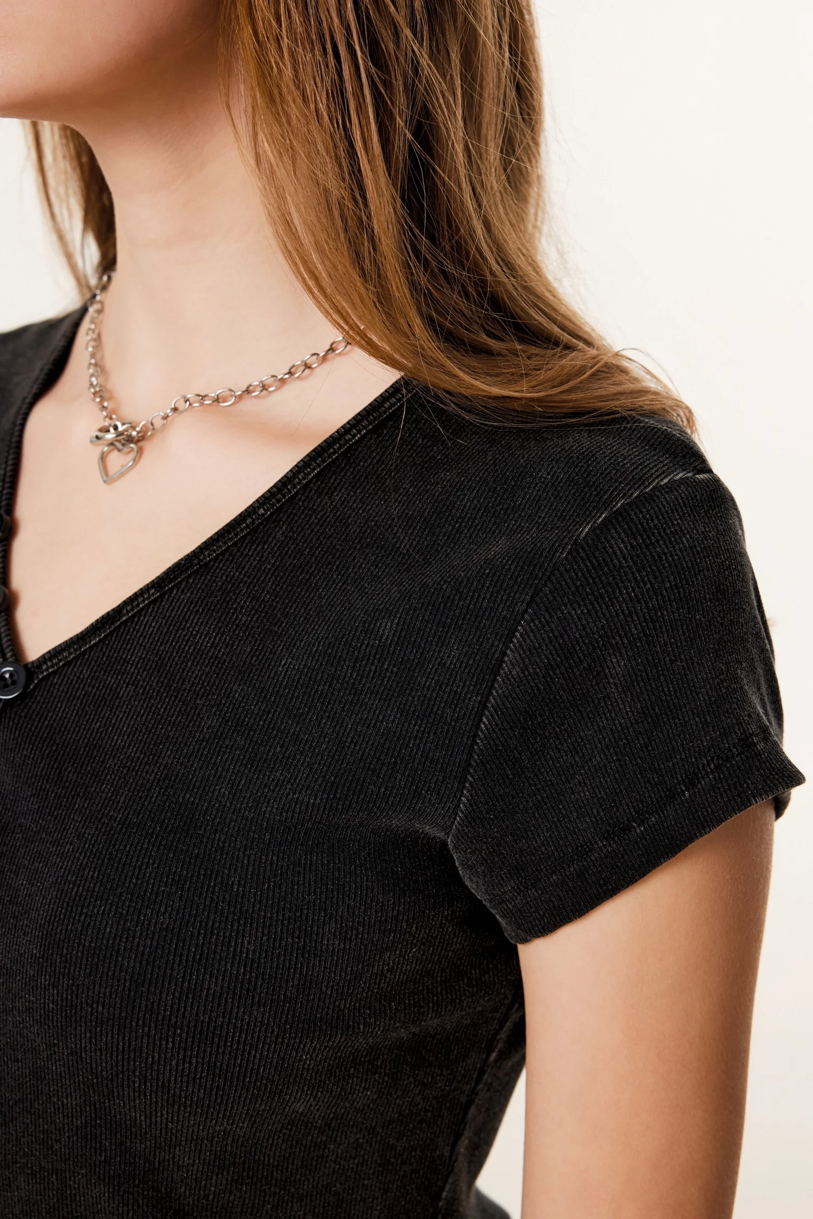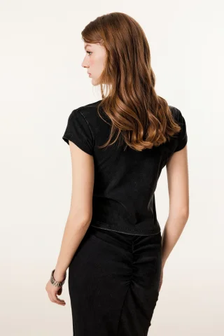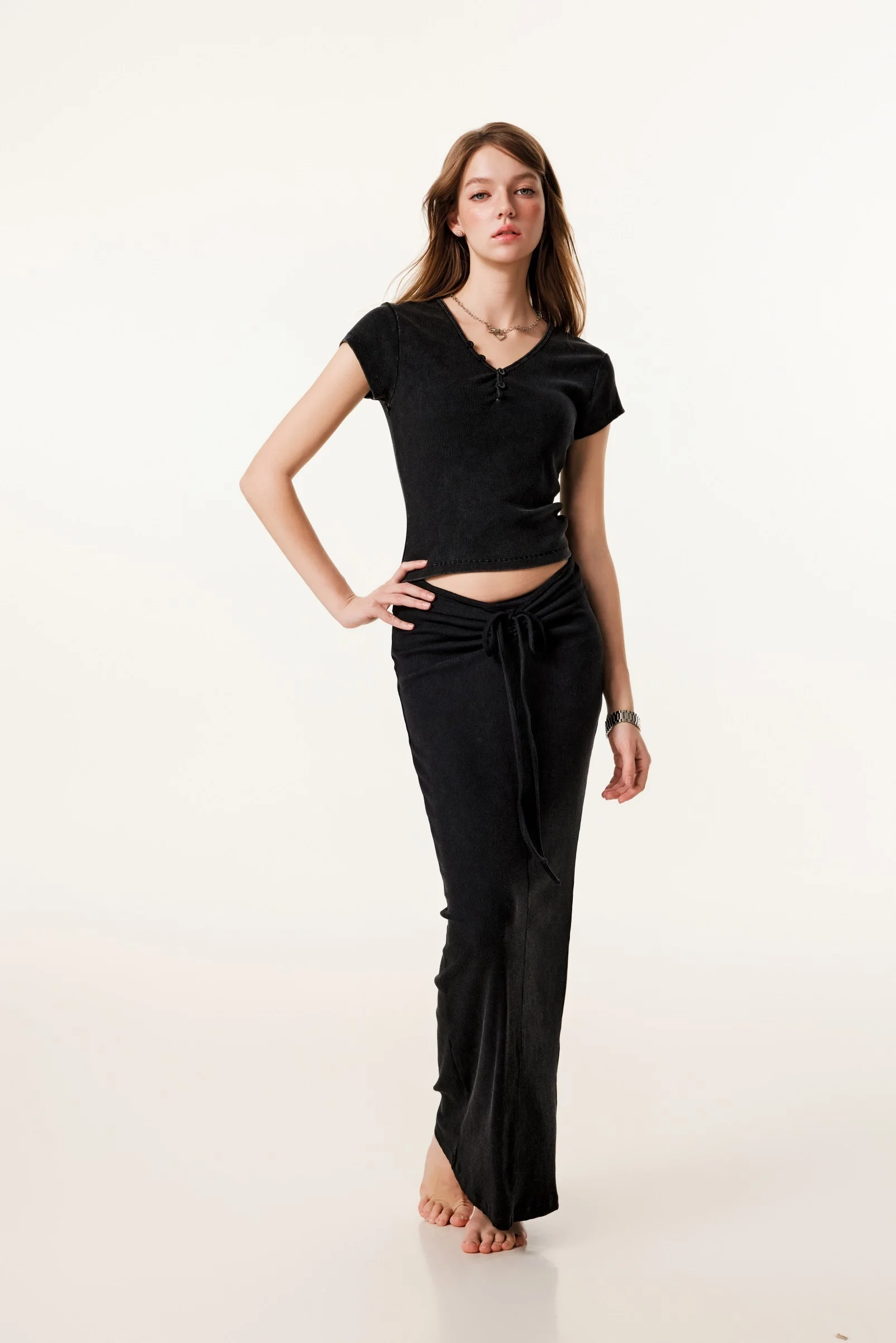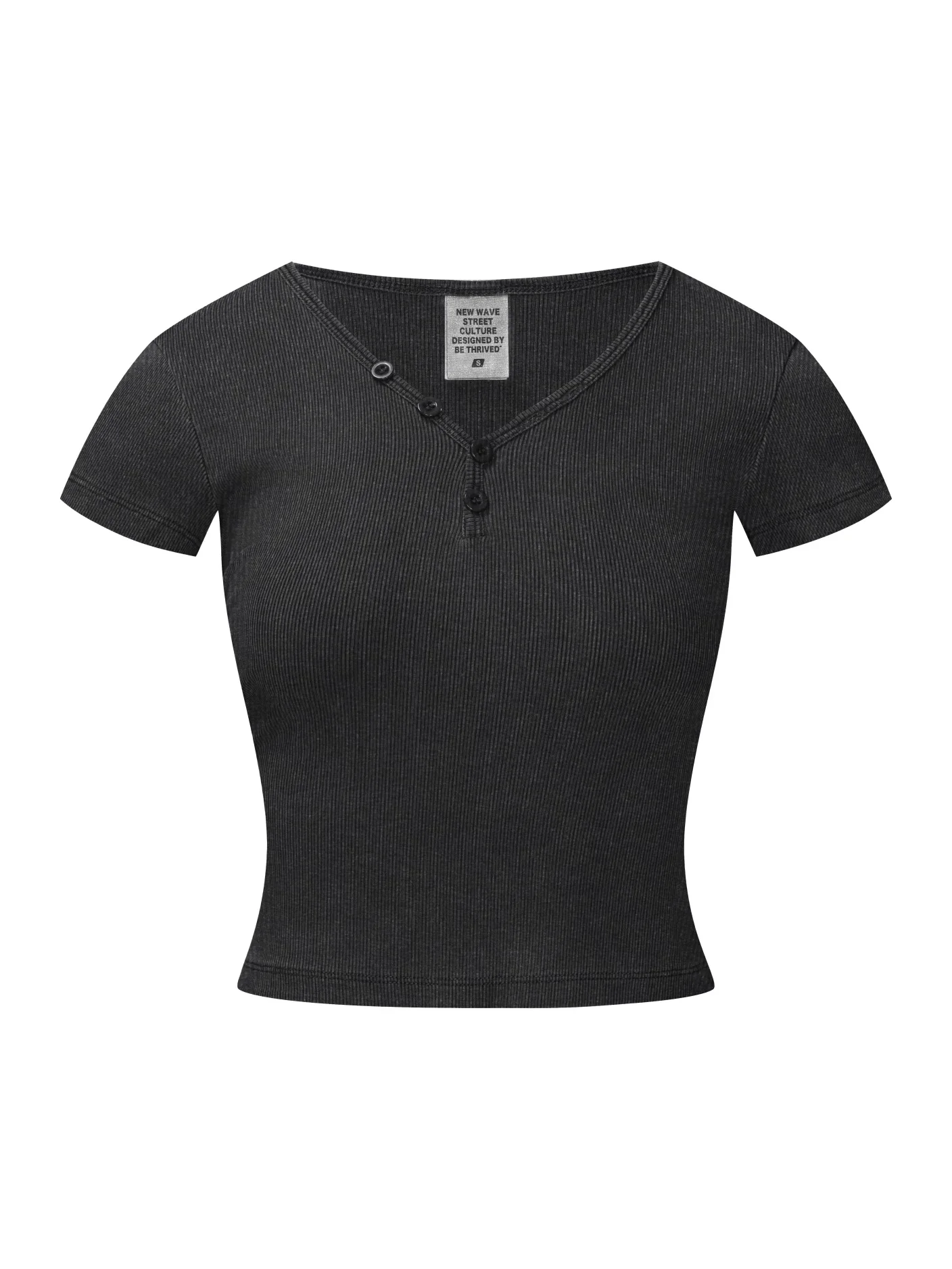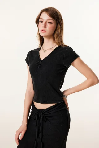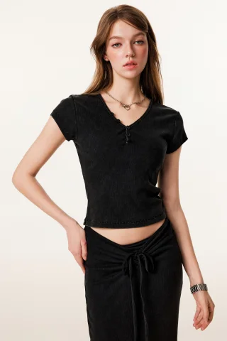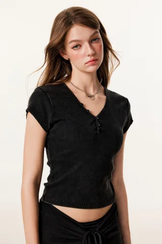 Made with a 275GSM natural fiber cotton blend that stays soft, smooth, and comfortable after repeated washing. V neck front with button detailing enhances the neckline and offers a clean, body shaping fit. Reinforced stitching with fine 12 stitches per inch provides durability and a polished finish. Completed with a vintage wax wash that creates natural fading and unique retro texture—ideal for lightweight daily wear and matching set styling.a