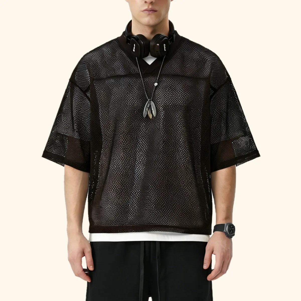 240GSM Men’s Boxy-Fit Mesh Layering V-Neck Essential Short-Sleeve T-Shirt
