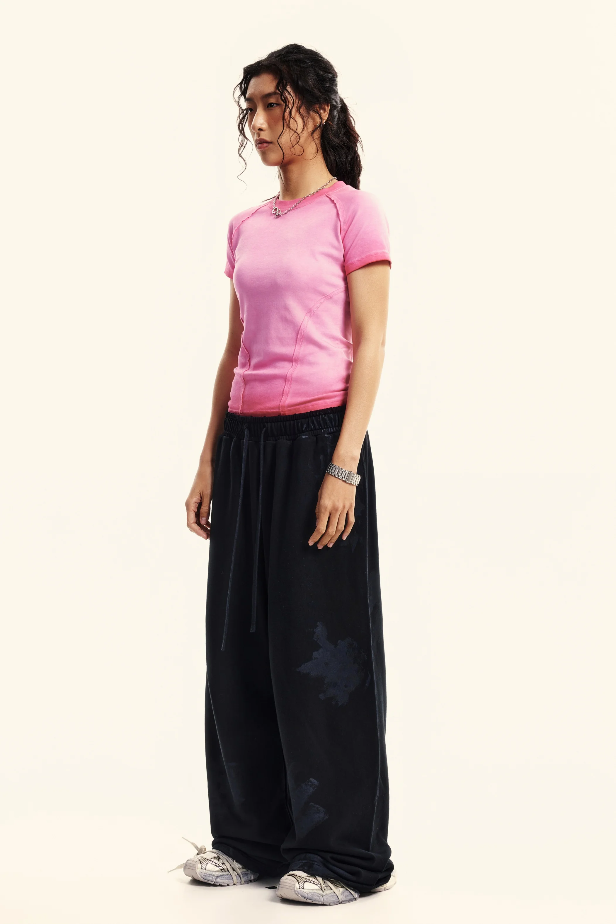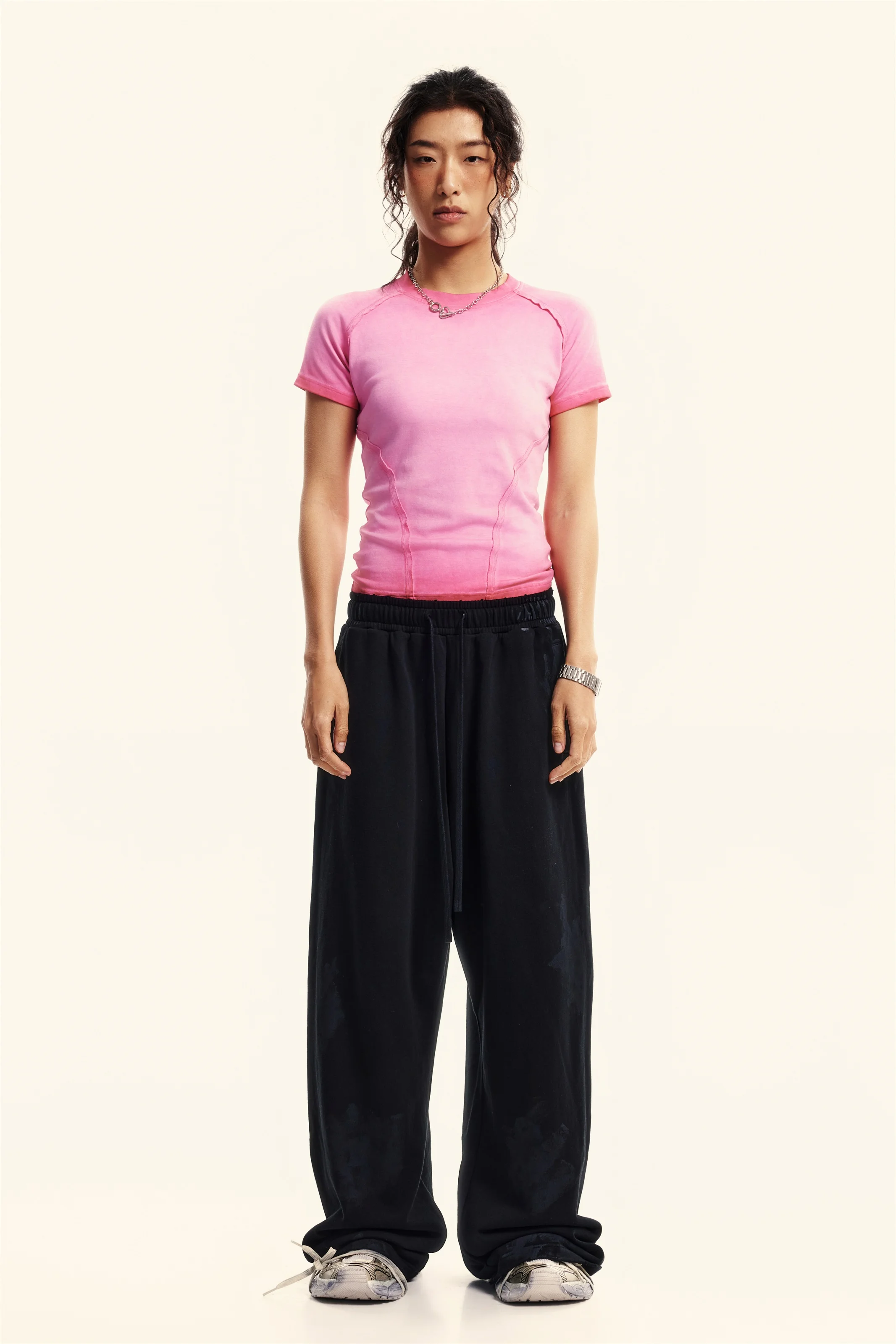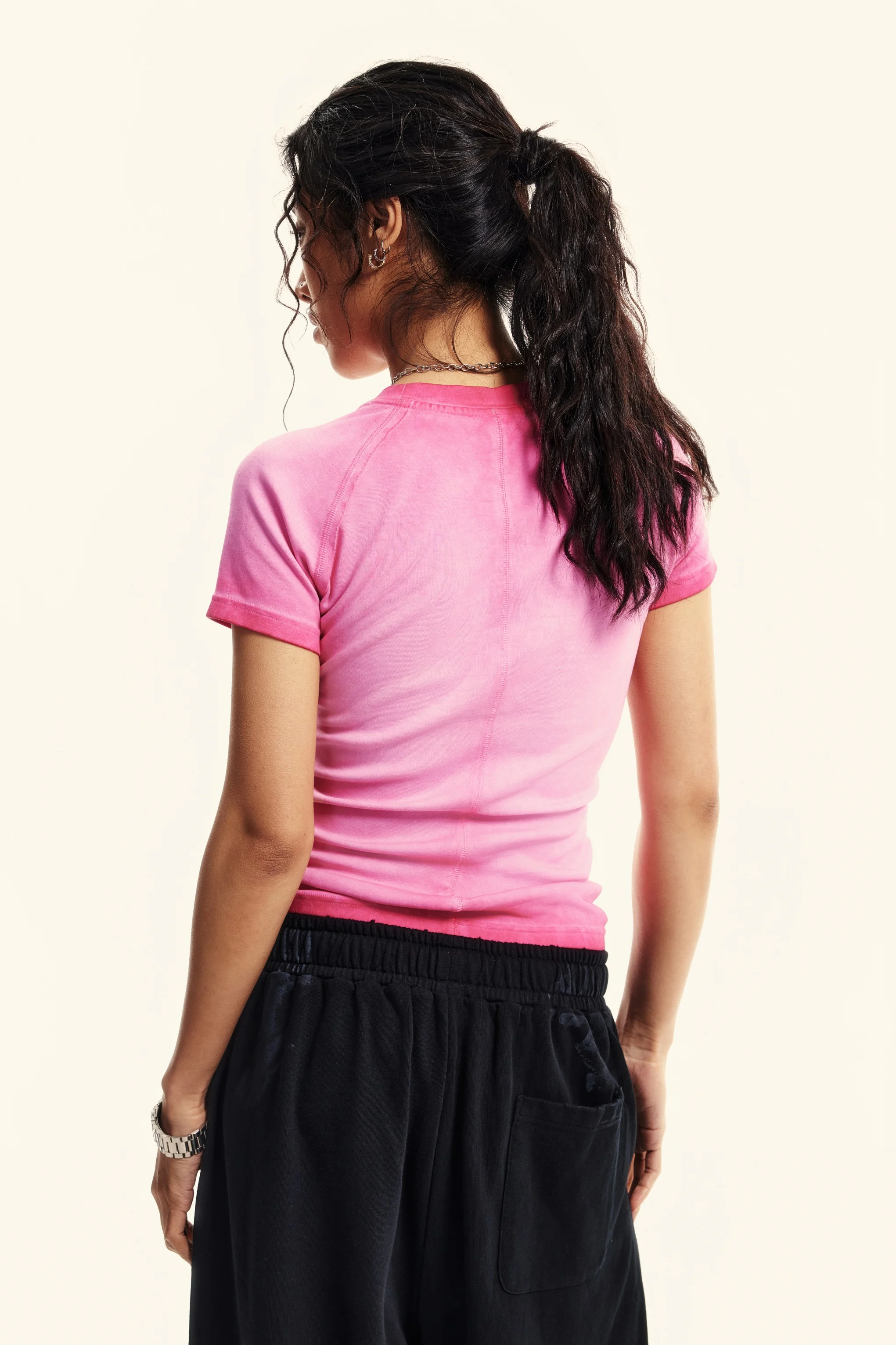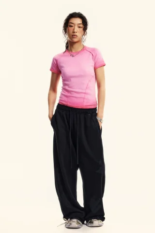 Made with 220GSM high-stretch cotton blend (97% cotton, 3% polyester) for all-day comfort and shape retention. Vintage washed finish creates a naturally faded look that evolves with wear, giving each piece a unique worn-in character. Slim-fit design with back panel shaping highlights shoulder blades and body curves. Raw edge stitch detailing adds visual interest while enhancing silhouette. Perfectly styled with shorts, skirts, or our signature pants for a bold retro-inspired look.
