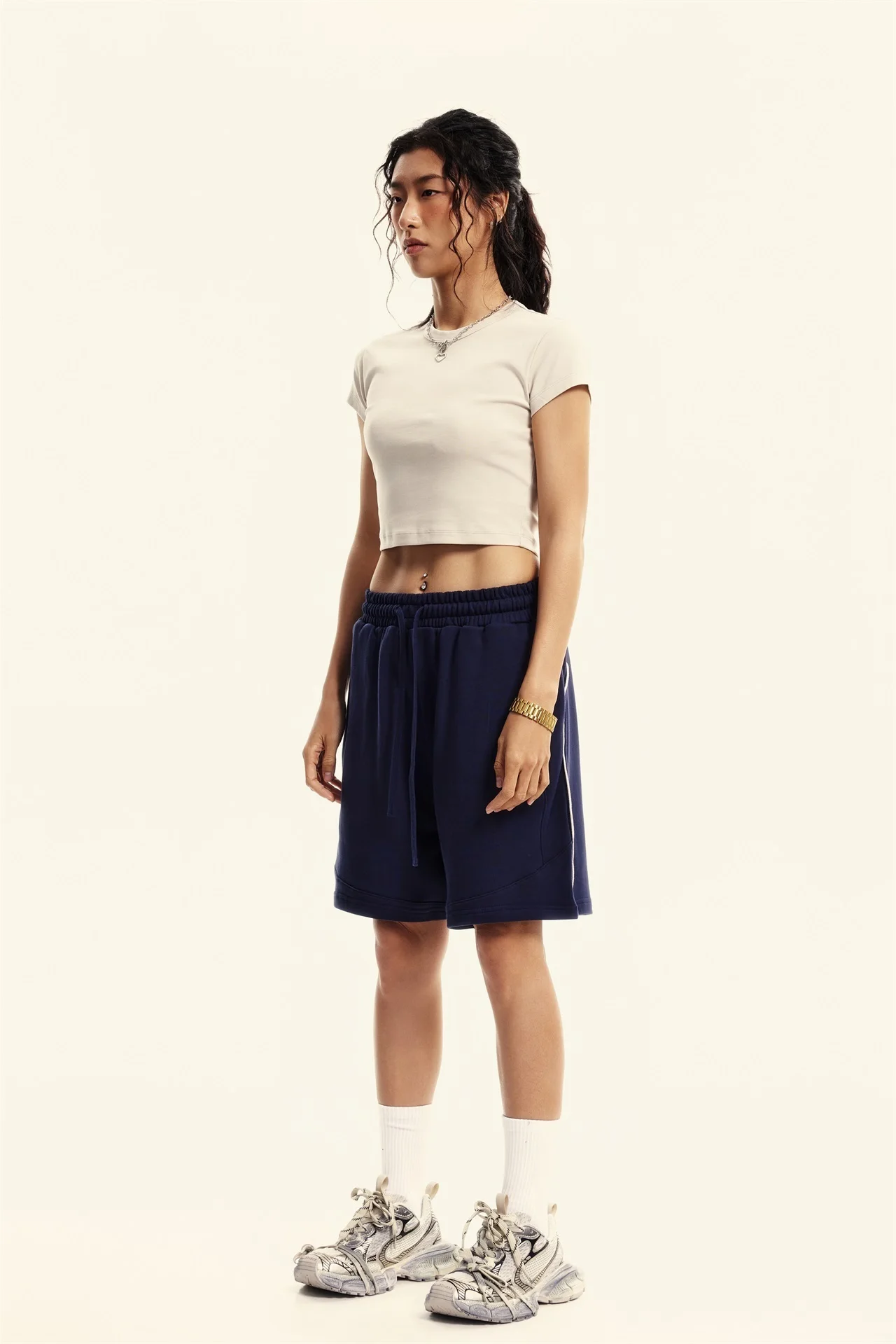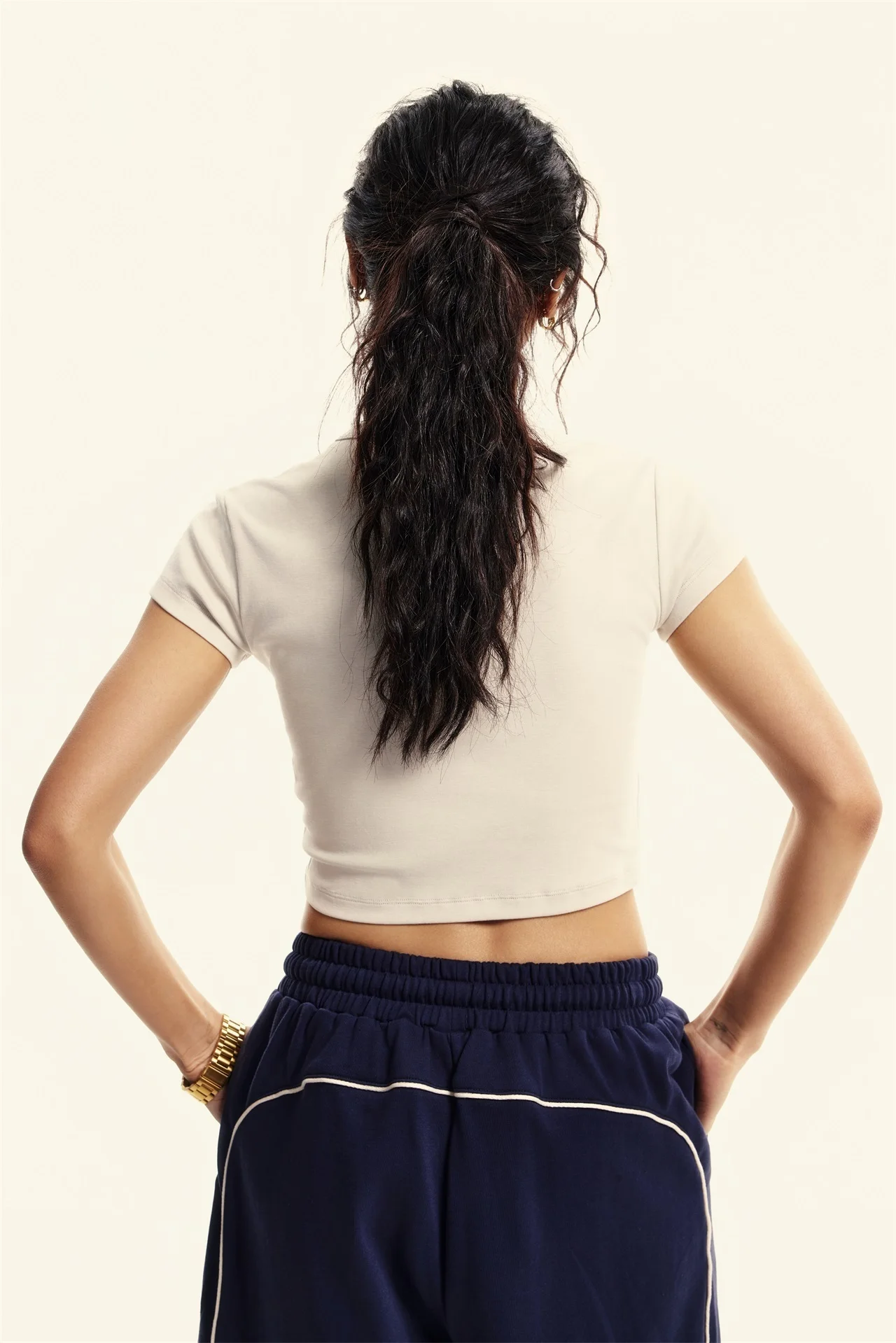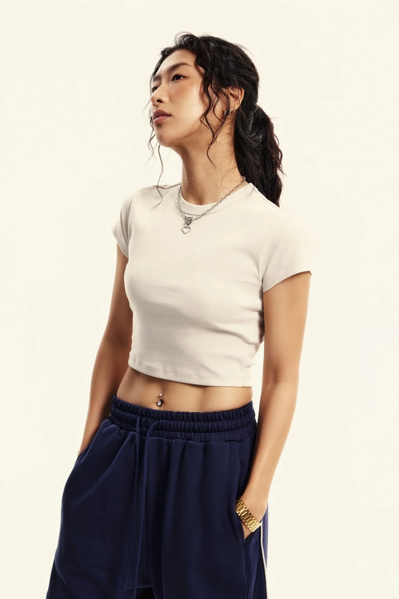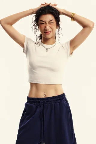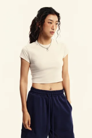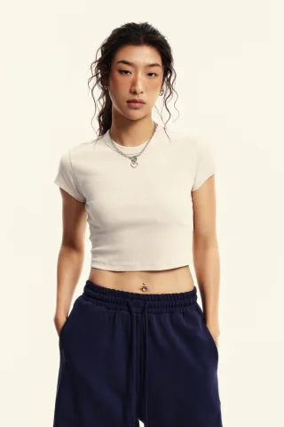 Made with 235GSM cool touch stretch cotton for a soft, breathable, and highly flexible fit. Washed finish with subtle snow fading creates a natural worn in look, enhancing the vintage character of the style. Slim cropped silhouette with gathered waist shaping highlights the midsection while subtly covering the lower abdomen. Back panel contouring accentuates shoulder blades for a flattering upper body line. Neckline and armholes are bound with self fabric for a clean finish and long lasting structure. Curved hem adds design value and visual balance. Offered in dopamine inspired colors that deliver an energetic, mood boosting aesthetic. Perfect for pairing with shorts, skirts, or parachute pants.