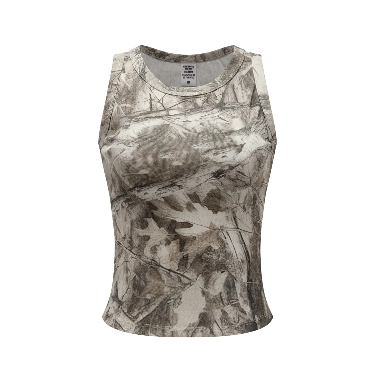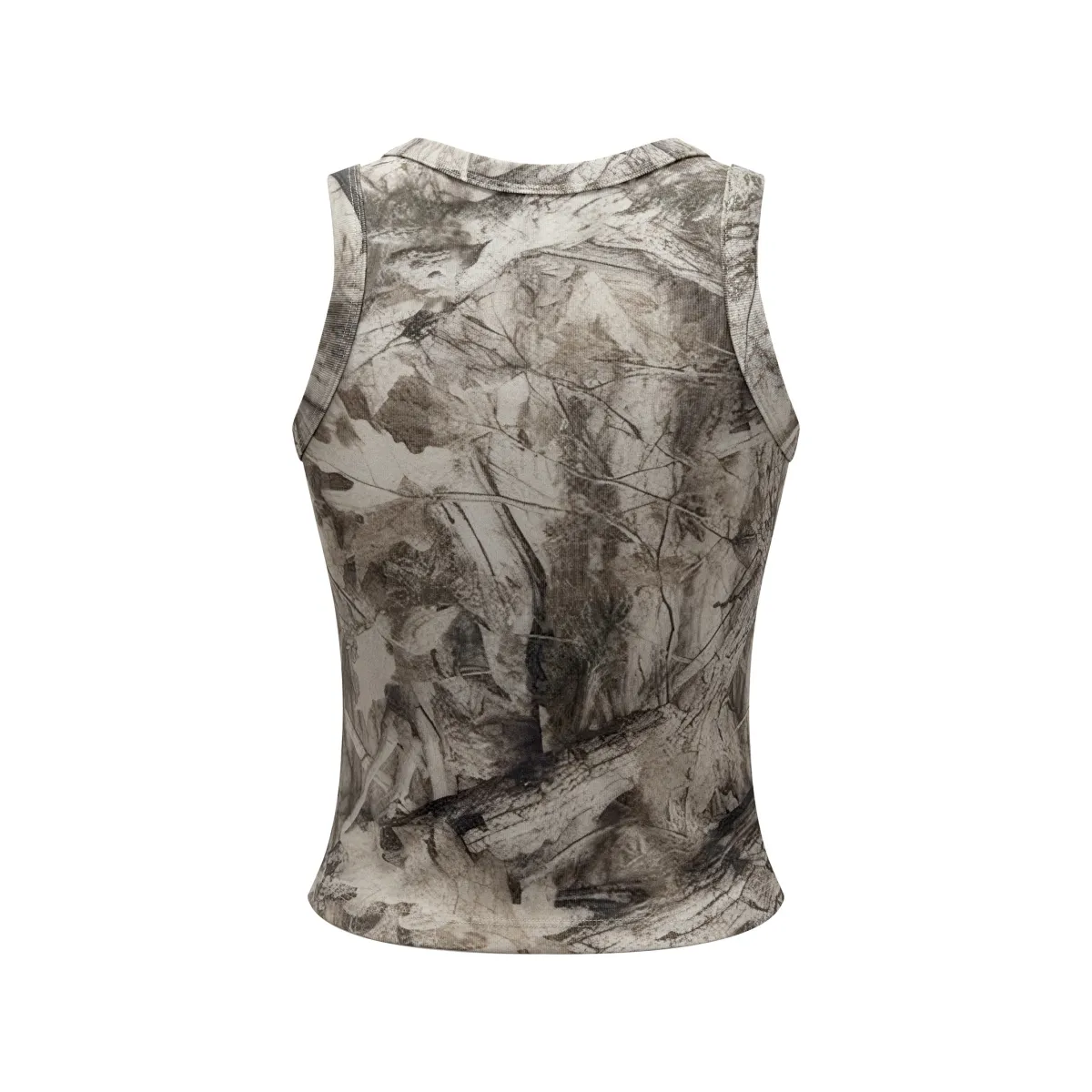 Made with 315GSM high-density rib fabric offering strong elasticity, recovery, and all-day comfort. Racerback cut defines shoulder and back lines for a clean, slimming athletic look. Self-fabric binding at the neck and armholes enhances durability and prevents deformation. Camo pattern uses heat-transfer printing for crisp details and long-lasting color fastness. Slim-fit contour with subtle waist shaping highlights the upper-body curve without restricting movement. A versatile street-sport piece that pairs easily with high-waist bottoms, cargo pants, or leggings.